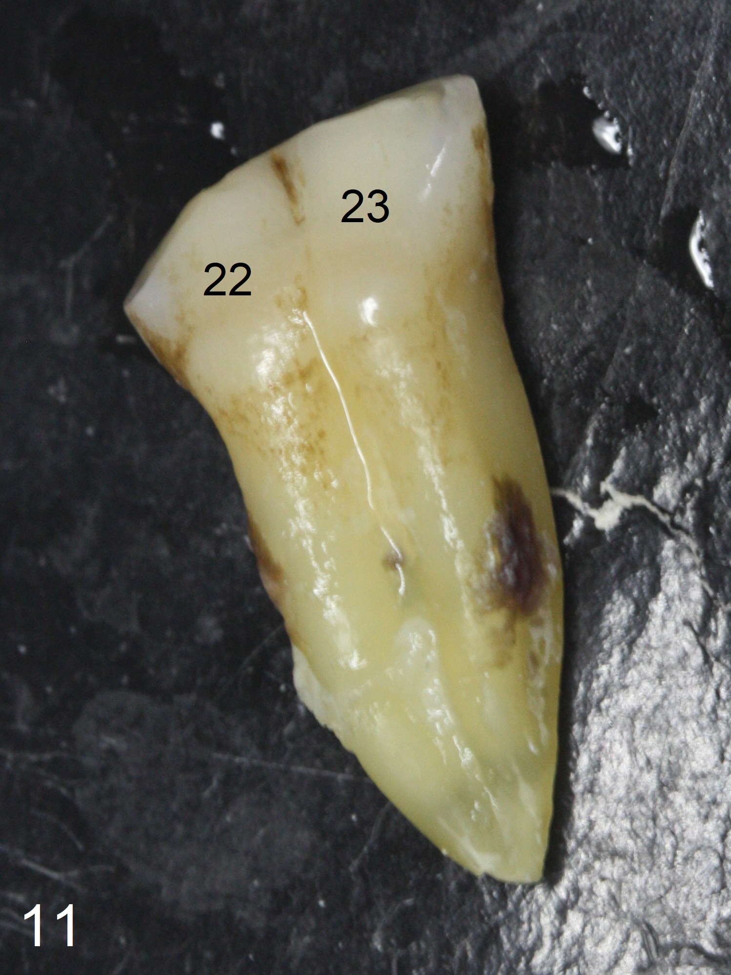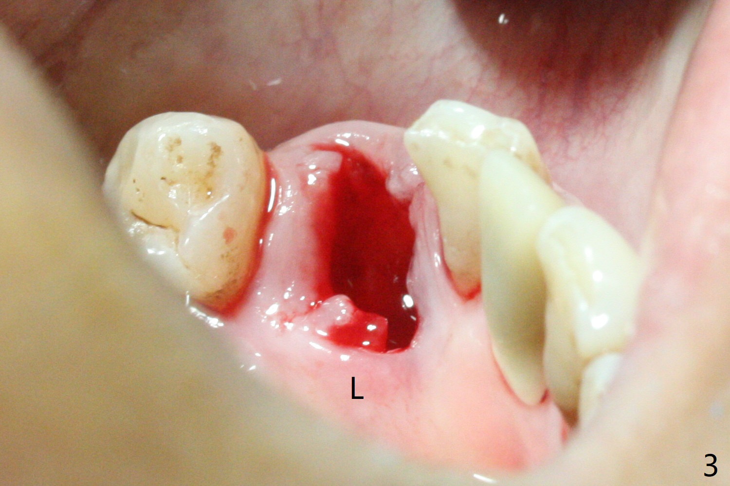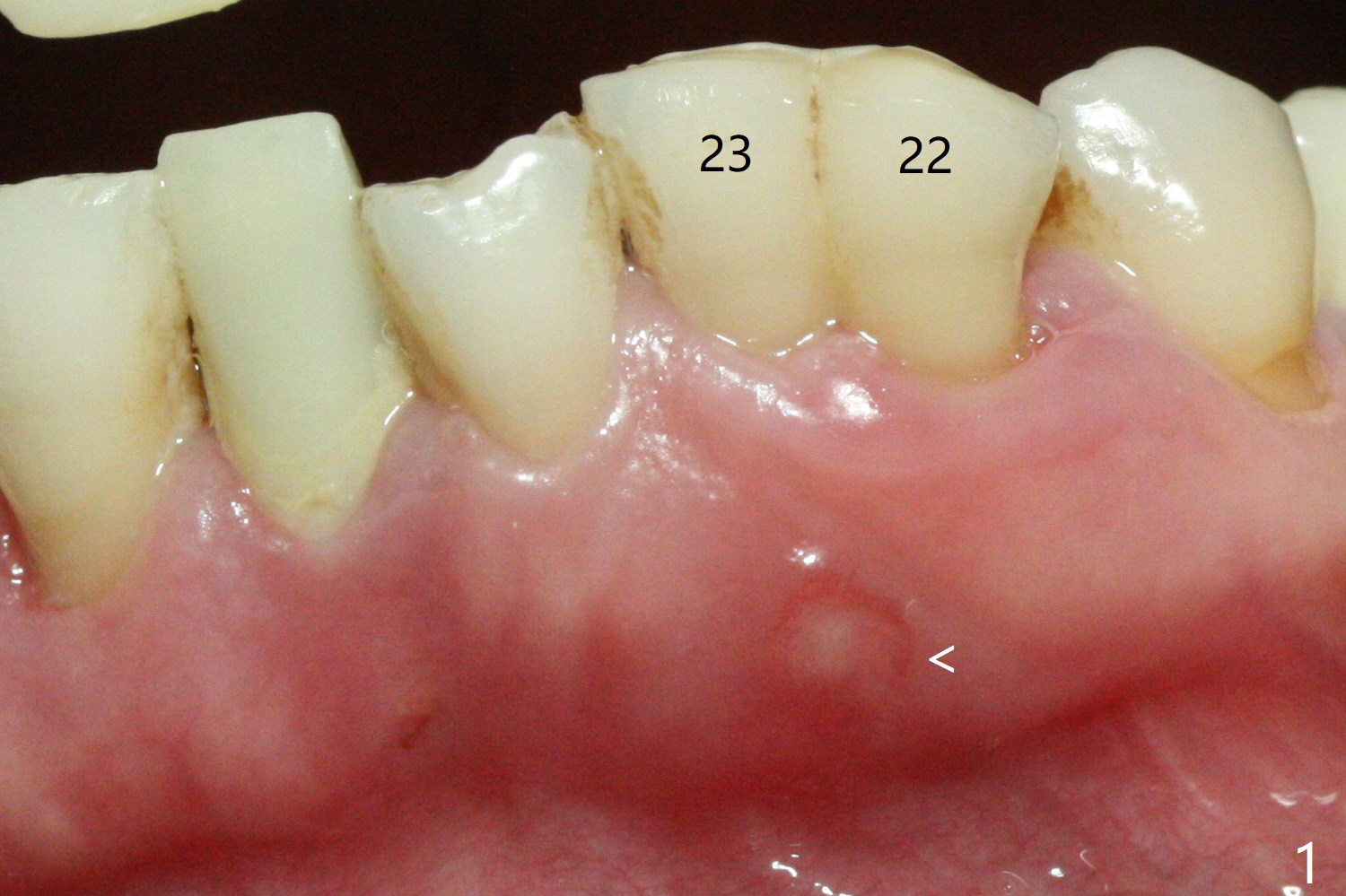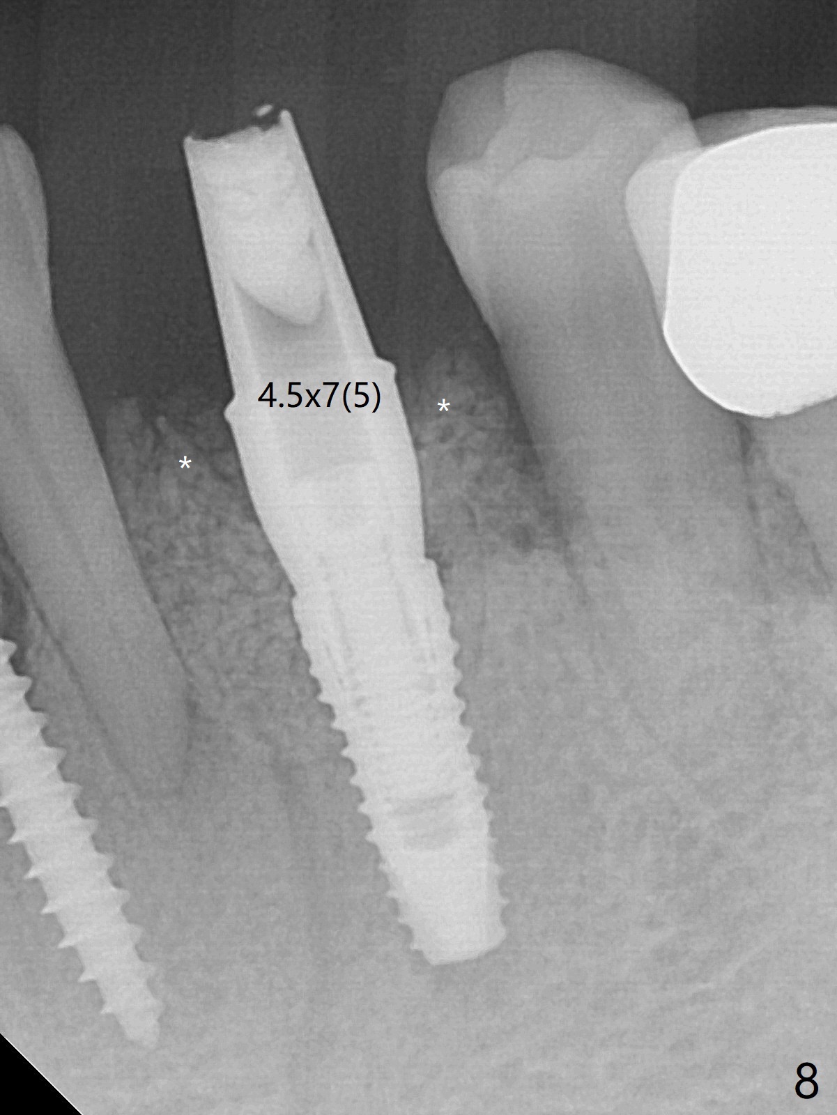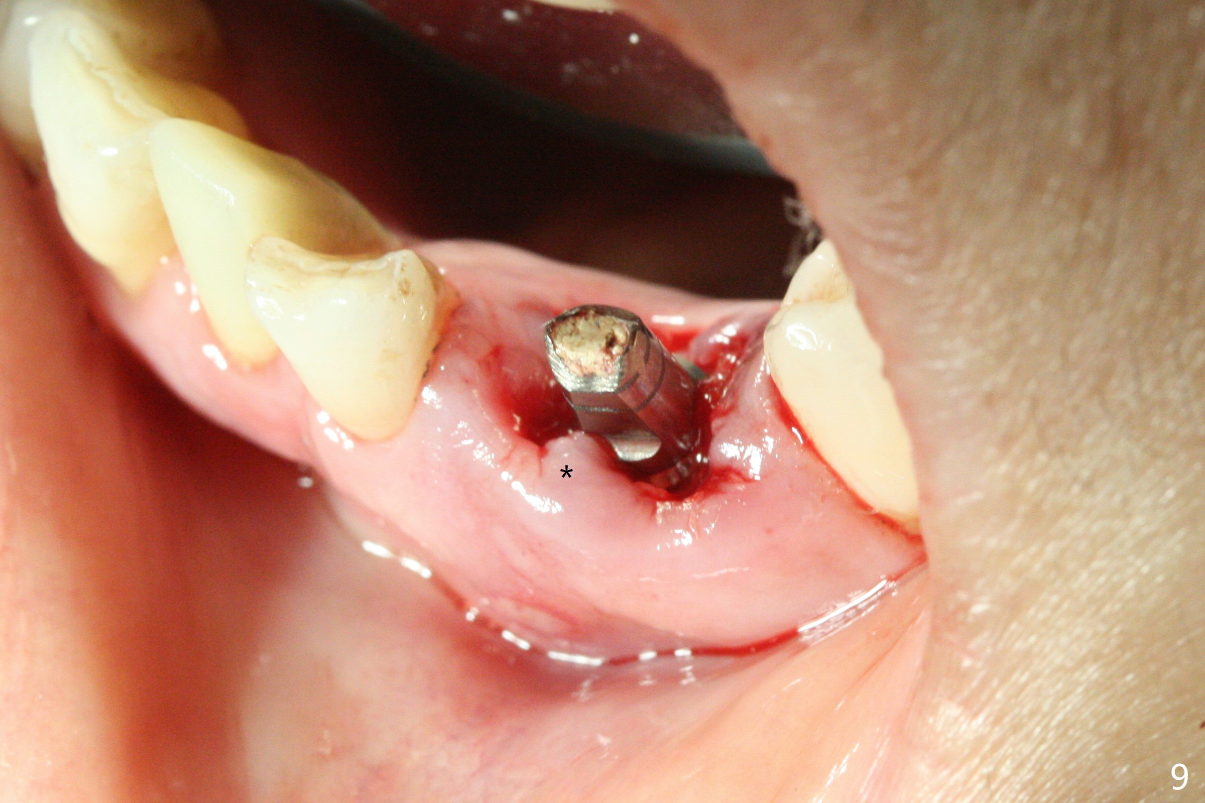 There is a fistula buccal to the apex of the tooth #23 preoperatively (Fig.1), which is related to loss of the buccal plate of the socket of #23. Therefore an implant is placed mainly in the socket of #22 (Fig.3). The lingual (Fig.2 L) gingiva appears to have more extensive inflammation. After extraction, the lingual (Fig.3 L) gingival margin is significantly lower than the buccal one. The lingual crest is ~ 4 mm lower than the buccal one. A 3.8x10 mm dummy implant is placed tentatively with an apical space (Fig.4). When a same dimension definitive implant is placed with 40 Ncm, it is 2 mm below the lingual gingival margin, whereas 6-7 mm below the buccal one (Fig.5). Vanilla graft is placed before placement of a 5.5x4(5) mm abutment (Fig.6,7). There is a 2-3 mm lingual (L) gap to be filled with the allograft secondarily to prevent periimplantitis (Fig.7). Later the abutment is changed to a longer and smaller one (Fig.8) with more of the allograft (*). After trimming of the abutment (Fig.9 (*: papilla between the fused teeth)), an immediate provisional is fabricated to close the socket (Fig.10, similar to Fig.1). The majority of the bone graft seems to be in place 8 months postop (Fig.12). The implant appears to have been placed buccal, consistent with the thin and slightly erythematous buccal gingiva (Fig.13). The ridge completely regenerates 2 years post cementation (Fig.14).