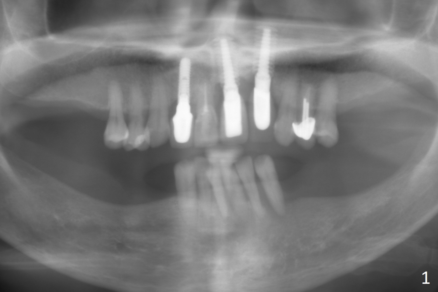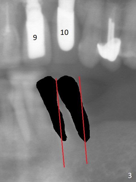 A 71-year-old woman is skinny with multiple missing teeth (Fig.1). Our final plan is to establish premolar occlusion. The first aim is to place implants at #22 and 23 with severe mobility and gingival recession (Fig.2). The latter is most likely due to traumatic occlusion from #10 implant crown. Pay attention to occlusion while an immediate provisional is being fabricated. After extraction, trajectory should be set up as shown by red lines in Fig.3. Initiate osteotomy in the middle of the sockets (buccolingually) and use the narrowest implants (2.5, 3.5 mm) to avoid the lingual plate perforation. Take preop photos to show #9,10 gingival recession.