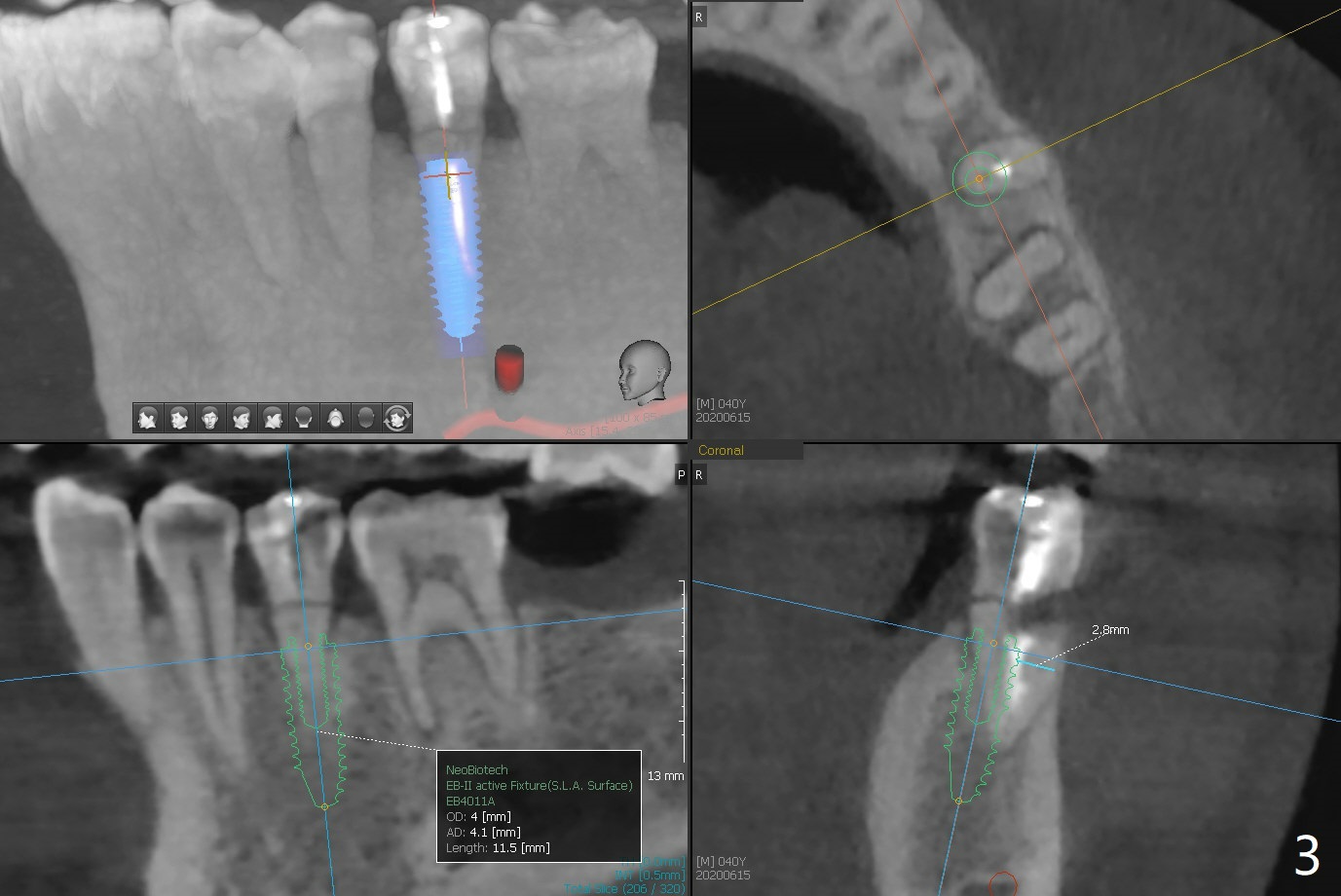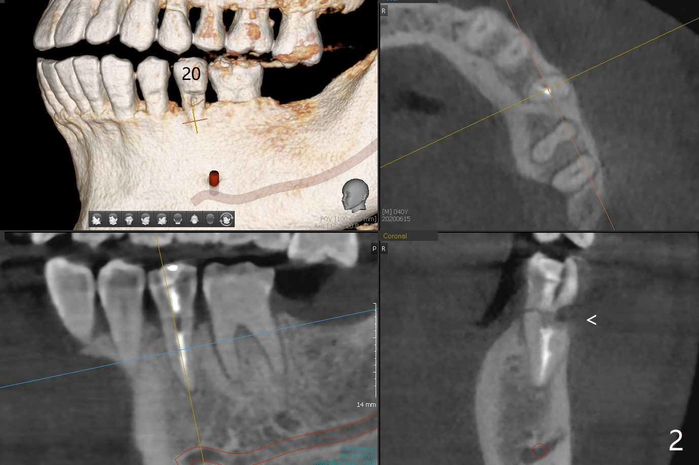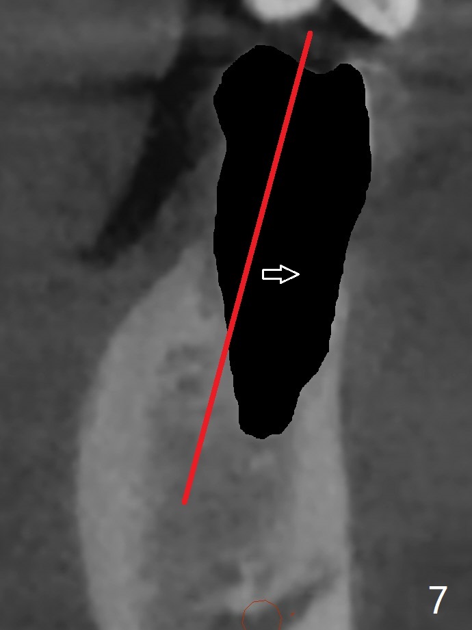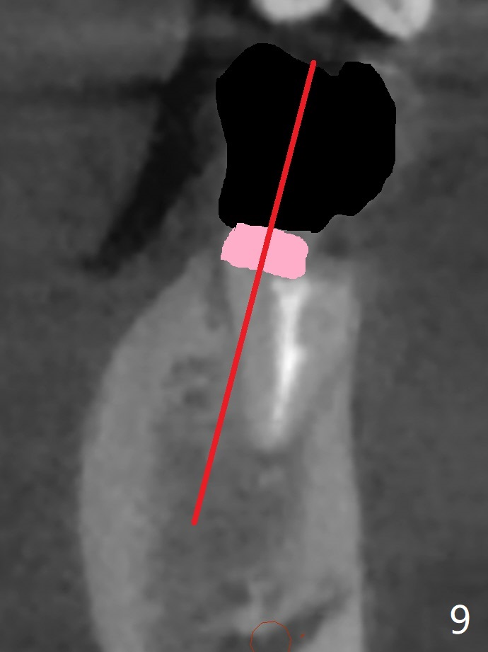 A 40-year-old man with #18 missing and #31 residual roots just fractures the tooth #20 (Fig.1). After discussion, he agrees to have implants at #18 and 20 first. To prevent buccal drifting of osteotomy and implant at #20, the implant will be placed lingual, but it does not contact the lingual plate (Fig.2-4). Traditionally, the whole tooth needs to be extracted (Fig.5,6) before initial osteotomy (Fig.7 red). The latter has tendency to drift buccal because of the lingual slope (Fig.7 arrow). To prevent the drifting, the crown of the tooth is removed (Fig.8). A guide is fabricated with 12 mm offset so that after bone trimmer (Fig.9 pink), the following drills have more contact with metal sleeve. Furthermore the drills will have less chance of buccal shifting because of the presence of the root.