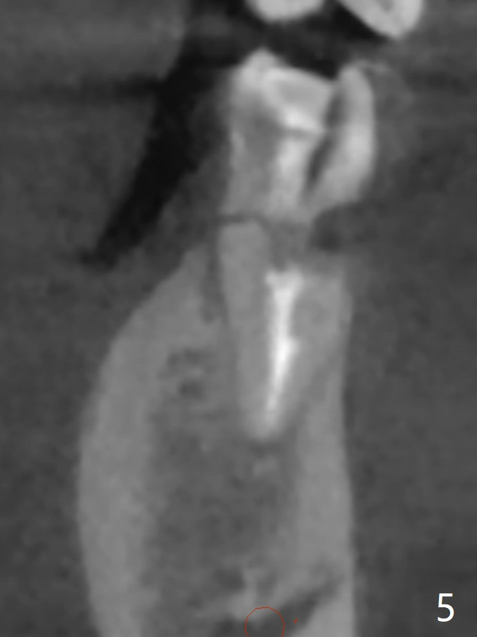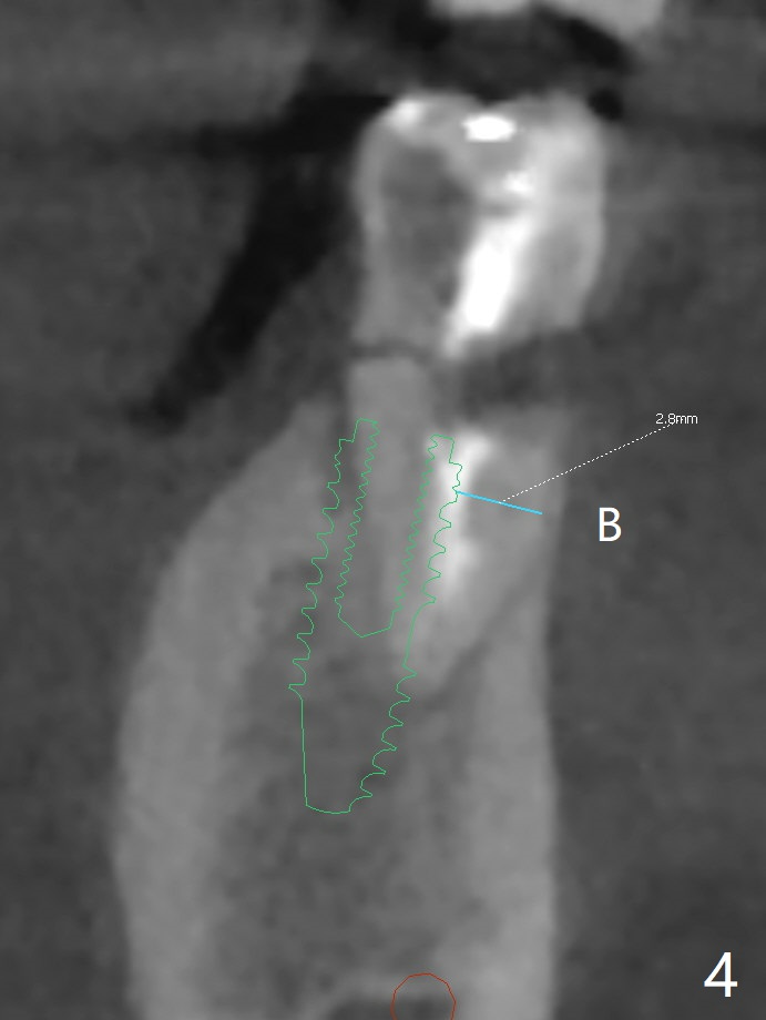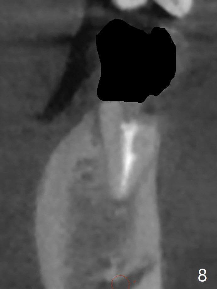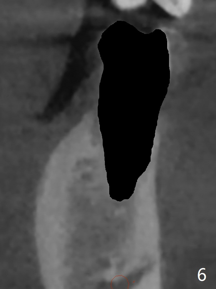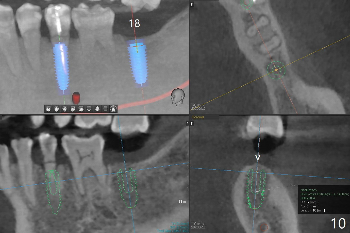 A 40-year-old man with #18 missing and #31 residual roots just fractures the tooth #20 (Fig.1). After discussion, he agrees to have implants at #18 and 20 first. To prevent buccal drifting of osteotomy and implant at #20, the implant will be placed lingual, but it does not contact the lingual plate (Fig.2-4). Traditionally, the whole tooth needs to be extracted (Fig.5,6) before initial osteotomy (Fig.7 red). The latter has tendency to drift buccal because of the lingual slope (Fig.7 arrow). To prevent the drifting, the crown of the tooth is removed (Fig.8). A guide is fabricated with 12 mm offset so that after bone trimmer (Fig.9 pink), the following drills have more contact with metal sleeve. Furthermore the drills will have less chance of buccal shifting because of the presence of the root.