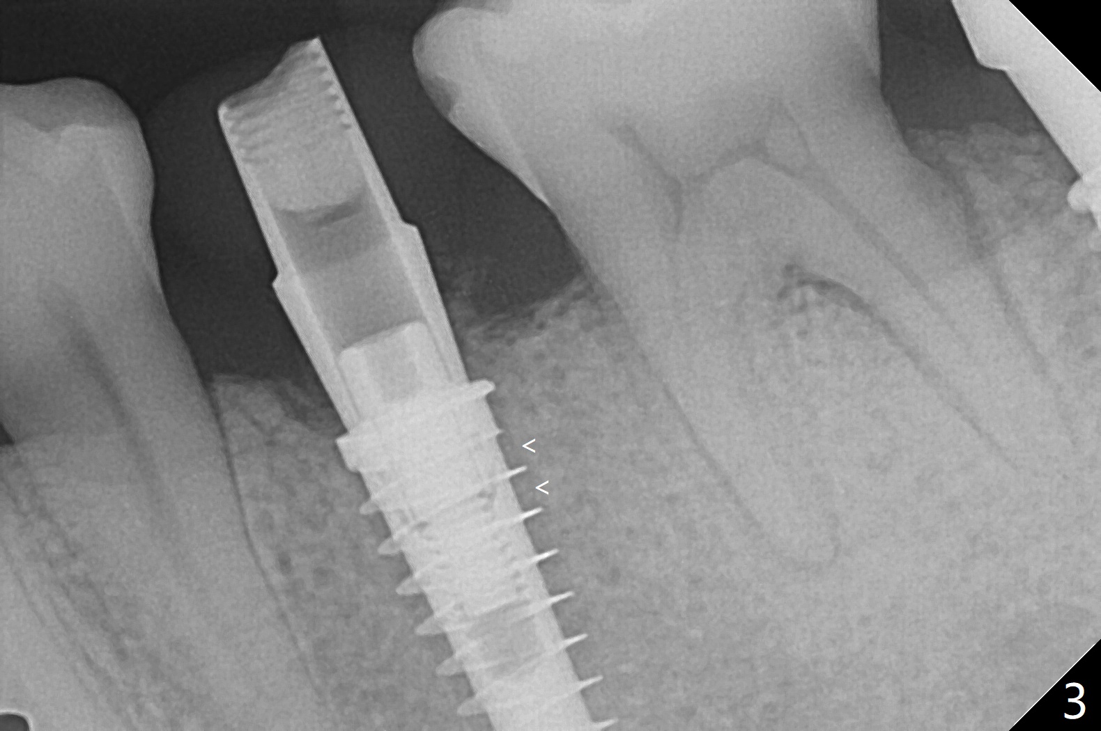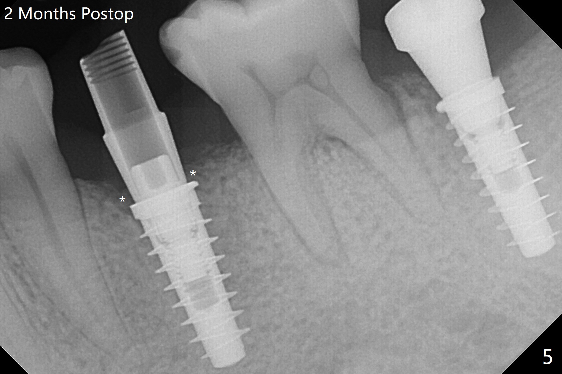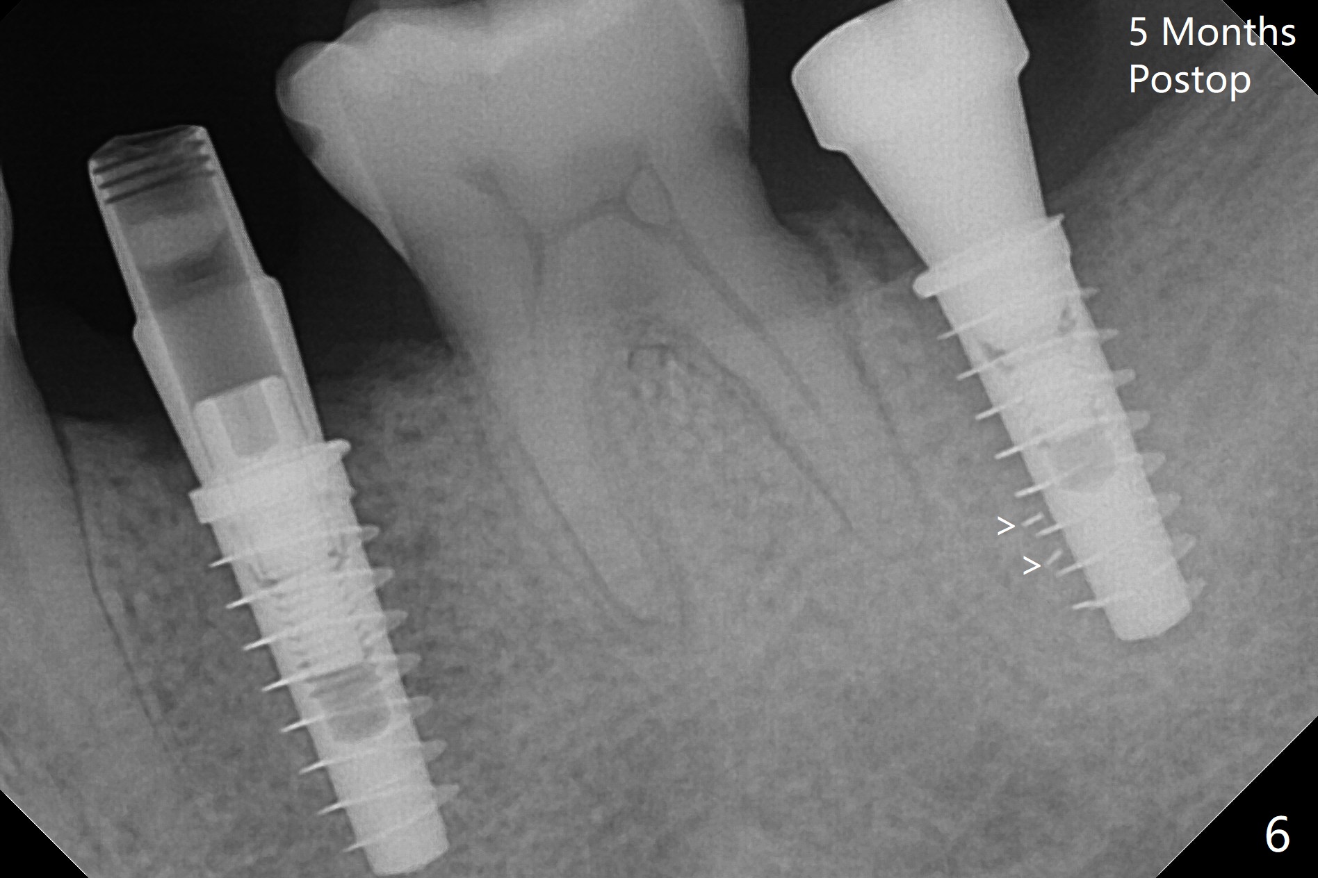 为了预防钻头遇到舌侧骨板而往颊侧偏移,有意不拔除第二前磨牙牙根。但是2.2毫米钻头钻洞很吃力,最后不得不拔除牙根,阻力骤然减少,顺利完成植入,而且颊侧间隙还够(图一,二),填入骨粉后远中螺纹间空间消失(图三箭头)。今后最后一个钻头完成钻洞后留在原位,周围放置适当量的骨粉,然后取出钻头,植入植体,这样空间可以比较全面充填。即刻种植没有颊侧偏移可能是因为设计时植体没有过多接触舌侧骨板(图四L)。第二磨牙延期种植需要切开是因为颊侧角化牙龈不足。术后两个月,前磨牙植体顶端似乎被牙槽嵴覆盖了(图五 *)。术后五个月,旋转7愈合基台,下面植体疼痛,可能与植体螺纹断裂有关(图六:>),5取模。