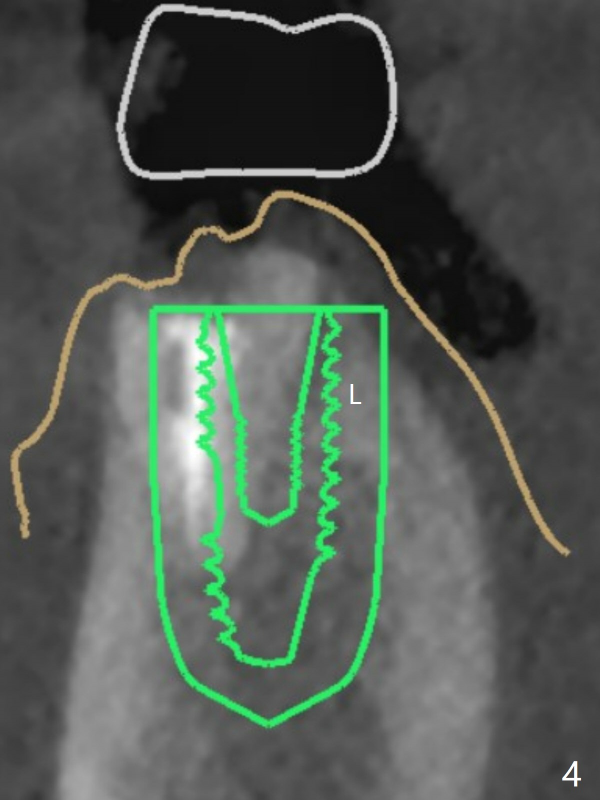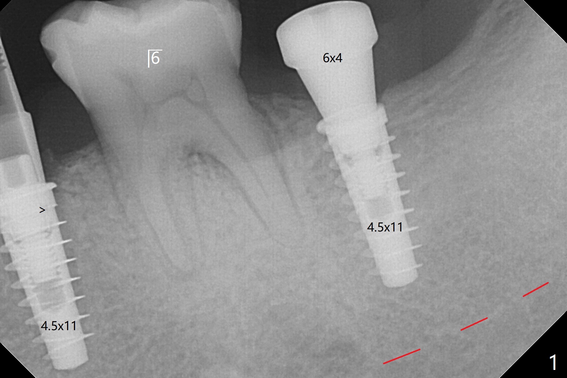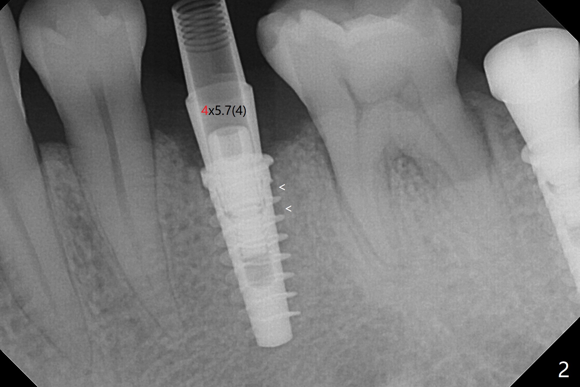 为了预防钻头遇到舌侧骨板而往颊侧偏移,有意不拔除第二前磨牙牙根。但是2.2毫米钻头钻洞很吃力,最后不得不拔除牙根,阻力骤然减少,顺利完成植入,而且颊侧间隙还够(图一,二),填入骨粉后远中螺纹间空间消失(图三箭头)。今后最后一个钻头完成钻洞后留在原位,周围放置适当量的骨粉,然后取出钻头,植入植体,这样空间可以比较全面充填。即刻种植没有颊侧偏移可能是因为设计时植体没有过多接触舌侧骨板(图四L)。第二磨牙延期种植需要切开是因为颊侧角化牙龈不足。术后两个月,前磨牙植体顶端似乎被牙槽嵴覆盖了(图五 *)。术后五个月,旋转7愈合基台,下面植体疼痛,可能与植体螺纹断裂有关(图六:>),5取模。