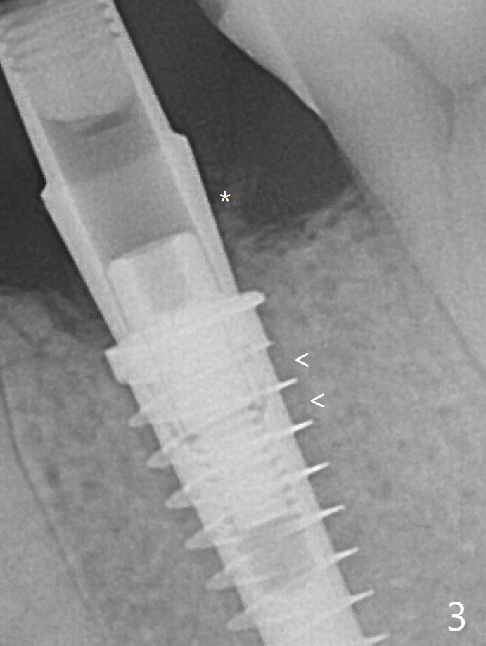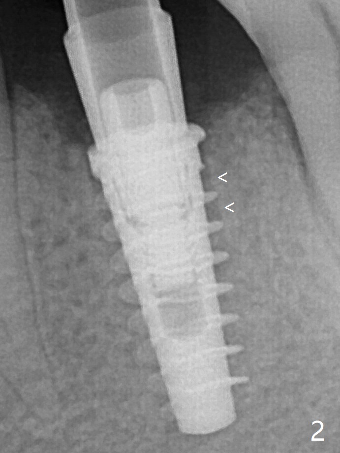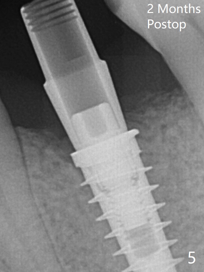 放置基台前,骨粉放置低于植体上端(Plateau),但是远中仍有间隙(图二箭头)。 放置基台后,两度填骨粉(图三*),远中间隙仿佛消失(箭头)。术后两个月,植体顶端似乎被牙槽嵴覆盖了(图五)。