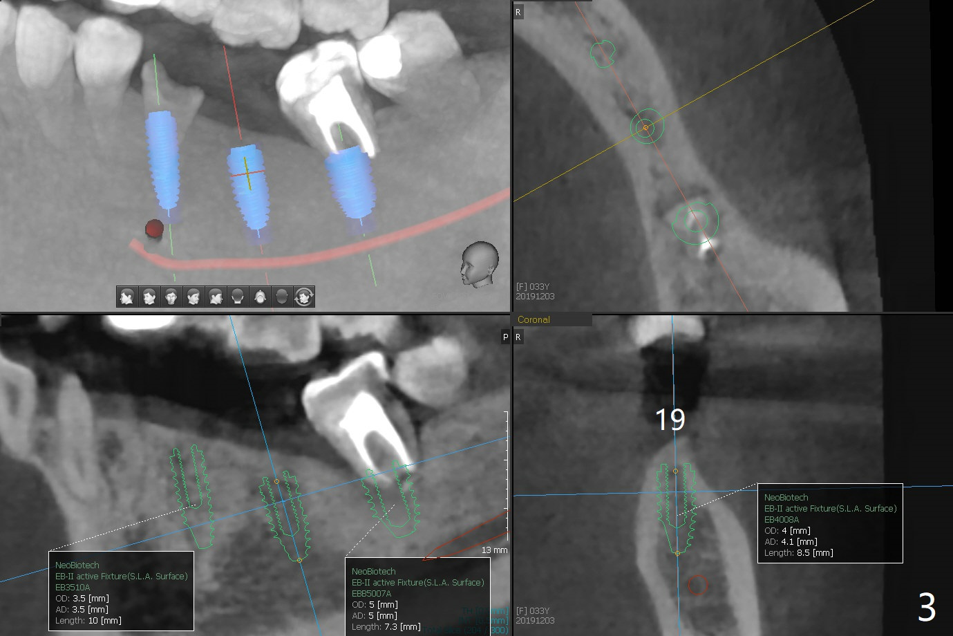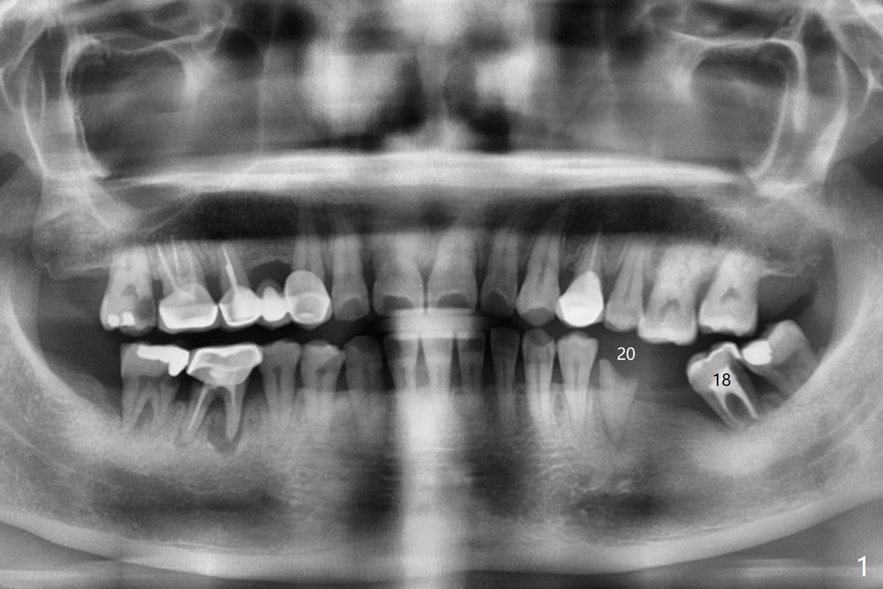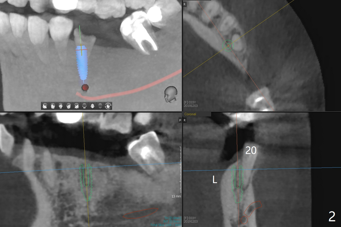 A 33-year-old woman fractures #20 equigingival with caries (Fig.1,2 barely salvageable). The ridge at #19 is atrophic (Fig.3), while the tooth #18 has mobility II (Fig.4). It seems that the best option would be extraction of #18 and 20 and immediate implant with guide (Fig.4). The tooth #20 is vital; socket shield will be conducted. To further prevent buccal plate collapse, a 3.5 or 4.0x10 mm implant will be placed lingual (Fig.2).