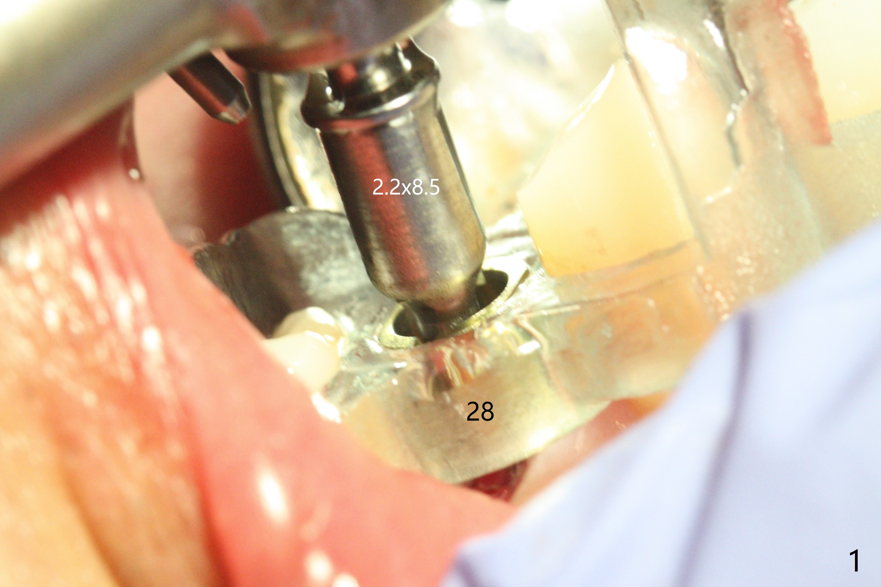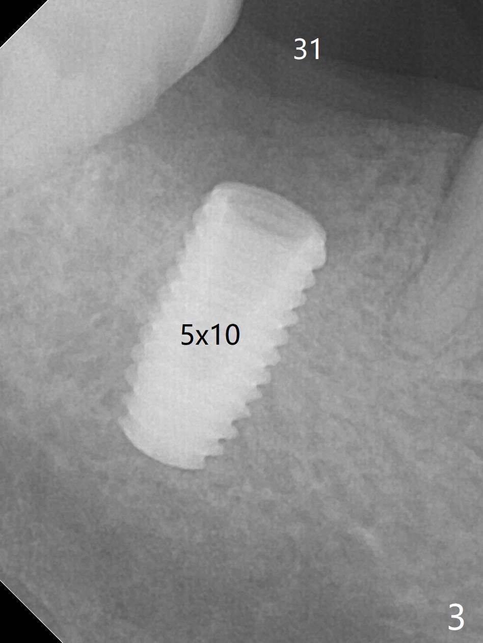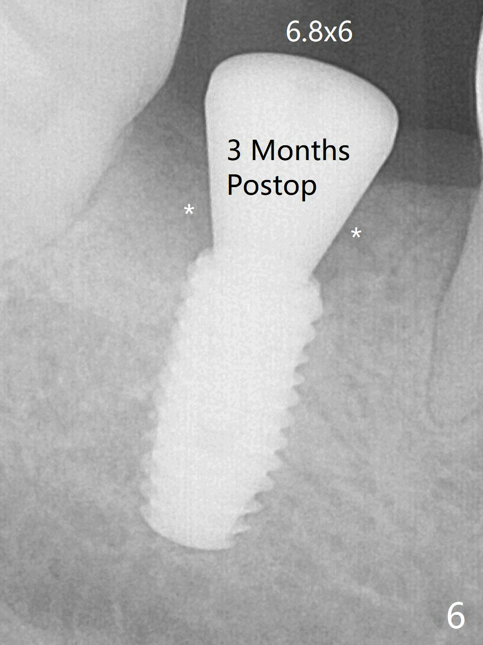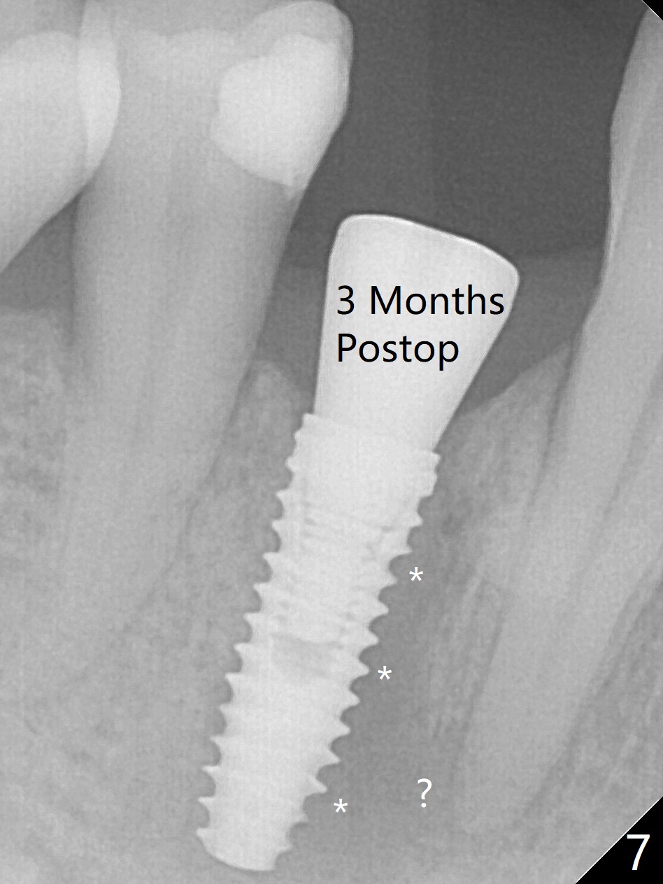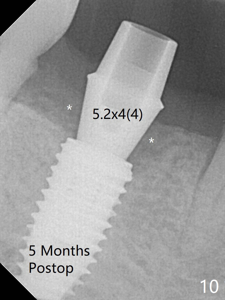 With 9 mm offset, the cylinder portion of the 2.2x8.5 mm drill does not engage to the metal sleeve of the guide at #28 after pointed drill (Fig.1). This issue could be solved with 12 mm offset, although it has no ill effect in this case. Fig.2 shows the site of #28 immediately before bone expansion and after use of 2.2x11.5 mm drill and small-scaled ridge split (^). The bone is so hard that the bone expansion is minimal (Fig.5) with autogenous bone graft and implant placement (Fig.4). There is the bone buccal to the implant clinically. A 5x10 mm implant is placed at #31 in the same appointment (Fig.3). Because of inability to masticate on the left (#18 root fracture with infection), the patient wants to restore #28 and 31 implants 3 months postop (Fig.6,7). The implant at #28 is removed while the healing abutment is being un-torqued without noting bone loss mesially (Fig.7 * (next similar case)). Bone graft is placed (Fig.8 (*),9). Pay attention radiolucency next the apex of the neighboring tooth (Fig.9 ?) before re-placement of an implant. The patient is upset, since he cannot eat. Two weeks later, a 6.5x4(4) mm cemented abutment is placed with 25 Ncm at #31 with a provisional for progressive loading for 2 weeks. Impression is taken. Two weeks later, a permanent crown is cemented without removing the underlying abutment. Two days later, the crown/abutment dislodges; a 6.8x6 mm healing abutment is placed. Eight days, it is difficult to reseat the existing crown and abutment. The mesiodistal edentulous space is limited as well. A 5.2x4(4) mm cemented abutment is able to be seated and torqued (30 Ncm) smoothly; in fact the clearance from the crestal bone (Fig.10 *) is not ample. If the abutment screw becomes loose in function, a profile drill should be used or a 4.5 mm in diameter abutment be placed. The abutment seems to remain in place immediate post cementation (Fig.11). Implant failure is probably due to no socket preservation (buccal plate atrophy) and too early restoration.