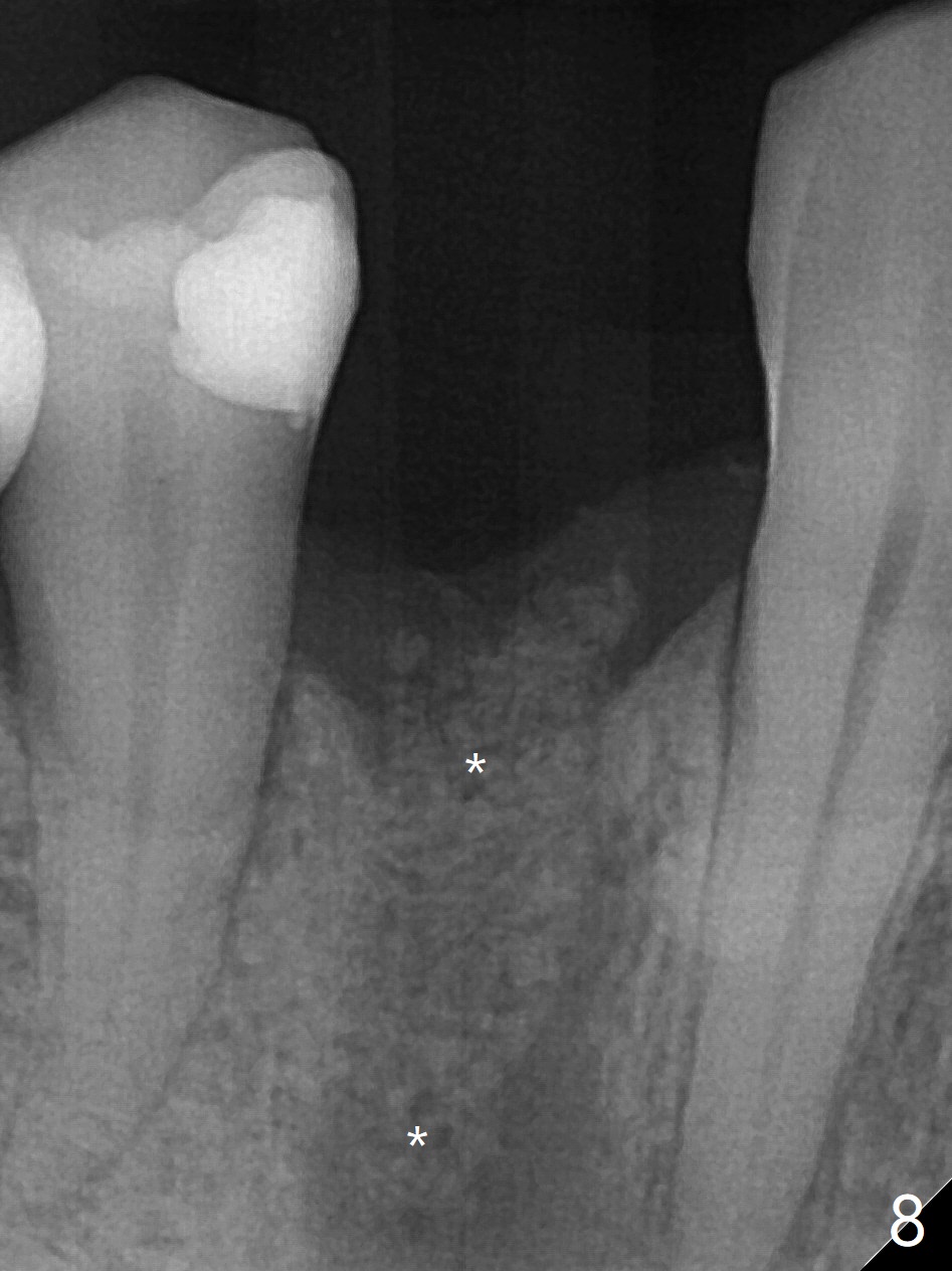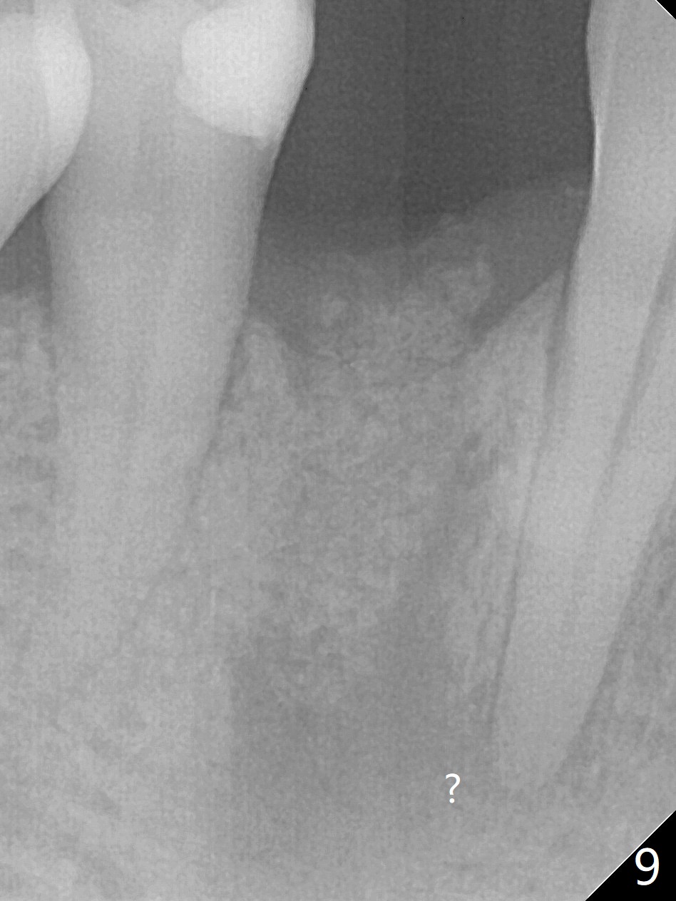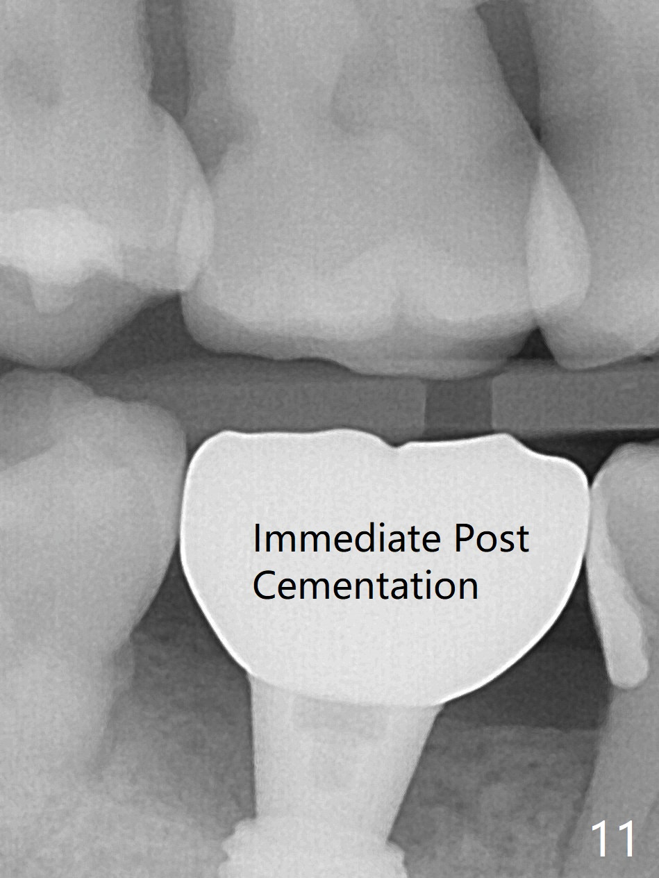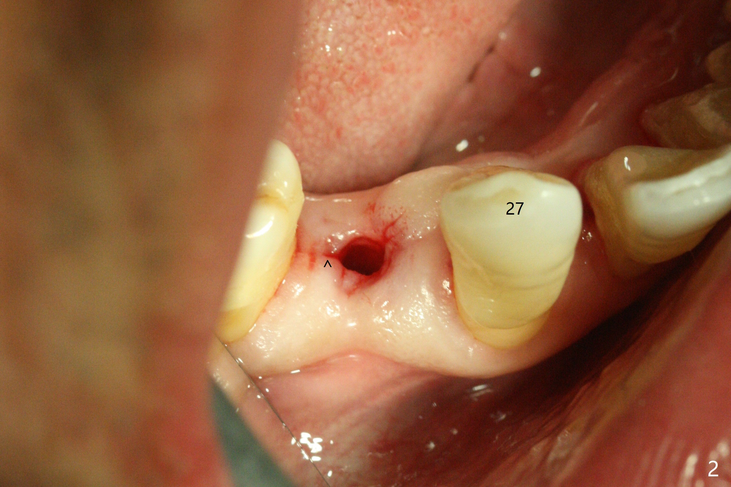 With 9 mm offset, the cylinder portion of the 2.2x8.5 mm drill does not engage to the metal sleeve of the guide at #28 after pointed drill (Fig.1). This issue could be solved with 12 mm offset, although it has no ill effect in this case. Fig.2 shows the site of #28 immediately before bone expansion and after use of 2.2x11.5 mm drill and small-scaled ridge split (^). The bone is so hard that the bone expansion is minimal (Fig.5) with autogenous bone graft and implant placement (Fig.4). There is the bone buccal to the implant clinically. A 5x10 mm implant is placed at #31 in the same appointment (Fig.3). Because of inability to masticate on the left (#18 root fracture with infection), the patient wants to restore #28 and 31 implants 3 months postop (Fig.6,7). The implant at #28 is removed while the healing abutment is being un-torqued without noting bone loss mesially (Fig.7 * (next similar case)). Bone graft is placed (Fig.8 (*),9). Pay attention radiolucency next the apex of the neighboring tooth (Fig.9 ?) before re-placement of an implant. The patient is upset, since he cannot eat. Two weeks later, a 6.5x4(4) mm cemented abutment is placed with 25 Ncm at #31 with a provisional for progressive loading for 2 weeks. Impression is taken. Two weeks later, a permanent crown is cemented without removing the underlying abutment. Two days later, the crown/abutment dislodges; a 6.8x6 mm healing abutment is placed. Eight days, it is difficult to reseat the existing crown and abutment. The mesiodistal edentulous space is limited as well. A 5.2x4(4) mm cemented abutment is able to be seated and torqued (30 Ncm) smoothly; in fact the clearance from the crestal bone (Fig.10 *) is not ample. If the abutment screw becomes loose in function, a profile drill should be used or a 4.5 mm in diameter abutment be placed. The abutment seems to remain in place immediate post cementation (Fig.11). Implant failure is probably due to no socket preservation (buccal plate atrophy) and too early restoration.