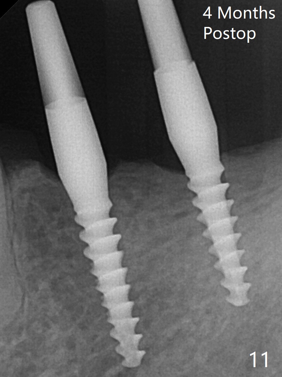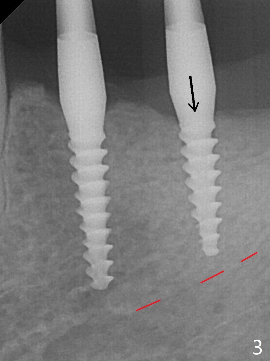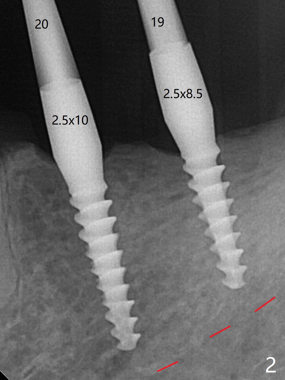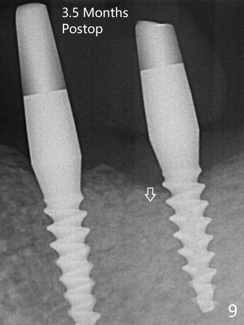 左下第一磨牙(#19)牙槽嵴狭窄,2.2毫米钻头完成导板钻洞后,舌侧骨板开始破裂(图一:<),打消牙槽嵴劈开术念头,放置2.5x8.5毫米一段式植体(图二(8.5毫米是最短植体)),好像离下齿槽神经管还有一定距离,适当植入深些(图四:箭头,15Ncm)。右下中切牙缺牙区牙槽嵴也十分狭窄(图四),最后不得不徒手植入2x8.5毫米植体(图五,六,25Ncm)。如果按设计植入2x12毫米植体,颊侧,或者舌侧骨板更容易穿孔。术后3.5月牙槽嵴下降(图七:箭头),可能术中那里压力太大,今后牙槽嵴钻洞要大。24号牙根尖阴影(图七),完成根管治疗(图八)。19牙位牙槽嵴吸收也严重(图九)。其实术后4个月19牙位牙槽嵴吸收并不严重(图十一)。