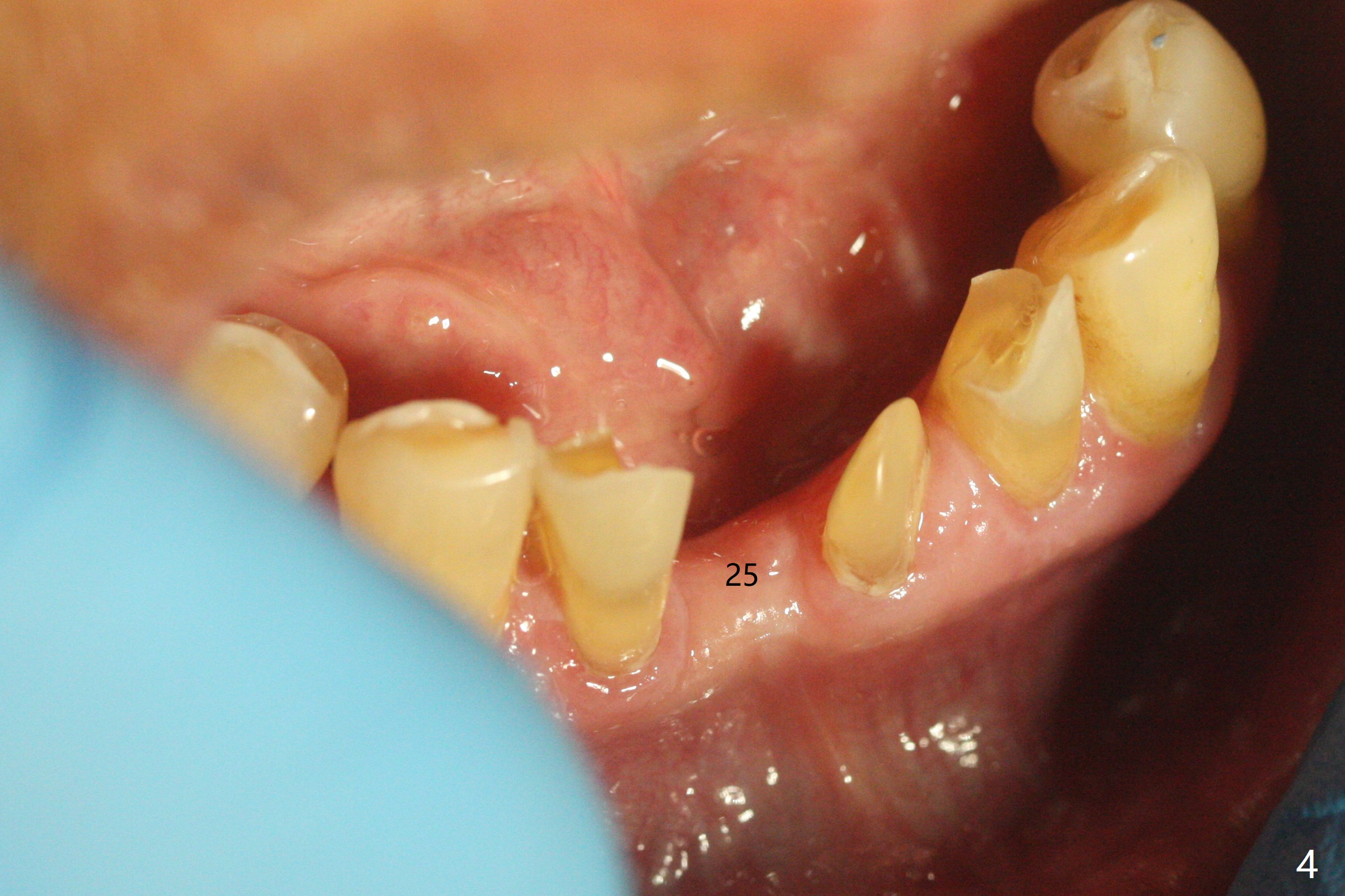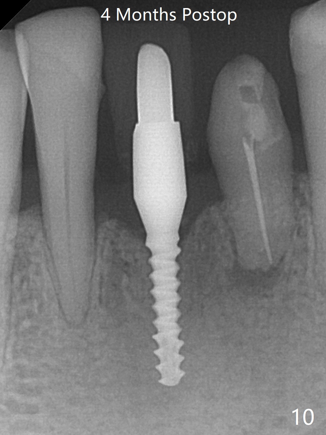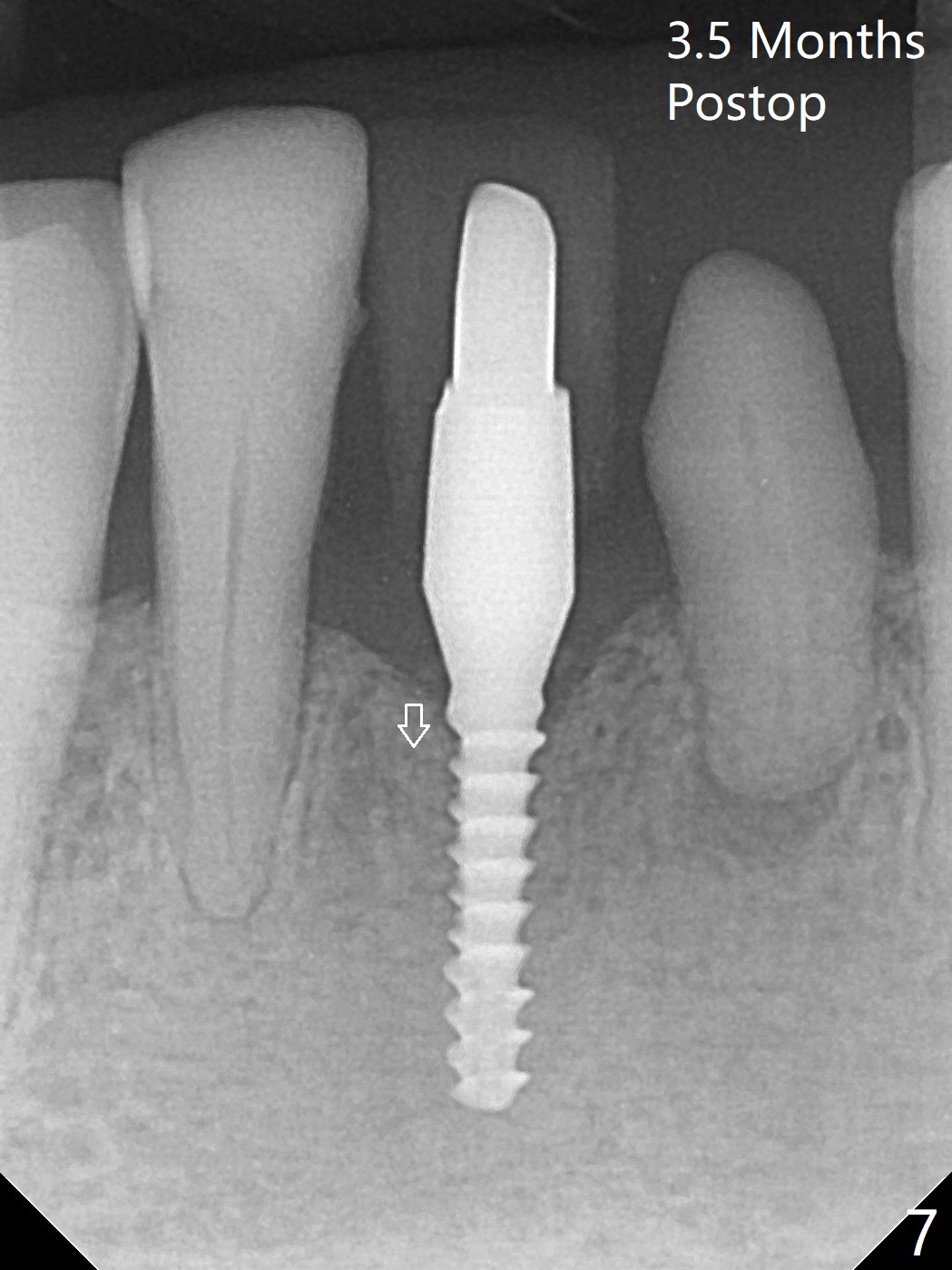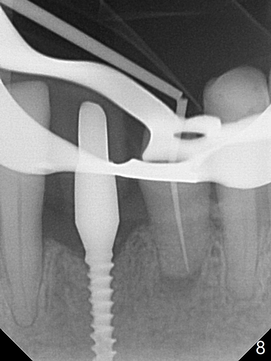 左下第一磨牙(#19)牙槽嵴狭窄,2.2毫米钻头完成导板钻洞后,舌侧骨板开始破裂(图一:<),打消牙槽嵴劈开术念头,放置2.5x8.5毫米一段式植体(图二(8.5毫米是最短植体)),好像离下齿槽神经管还有一定距离,适当植入深些(图四:箭头,15Ncm)。右下中切牙缺牙区牙槽嵴也十分狭窄(图四),最后不得不徒手植入2x8.5毫米植体(图五,六,25Ncm)。如果按设计植入2x12毫米植体,颊侧,或者舌侧骨板更容易穿孔。术后3.5月牙槽嵴下降(图七:箭头),可能术中那里压力太大,今后牙槽嵴钻洞要大。24号牙根尖阴影(图七),完成根管治疗(图八)。19牙位牙槽嵴吸收也严重(图九)。其实术后4个月19牙位牙槽嵴吸收并不严重(图十一)。