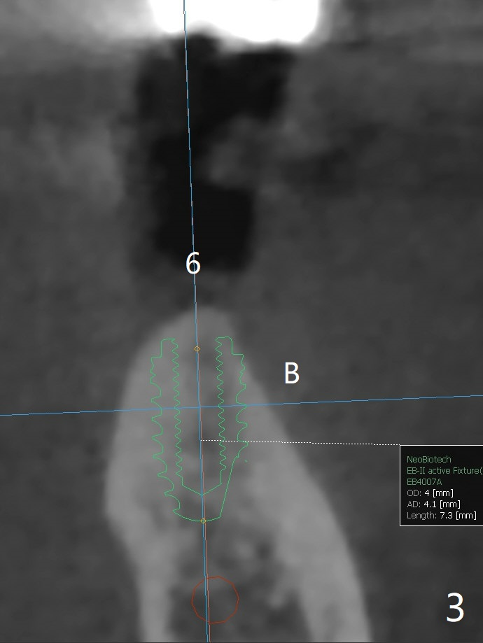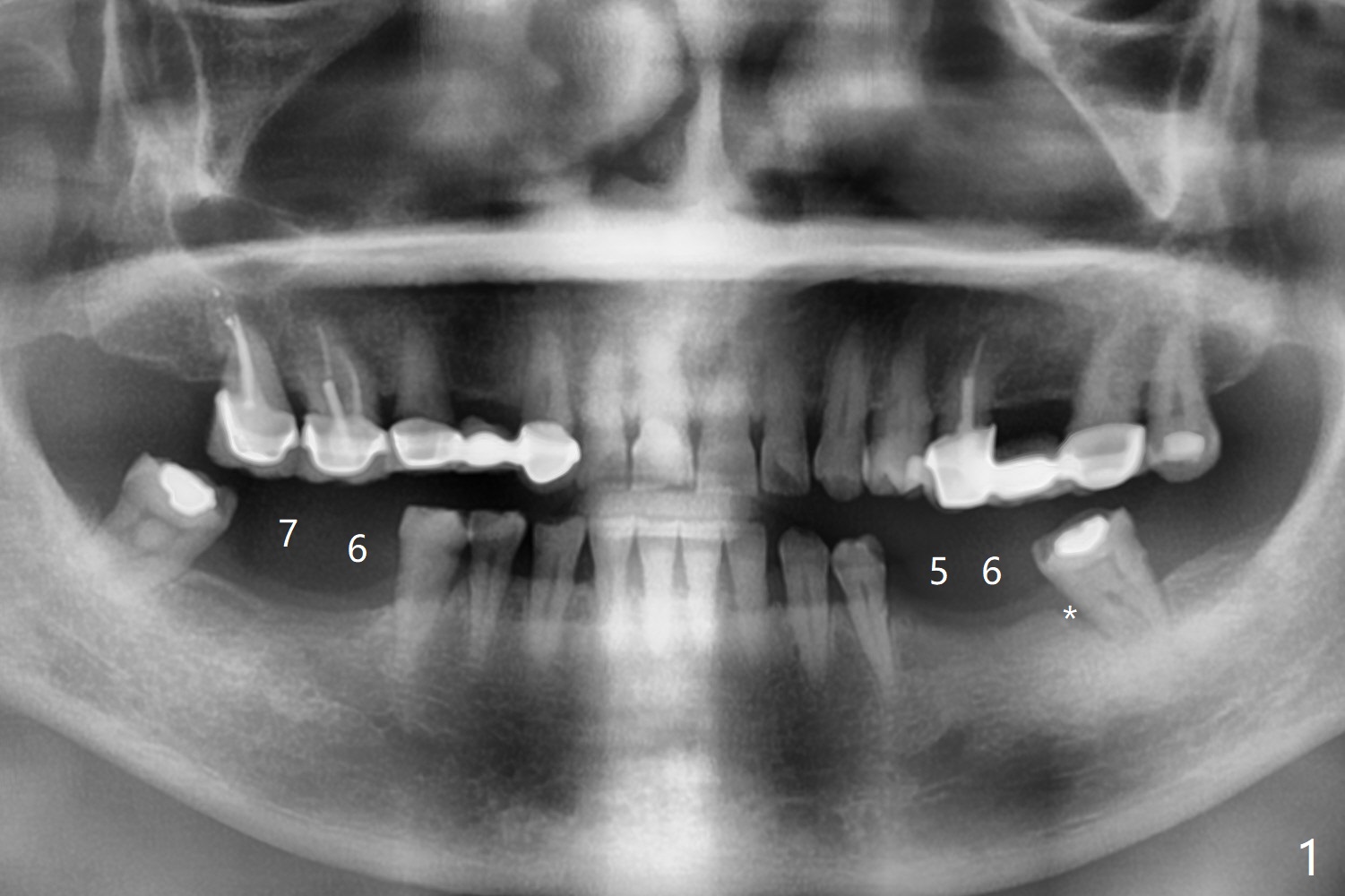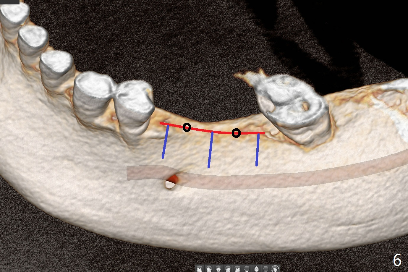 57岁女缺失四个下牙(图一),由于保险限制,先考虑左边种植(图二,三),主要问题是牙槽嵴狭窄(不过左上牙桥做的太长了,尤其是5,6(图一'),造成下面垂直距离缩短,修复困难。总之,她的牙齿显得短小)。牙槽嵴狭窄处理方法:切口,使用导板用bone trimmer和最细钻头(point drill或者2.2毫米)钻洞(图四:黑圆圈),到深度,然后用圆形骨锯在牙槽嵴顶部劈开(弯曲红线),必要时做三个垂直骨切口(图六),徒手利用旋转式骨扩张器,或者骨凿,推开颊侧骨板。也准备外科钻头(新的)。放置导板和钻头除去舌侧骨板,最后在5,6分别植入3.0 或者3.5毫米,4.0或者4.5毫米植体。如果初步稳定性好,即刻修复,主要防止7继续近中倾斜,必要时,7近中(图一*)植骨。抽血制备两个PRF膜和粘性骨块。