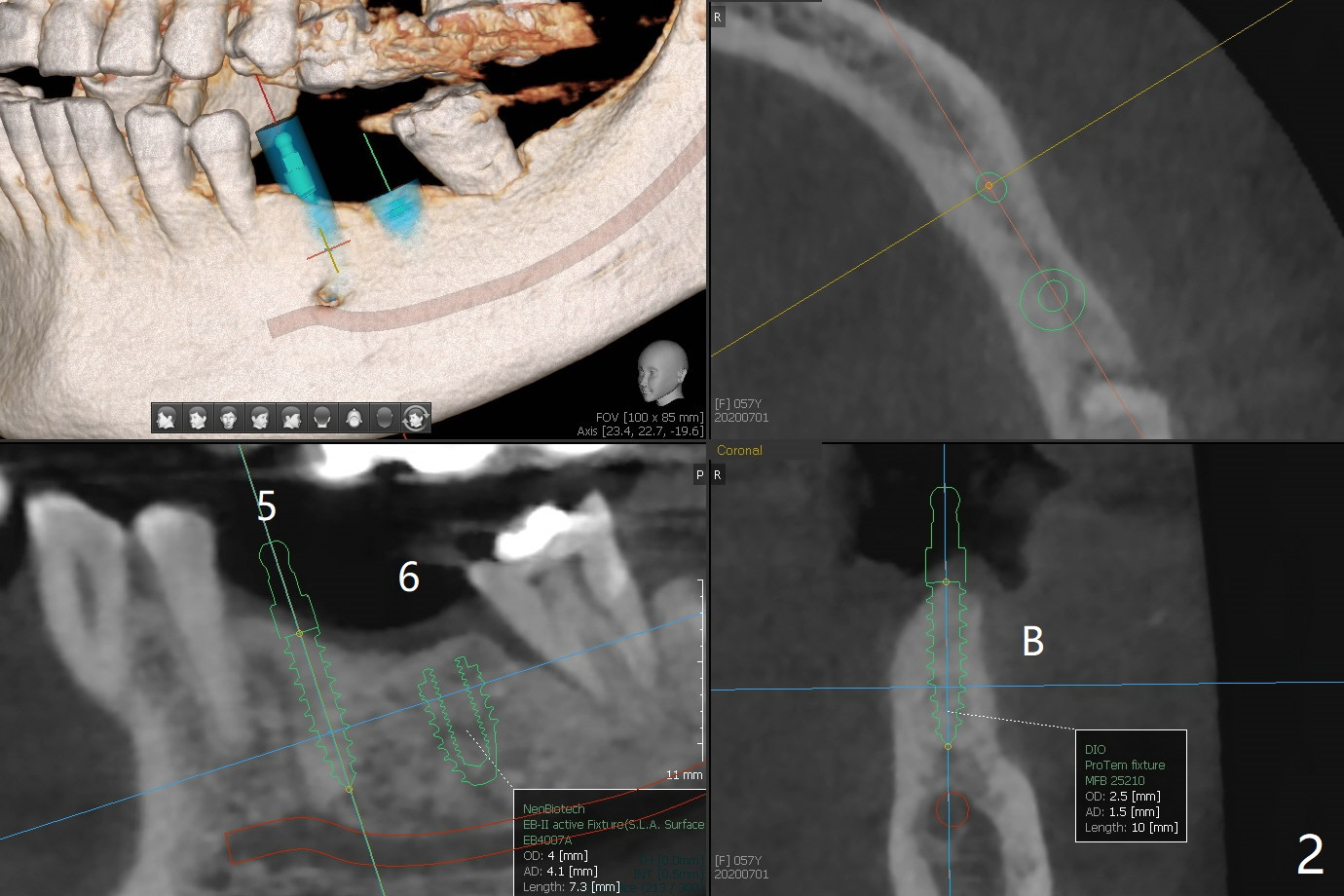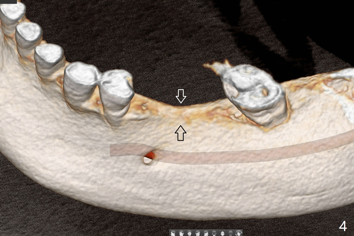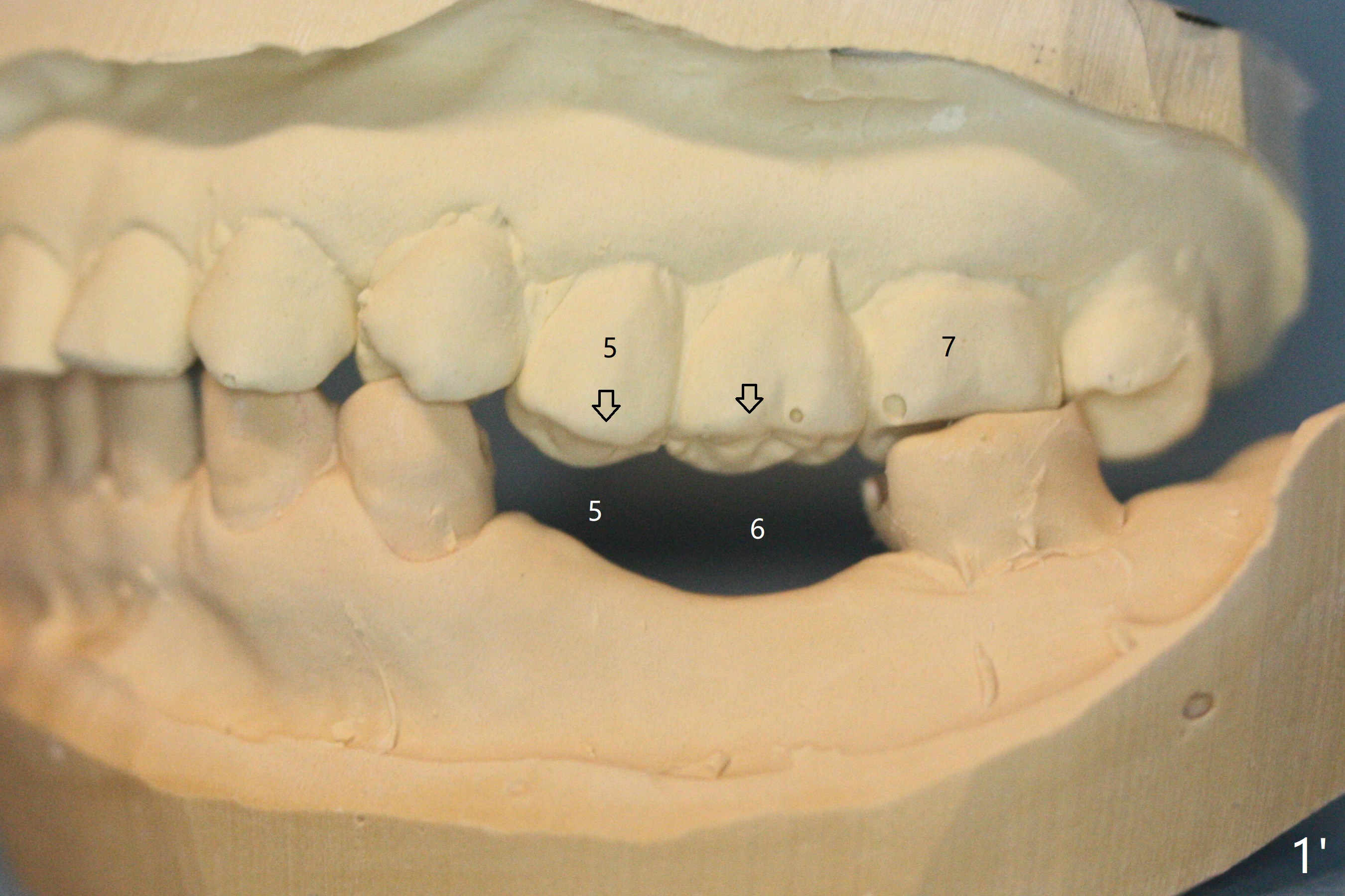 57岁女缺失四个下牙(图一),由于保险限制,先考虑左边种植(图二,三),主要问题是牙槽嵴狭窄(不过左上牙桥做的太长了,尤其是5,6(图一'),造成下面垂直距离缩短,修复困难。总之,她的牙齿显得短小)。牙槽嵴狭窄处理方法:切口,使用导板用bone trimmer和最细钻头(point drill或者2.2毫米)钻洞(图四:黑圆圈),到深度,然后用圆形骨锯在牙槽嵴顶部劈开(弯曲红线),必要时做三个垂直骨切口(图六),徒手利用旋转式骨扩张器,或者骨凿,推开颊侧骨板。也准备外科钻头(新的)。放置导板和钻头除去舌侧骨板,最后在5,6分别植入3.0 或者3.5毫米,4.0或者4.5毫米植体。如果初步稳定性好,即刻修复,主要防止7继续近中倾斜,必要时,7近中(图一*)植骨。抽血制备两个PRF膜和粘性骨块。