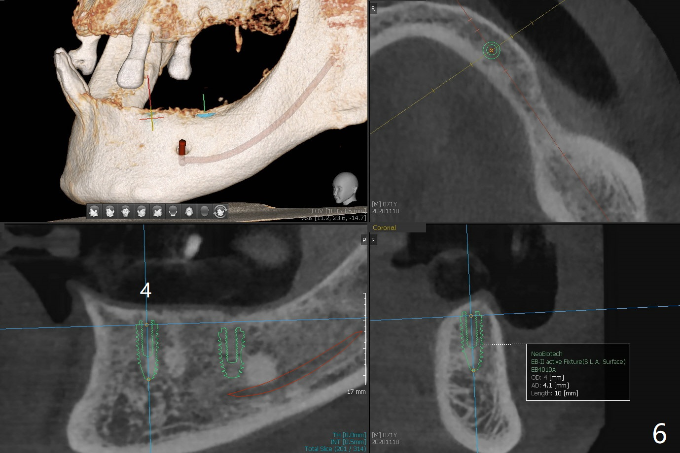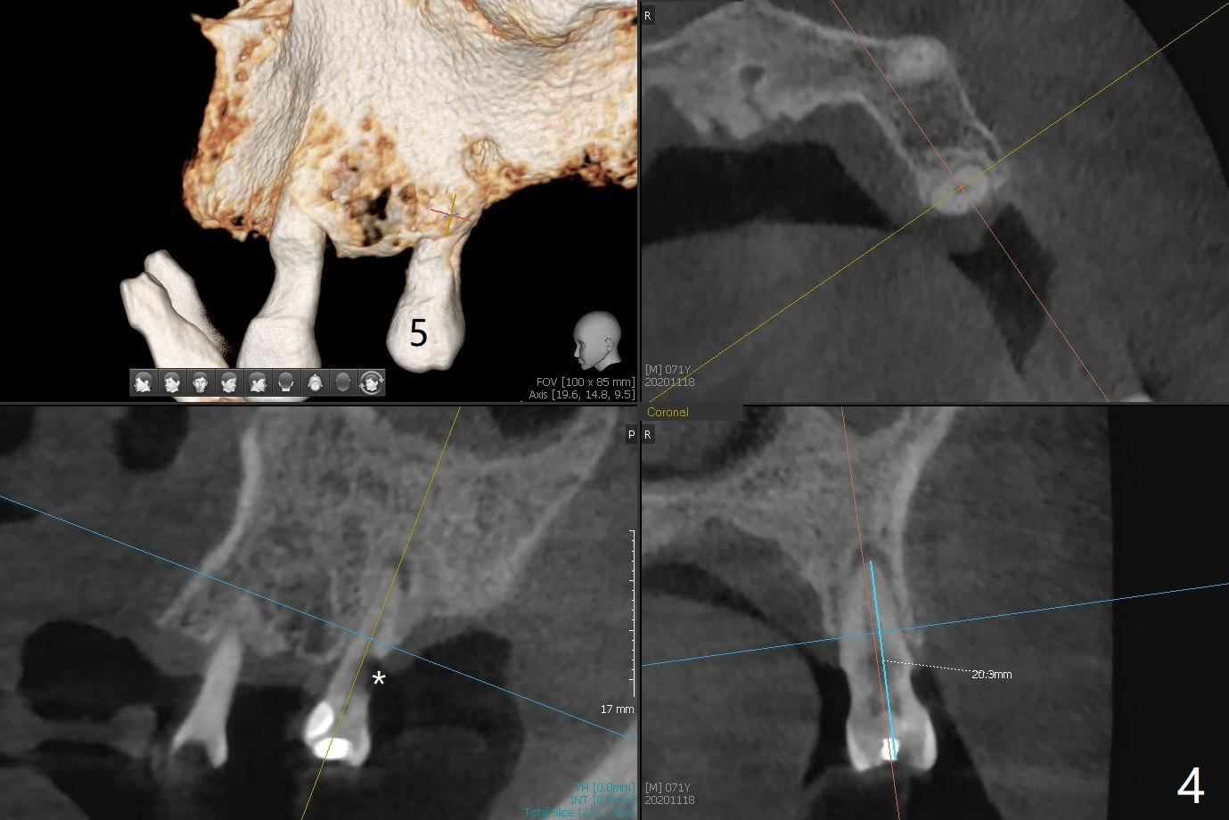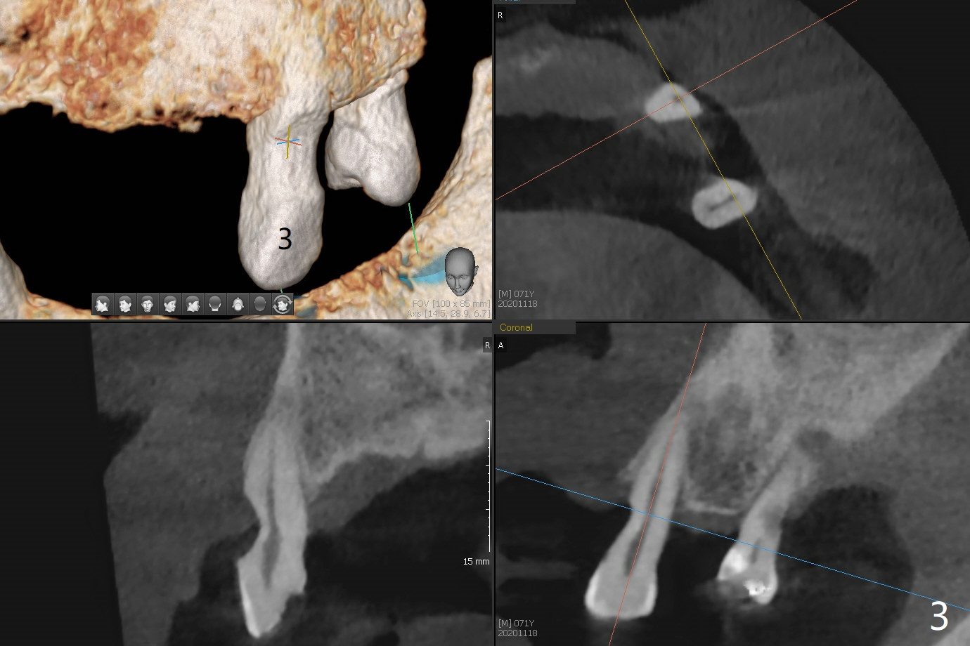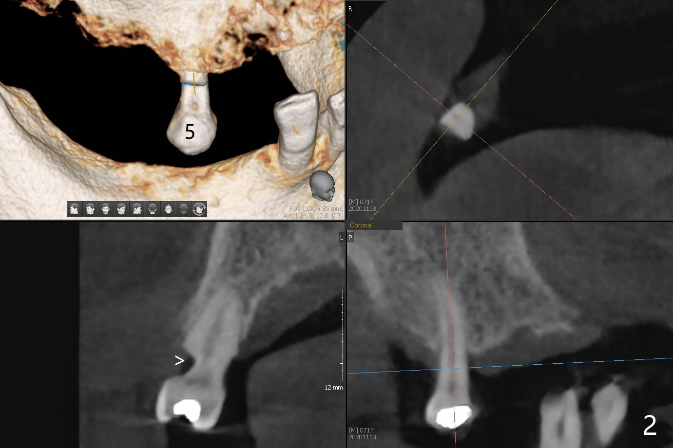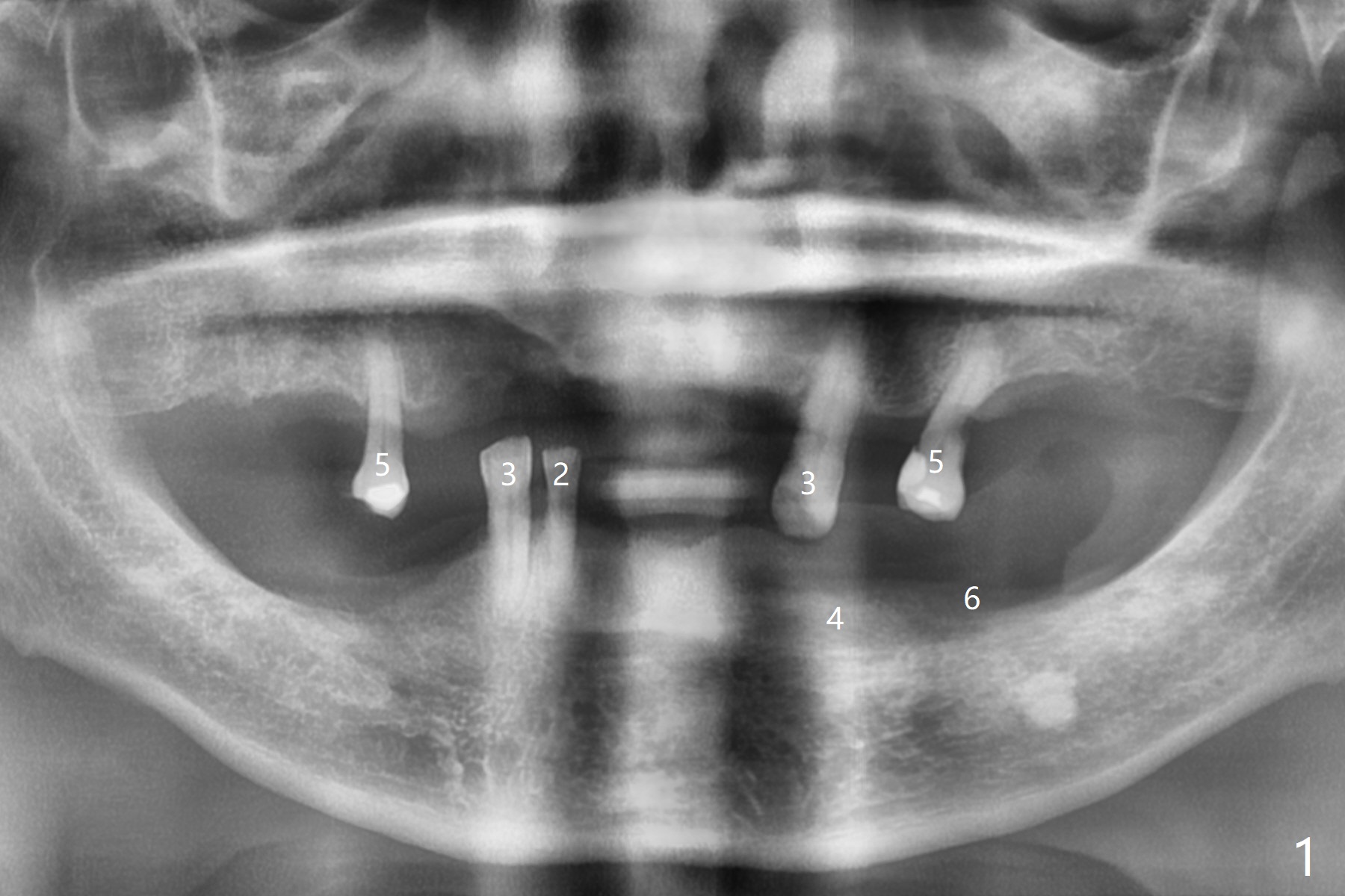71岁男主诉下颌局部托牙松动(图一),侧切牙不适,临床检查显示后者有咬合创伤,局部卫生不佳,对策:洗牙以及左下4,6植入植体,放置带有球的基台(图五,六)。上颌局部托牙有三个自然牙,挺稳定,但是颈部缺损严重,需要修补(图二,三),左上5远中龋齿需要根管治疗(图四),尽量延长基牙寿命。一个月后病人回来却要求处理松动疼痛右下2,不愿意种植,与3固定和调整咬合,症状消失。Return to No Caries Overdentures Xin Wei, DDS, PhD, MS 1st edition 11/18/2020, last revision 12/13/2020