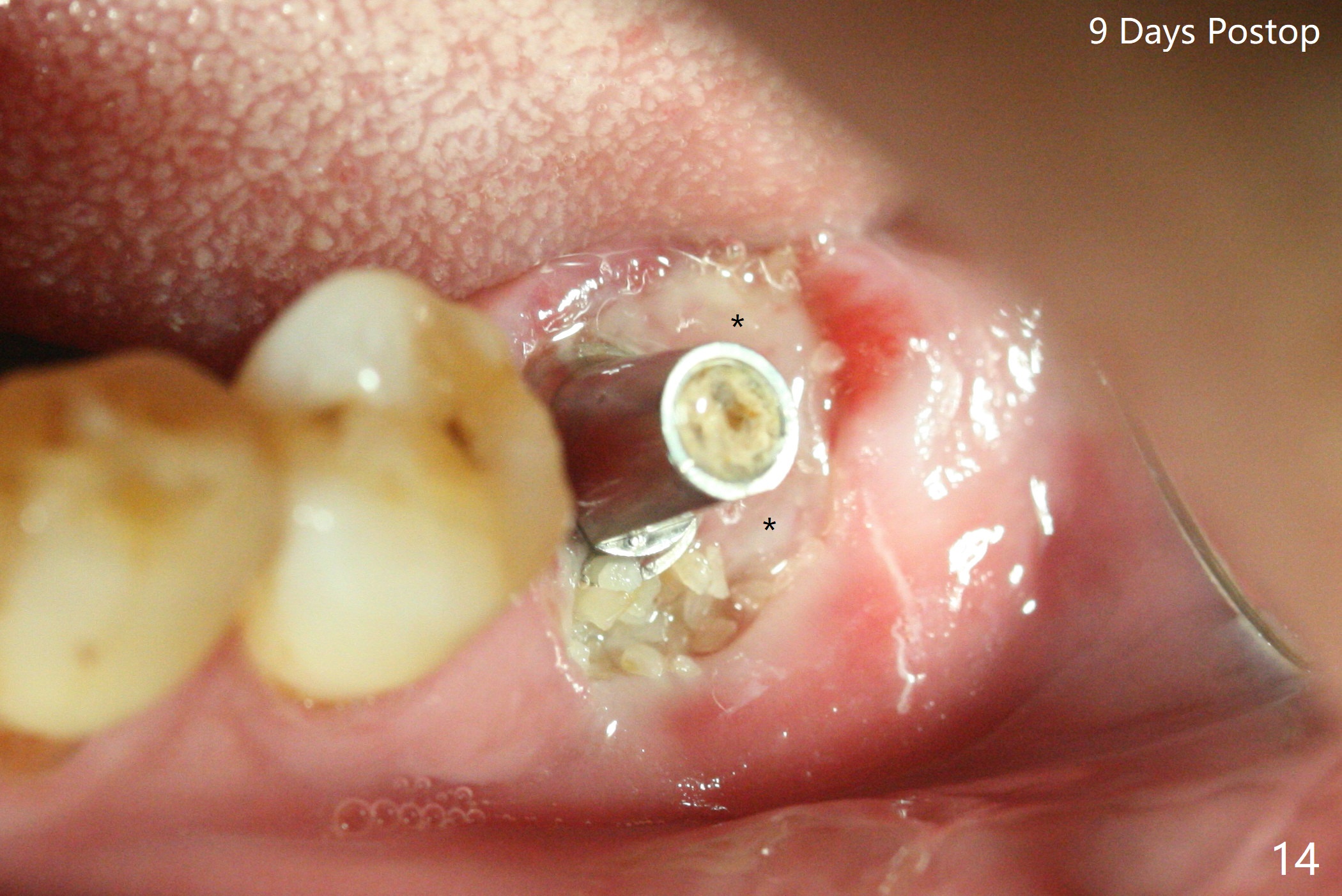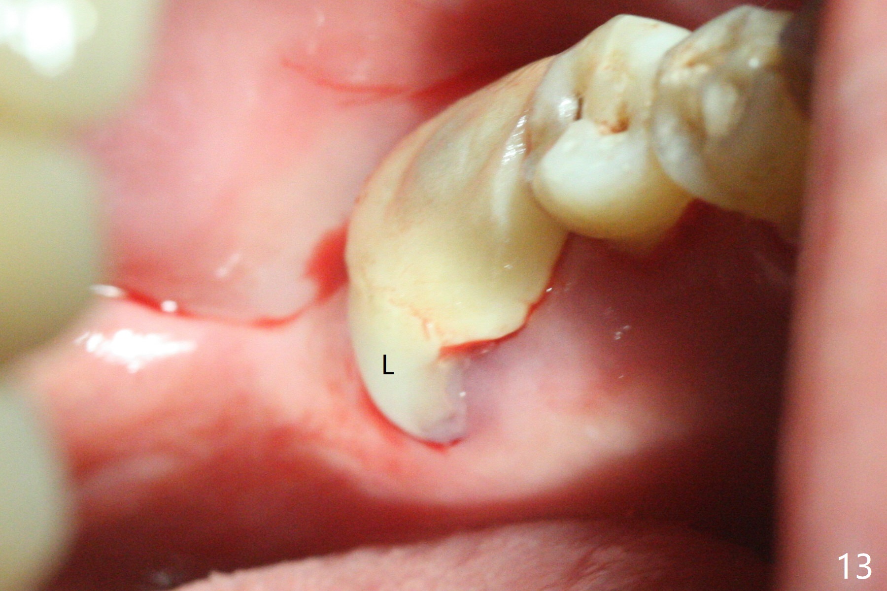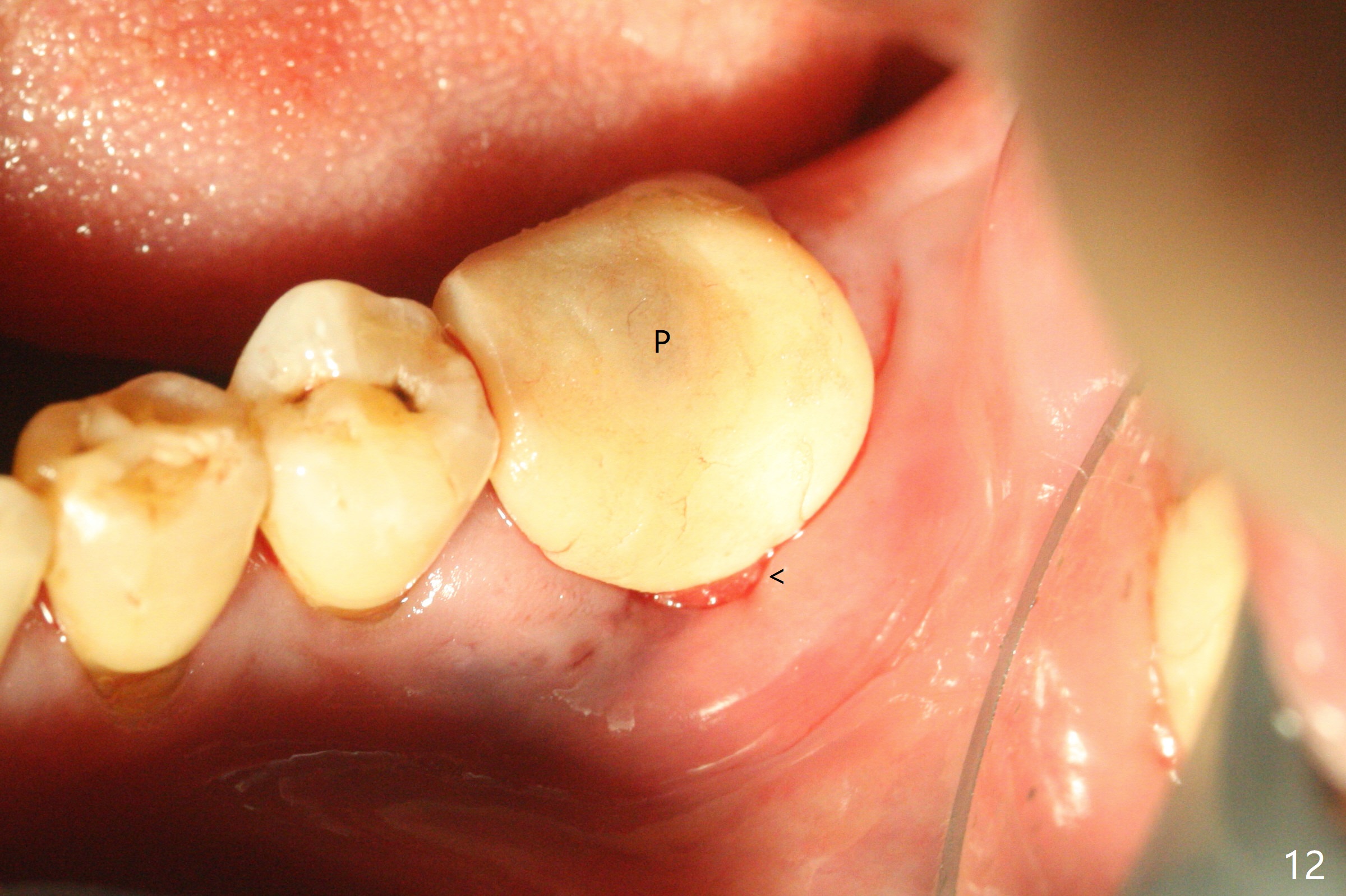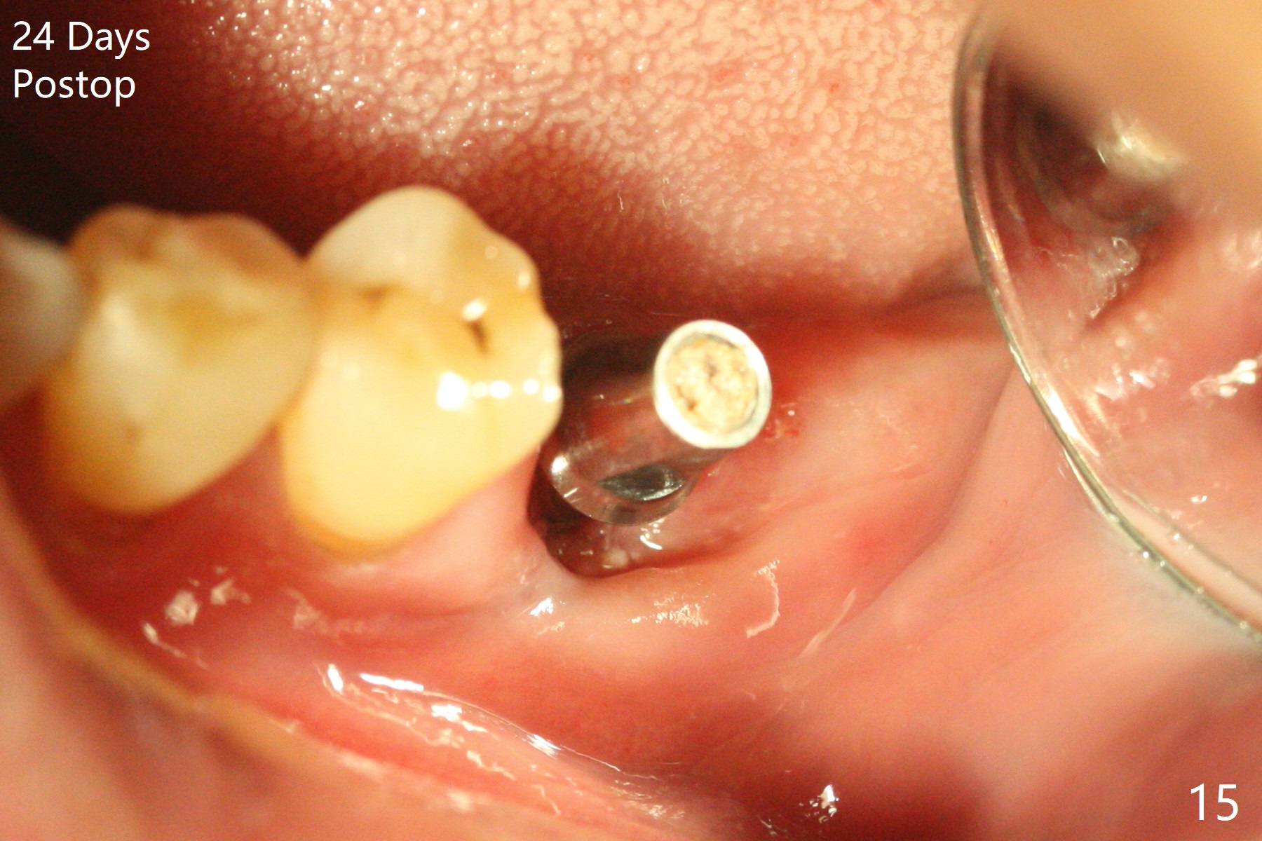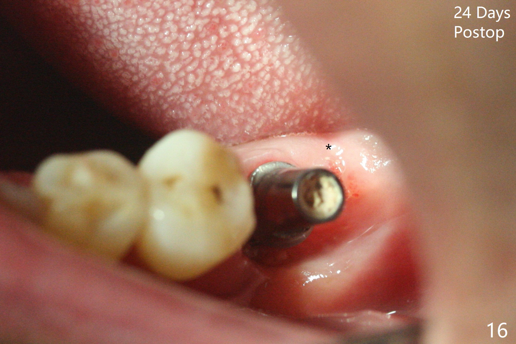 Vatech CT (南韩)3D影像有三种形式,其中一种特别适合术前研究骨质形态,例如66岁男左下6骨质吸收严重(图一),需要拔除种植,颊侧骨板好像短,结合临床检查(颊侧瘘道,图二:<),植体应该植在舌侧。但是远中舌侧根暴露(图三,四),植体种植势必在近中牙槽窝或者中隔。图五是同个牙齿颊侧咬合面观,去除牙冠,显示中隔;当牙根拔除后(图六),中隔好像比较窄,上端圆滑,钻头容易打滑,不太适合种植,所以近中窝仿佛是最佳植牙点,凹陷窝底容易让钻头进入骨头(图六:红箭头(偏向舌侧),图七)。当4x11毫米植体植入时,颊侧螺纹暴露似乎过多(图八),所以正式植体短2毫米(图九),远中牙槽窝塞入胶原塞,而植体周围放置大量粘性骨粉(*),首先接近植体上缘,便于放置修复基台(5.5x5.7(4)),之后骨粉堆高至基台边缘(图十,十一:*)。临时牙冠(图十二:P)覆盖巨大牙槽窝和PRF膜(箭头),舌侧附加树脂关闭远中舌侧窝(图十三:L)。术后9天病人回来汇报临时牙冠脱落两次,病人把它回位,好奇取出牙冠,骨粉和PRF膜(图十四:*)仿佛没有丧失。但是术后24天骨粉损失不少(图十五,上次临时牙冠衬里重要),远中舌侧牙槽窝倒是愈合(图十六:*)。由于局部卫生不佳,伤口敞开,一个月复诊。其实病人术后9个月才回来取模,粘固牙冠时拍摄根尖片和咬翼片。