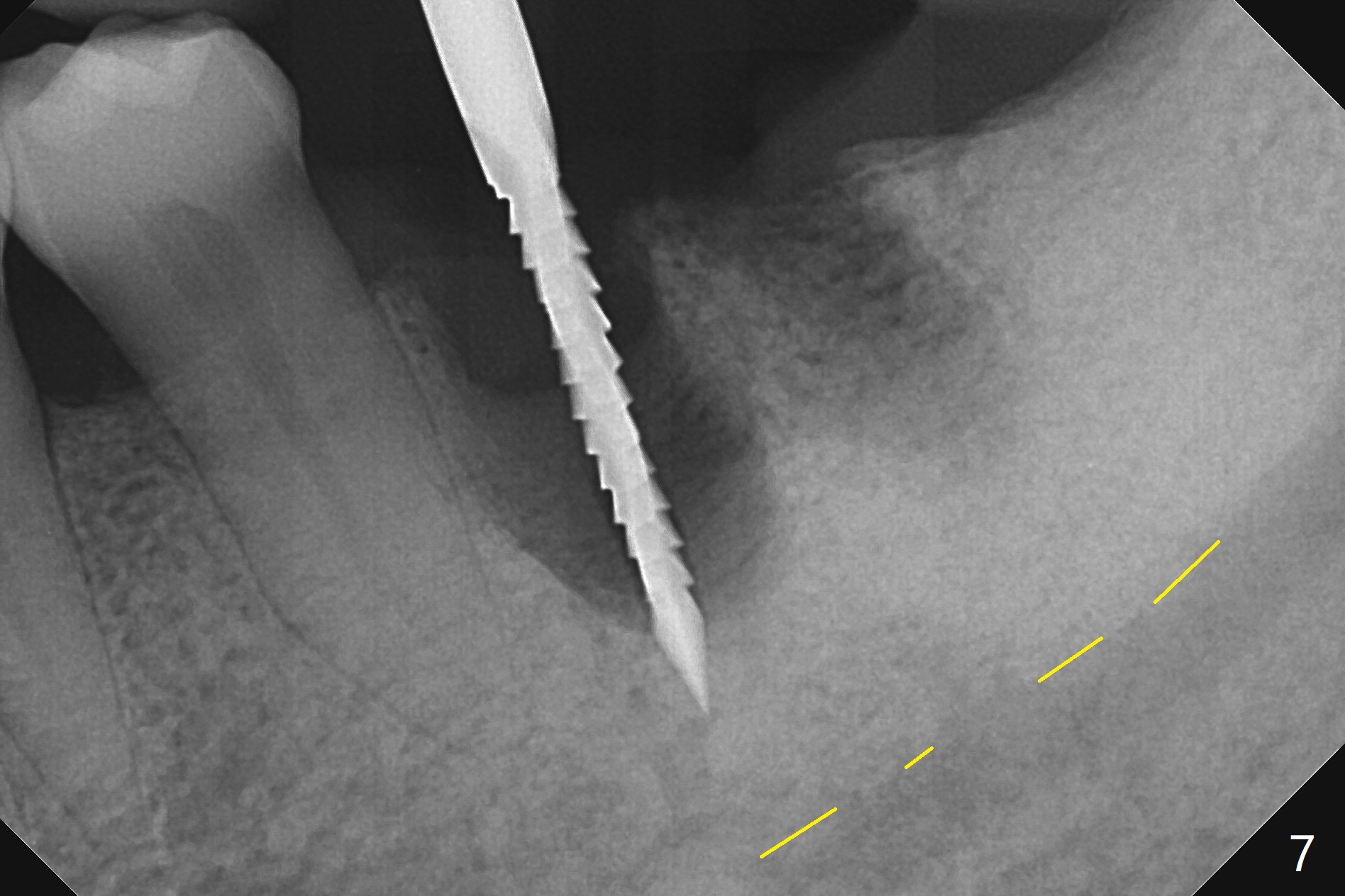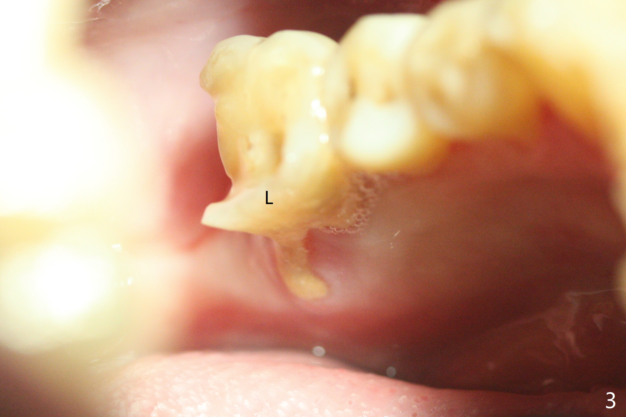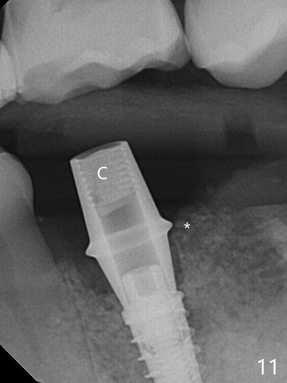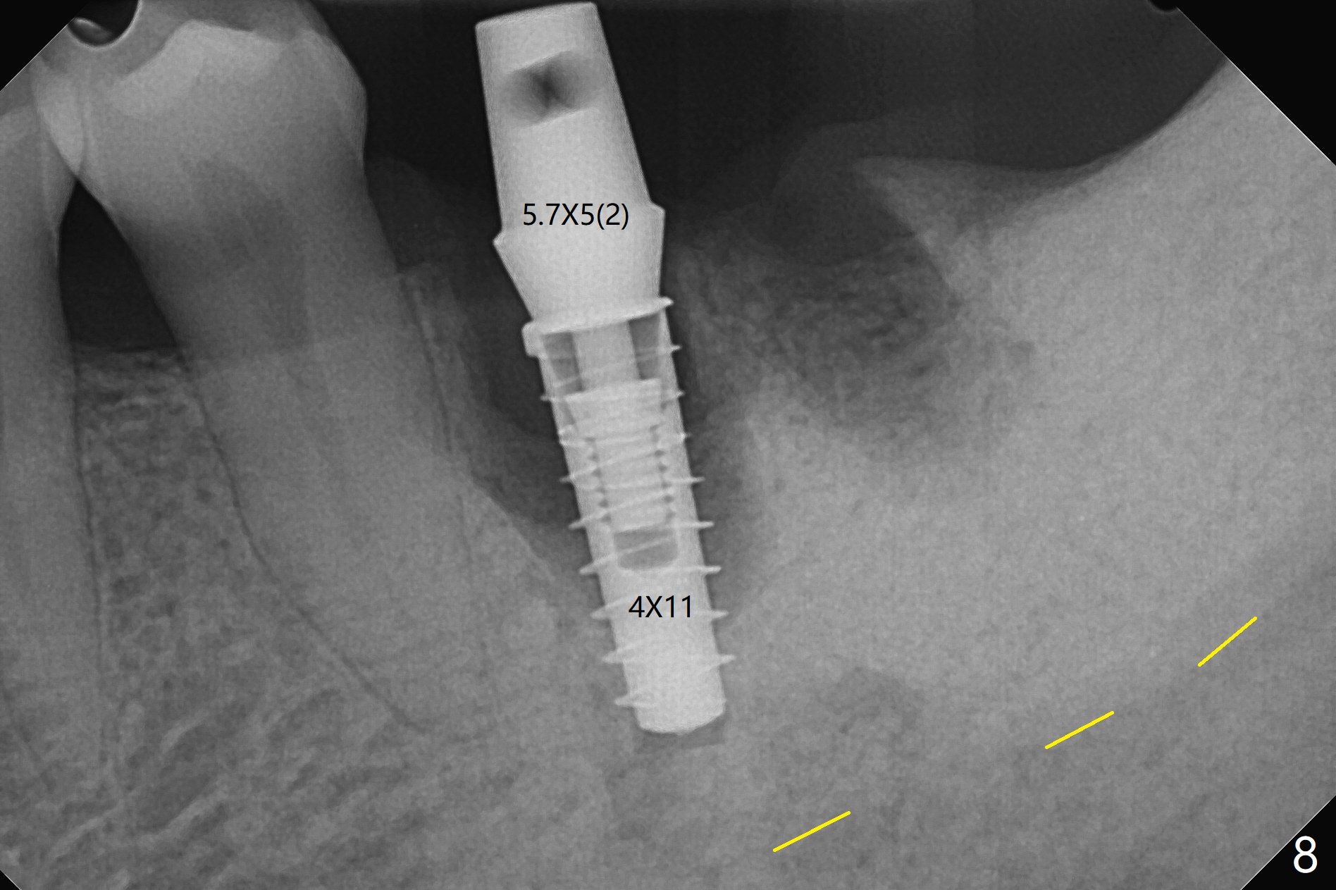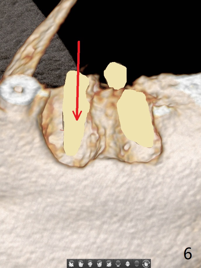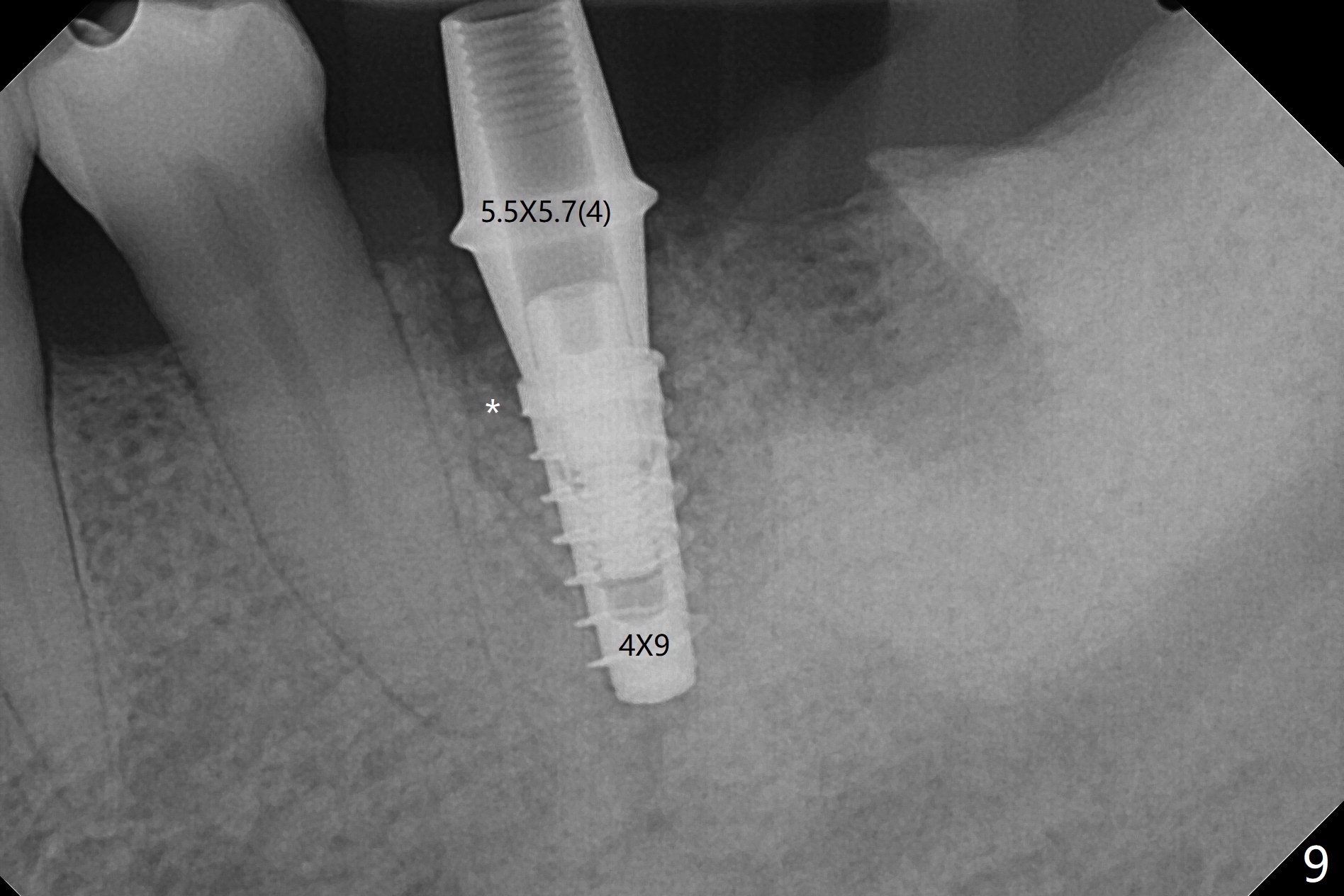 Vatech CT (南韩)3D影像有三种形式,其中一种特别适合术前研究骨质形态,例如66岁男左下6骨质吸收严重(图一),需要拔除种植,颊侧骨板好像短,结合临床检查(颊侧瘘道,图二:<),植体应该植在舌侧。但是远中舌侧根暴露(图三,四),植体种植势必在近中牙槽窝或者中隔。图五是同个牙齿颊侧咬合面观,去除牙冠,显示中隔;当牙根拔除后(图六),中隔好像比较窄,上端圆滑,钻头容易打滑,不太适合种植,所以近中窝仿佛是最佳植牙点,凹陷窝底容易让钻头进入骨头(图六:红箭头(偏向舌侧),图七)。当4x11毫米植体植入时,颊侧螺纹暴露似乎过多(图八),所以正式植体短2毫米(图九),远中牙槽窝塞入胶原塞,而植体周围放置大量粘性骨粉(*),首先接近植体上缘,便于放置修复基台(5.5x5.7(4)),之后骨粉堆高至基台边缘(图十,十一:*)。临时牙冠(图十二:P)覆盖巨大牙槽窝和PRF膜(箭头),舌侧附加树脂关闭远中舌侧窝(图十三:L)。术后9天病人回来汇报临时牙冠脱落两次,病人把它回位,好奇取出牙冠,骨粉和PRF膜(图十四:*)仿佛没有丧失。但是术后24天骨粉损失不少(图十五,上次临时牙冠衬里重要),远中舌侧牙槽窝倒是愈合(图十六:*)。由于局部卫生不佳,伤口敞开,一个月复诊。其实病人术后9个月才回来取模,粘固牙冠时拍摄根尖片和咬翼片。
