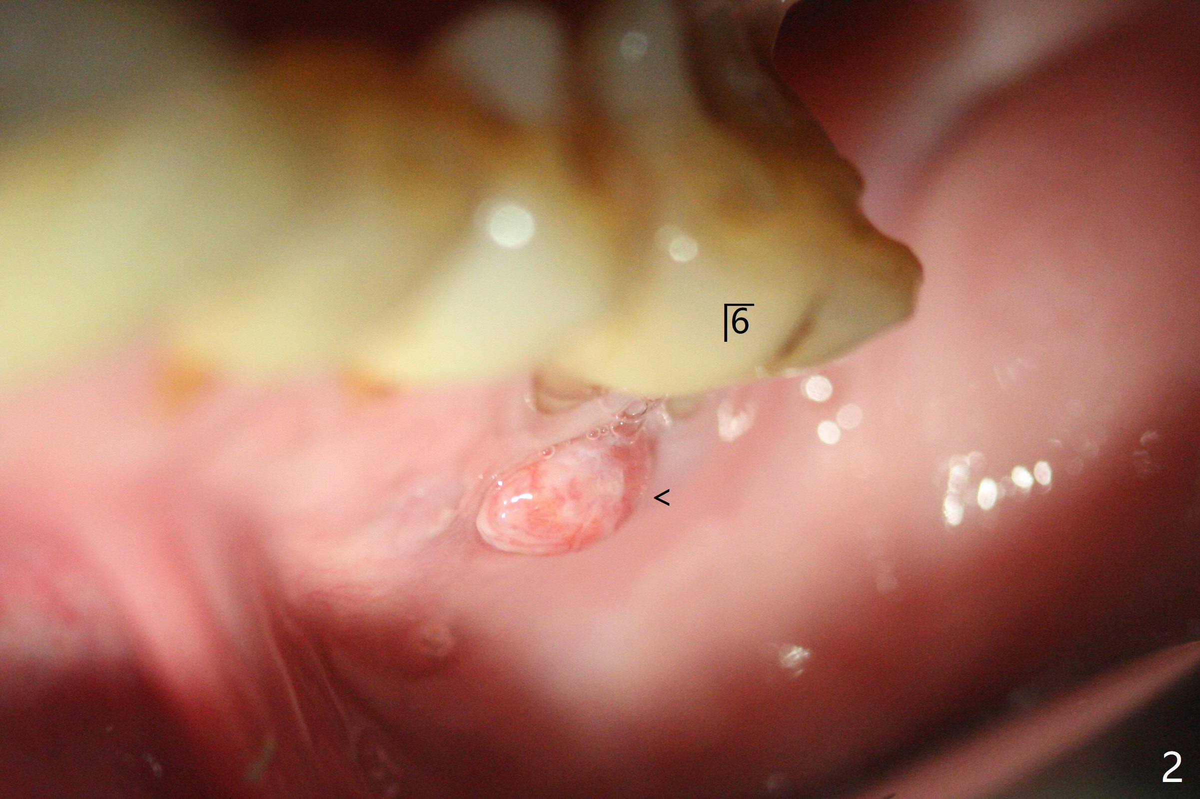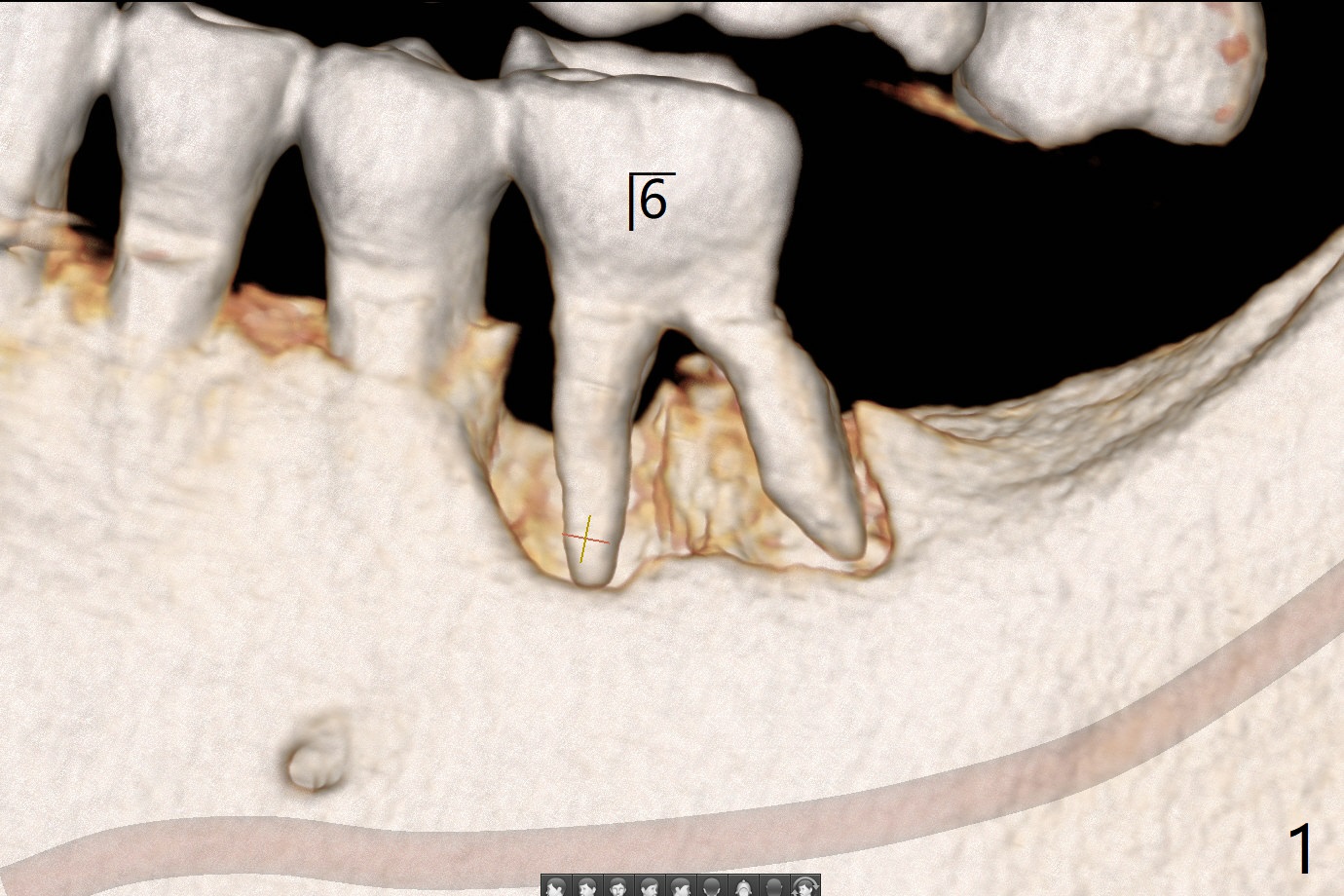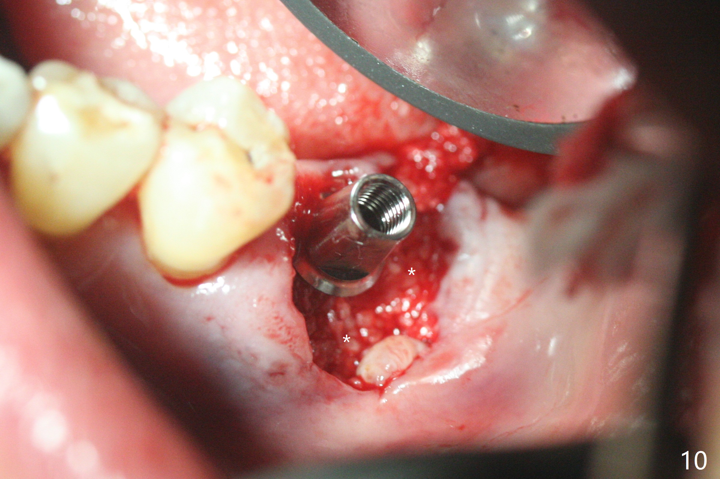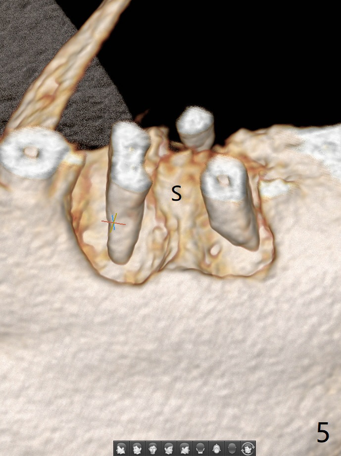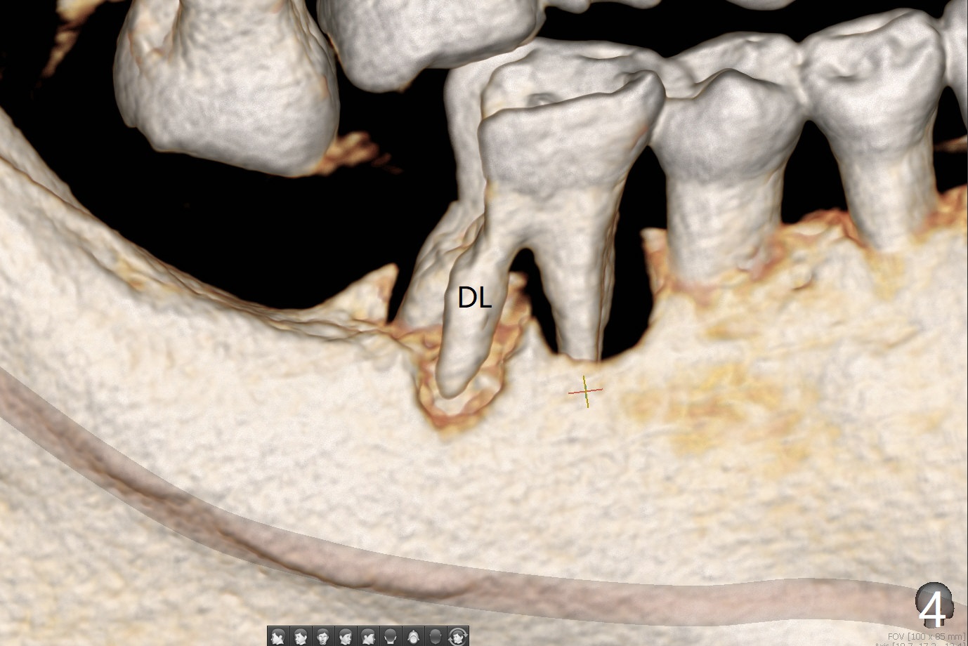 Vatech CT (南韩)3D影像有三种形式,其中一种特别适合术前研究骨质形态,例如66岁男左下6骨质吸收严重(图一),需要拔除种植,颊侧骨板好像短,结合临床检查(颊侧瘘道,图二:<),植体应该植在舌侧。但是远中舌侧根暴露(图三,四),植体种植势必在近中牙槽窝或者中隔。图五是同个牙齿颊侧咬合面观,去除牙冠,显示中隔;当牙根拔除后(图六),中隔好像比较窄,上端圆滑,钻头容易打滑,不太适合种植,所以近中窝仿佛是最佳植牙点,凹陷窝底容易让钻头进入骨头(图六:红箭头(偏向舌侧),图七)。当4x11毫米植体植入时,颊侧螺纹暴露似乎过多(图八),所以正式植体短2毫米(图九),远中牙槽窝塞入胶原塞,而植体周围放置大量粘性骨粉(*),首先接近植体上缘,便于放置修复基台(5.5x5.7(4)),之后骨粉堆高至基台边缘(图十,十一:*)。临时牙冠(图十二:P)覆盖巨大牙槽窝和PRF膜(箭头),舌侧附加树脂关闭远中舌侧窝(图十三:L)。术后9天病人回来汇报临时牙冠脱落两次,病人把它回位,好奇取出牙冠,骨粉和PRF膜(图十四:*)仿佛没有丧失。但是术后24天骨粉损失不少(图十五,上次临时牙冠衬里重要),远中舌侧牙槽窝倒是愈合(图十六:*)。由于局部卫生不佳,伤口敞开,一个月复诊。其实病人术后9个月才回来取模,粘固牙冠时拍摄根尖片和咬翼片。