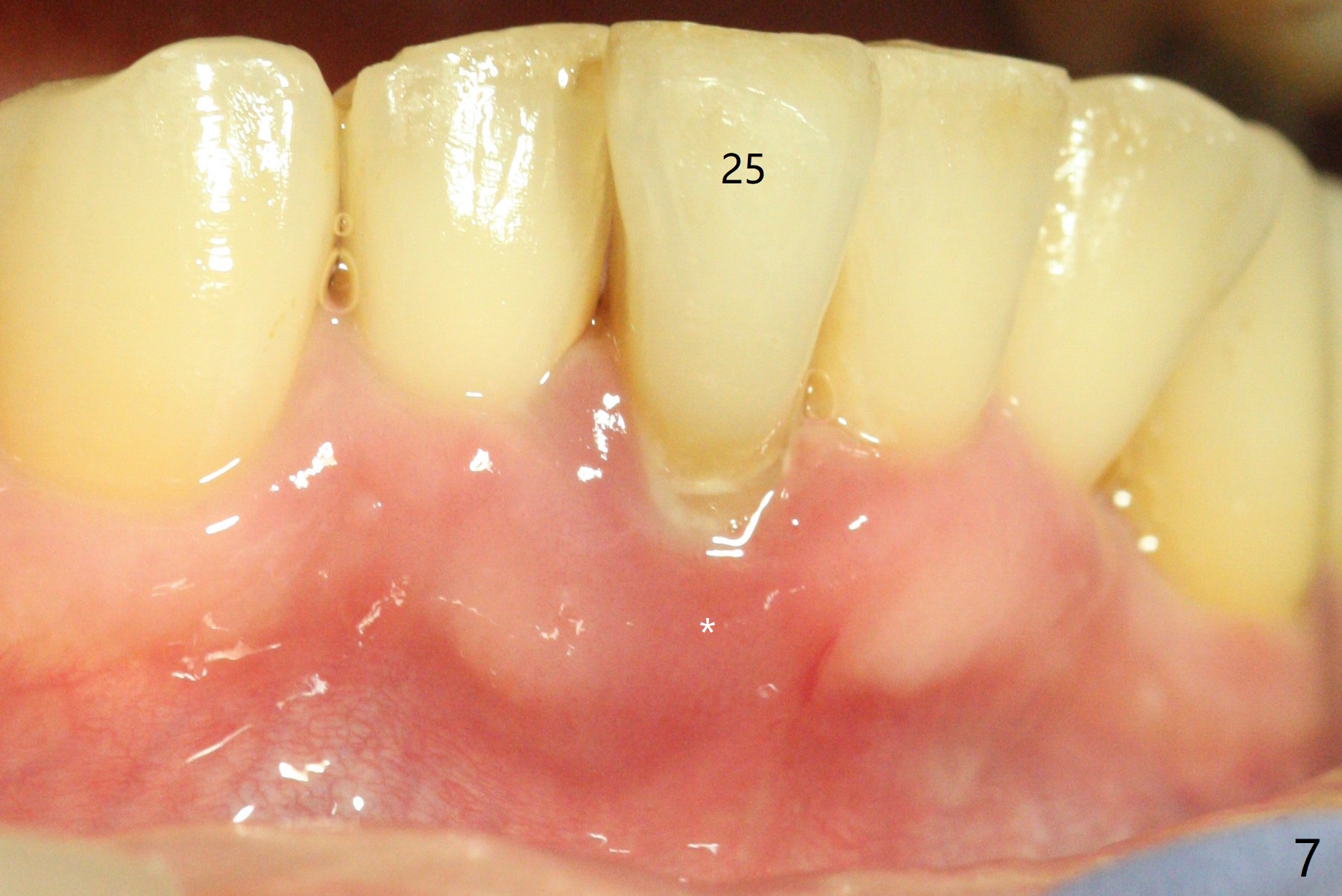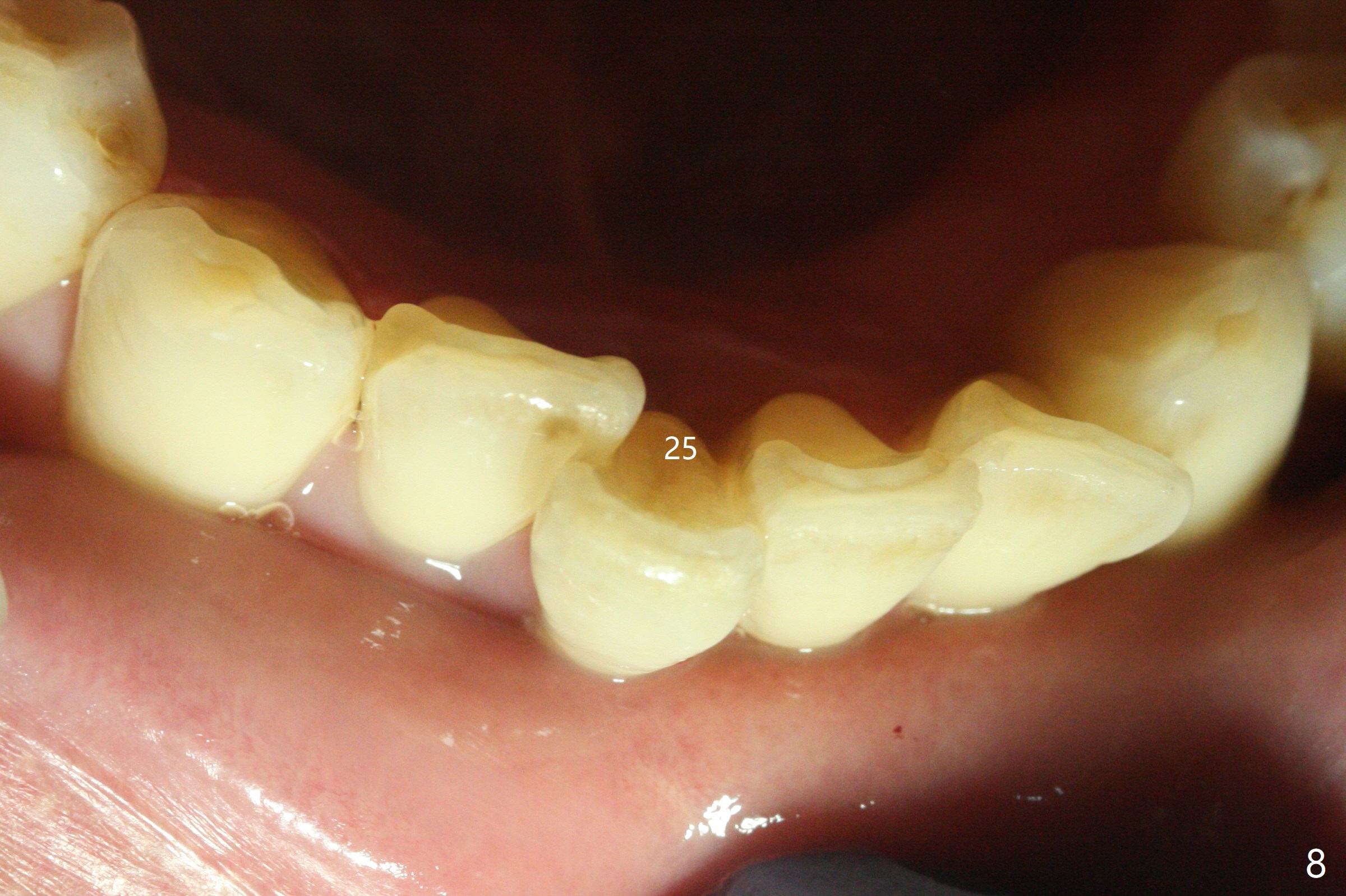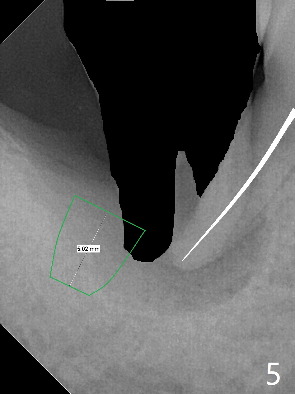 A 47-year-old man, a possible bruxer (Fig.1), is concerned about the mobile 2nd molar and lower central incisor (Fig.2,3). To prevent periimplantitis, a 2 mm 1-piece implant and a short one (5x5 mm) will be placed subcrestal at these sites, respectively (Fig.4,5). Sticky bone is a must. Pulpal test will determine whether RCT is required for #30 (Fig.5 curved white line). In fact the tooth #30 is tested to be vital. Onlay graft is an option for #31 (Fig.6 red rectangle). There is history of #32 extraction. The severely periodontally affected tooth #25 (Fig.7 *) has narrow mesiodistal space (Fig.8). It is the best treated with extraction with bone graft and self drifting.