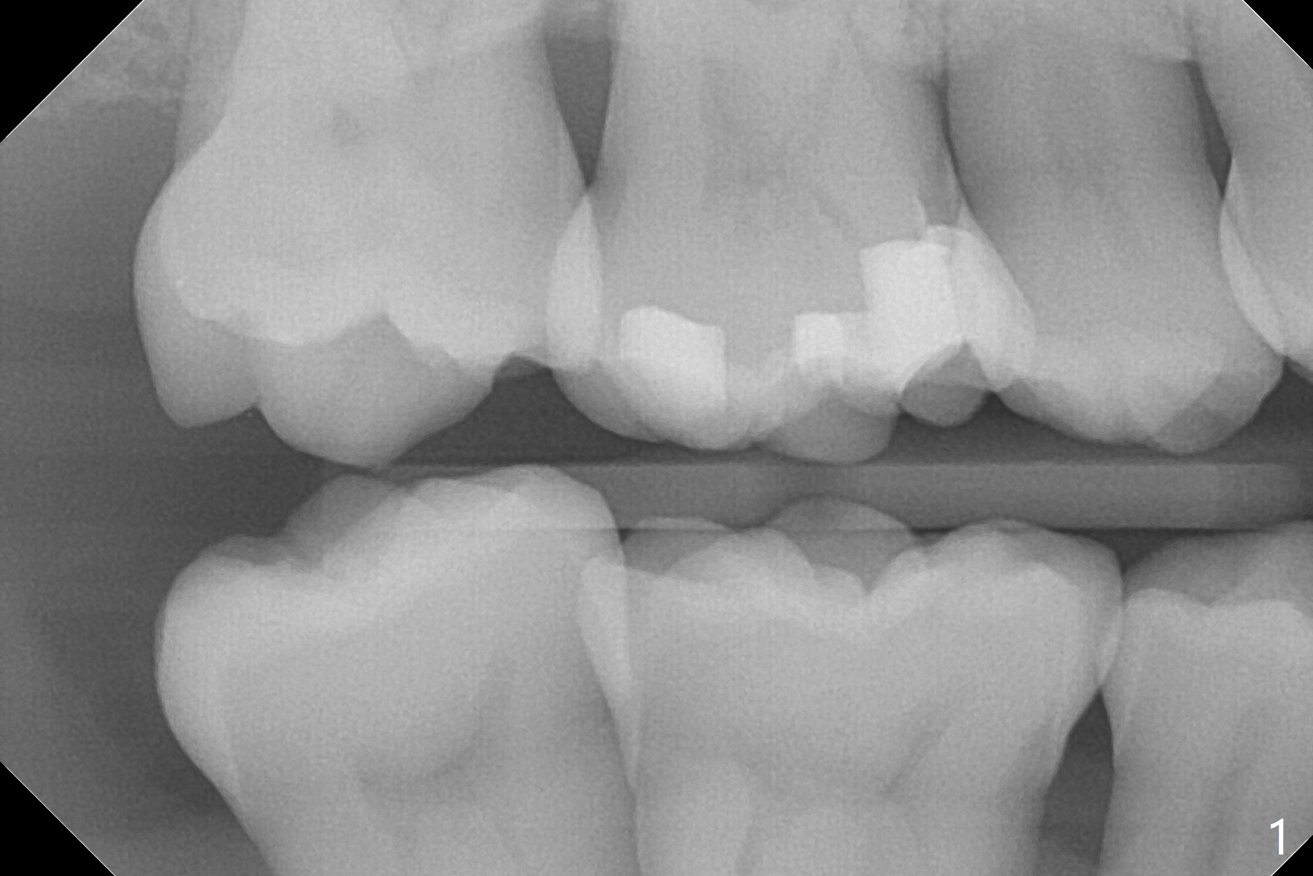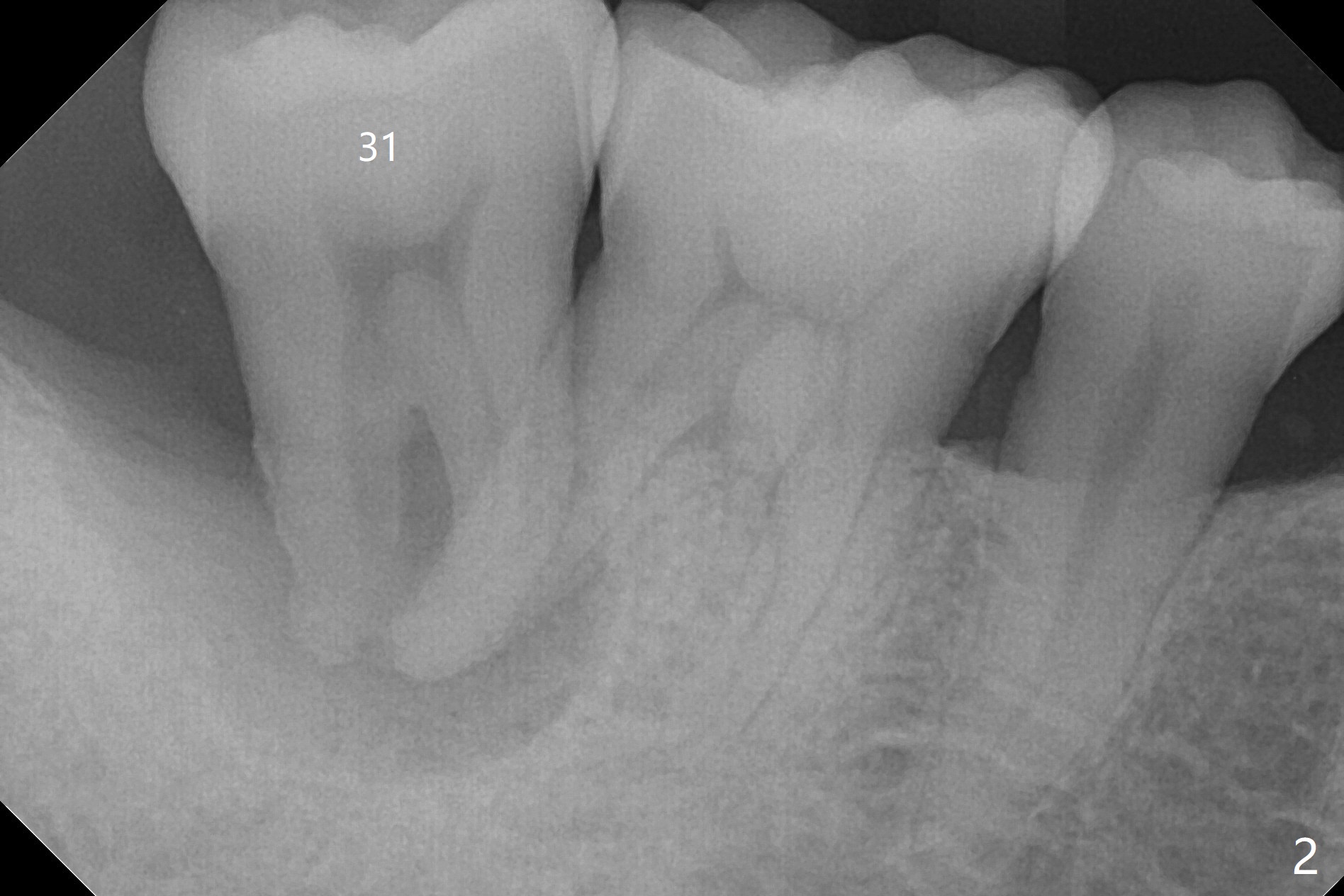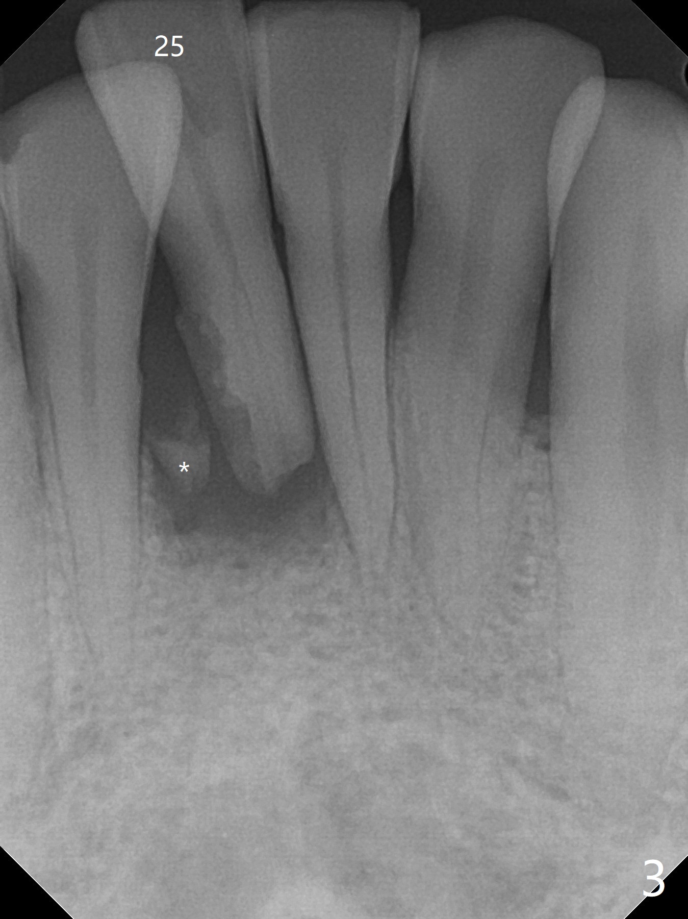 A 47-year-old man, a possible bruxer (Fig.1), is concerned about the mobile 2nd molar and lower central incisor (Fig.2,3). To prevent periimplantitis, a 2 mm 1-piece implant and a short one (5x5 mm) will be placed subcrestal at these sites, respectively (Fig.4,5). Sticky bone is a must. Pulpal test will determine whether RCT is required for #30 (Fig.5 curved white line). In fact the tooth #30 is tested to be vital. Onlay graft is an option for #31 (Fig.6 red rectangle). There is history of #32 extraction. The severely periodontally affected tooth #25 (Fig.7 *) has narrow mesiodistal space (Fig.8). It is the best treated with extraction with bone graft and self drifting.