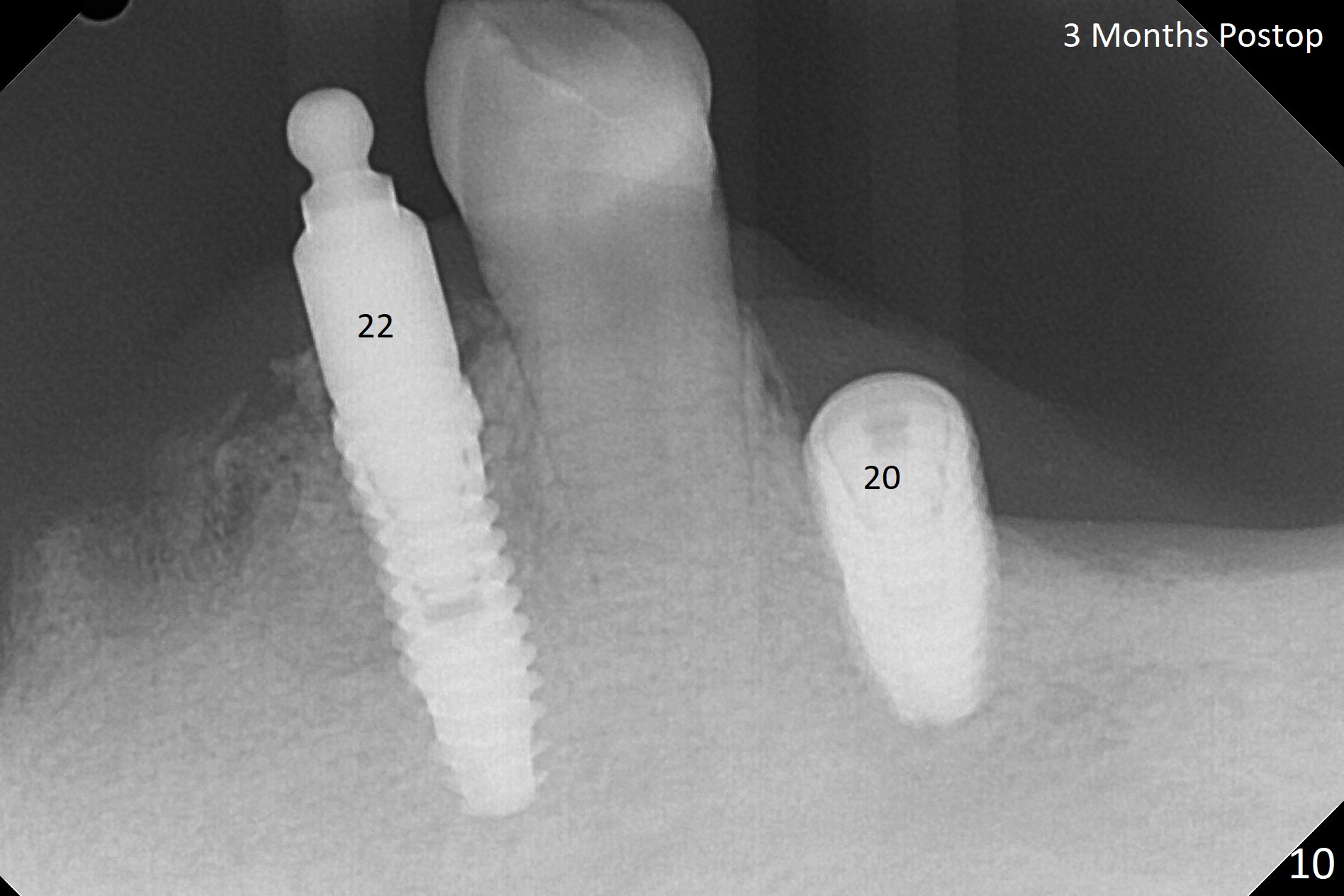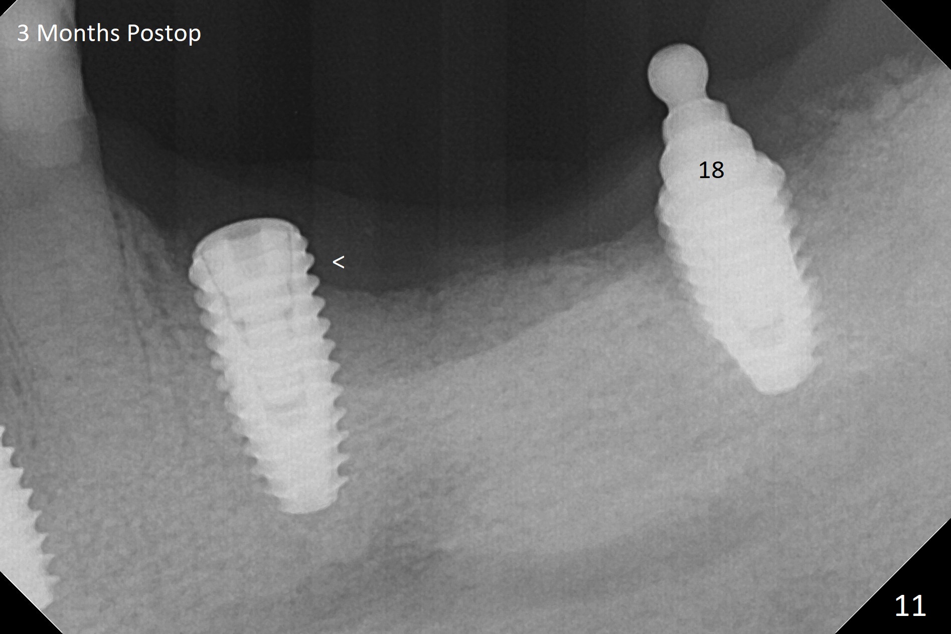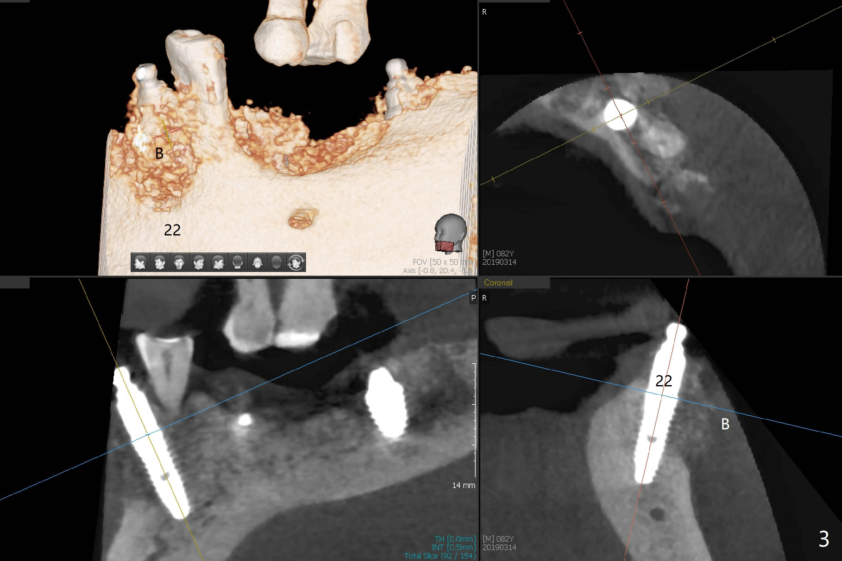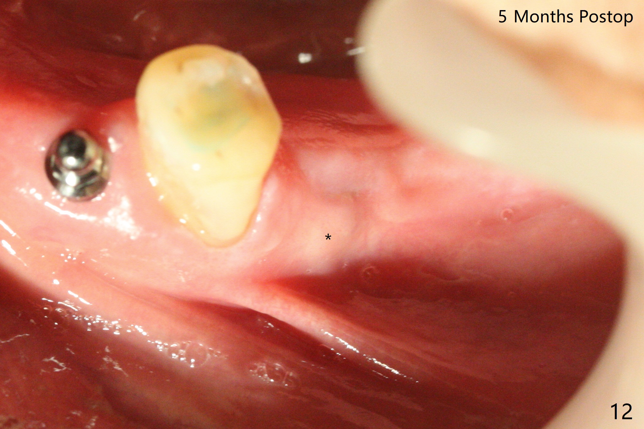 Three months post socket preservation (with buccal plate loss previously), a 3.5x11.5 mm implant is placed at #27 subcrestal (Fig.1). When implants are placed at #22 and 20 (Fig.2,4), threads are exposed buccal (B). Mixture of autogenous bone and allograft is placed to cover the exposed threads (Fig.3,5) following deep placement at #20. For safety, the implant at #20 is buried. Pain control at #18 is poor when initial osteotomy is being established (Fig.6 *), as related to severe infection. Repeated block anesthesia allows to finish implant placement with primary stability; a 3.5x2 mm ball abutment is placed (Fig.7). With placement of 2 other ball abutments at #27 and 22 (Fig.3), the lower existing RPD is converted to a removable provisional (Fig.8). With addition of acrylic, the socket of #20 is covered (Fig.9). There is no apparent bone #20 distal 3 months postop (Fig.10,11 <). Re-graft is needed? The implant at #21 appears immediately subgingival 5 months postop (Fig.12 *). The distobuccal threads are exposed (Fig.13). After decortication, allograft is placed, followed by 6-month membrane. In fact, a shorter and smaller implant should be placed instead. The patient has to wear the RPD for mastication. It would be more painful without it. Later the tissue surface of the RPD is trimmed.