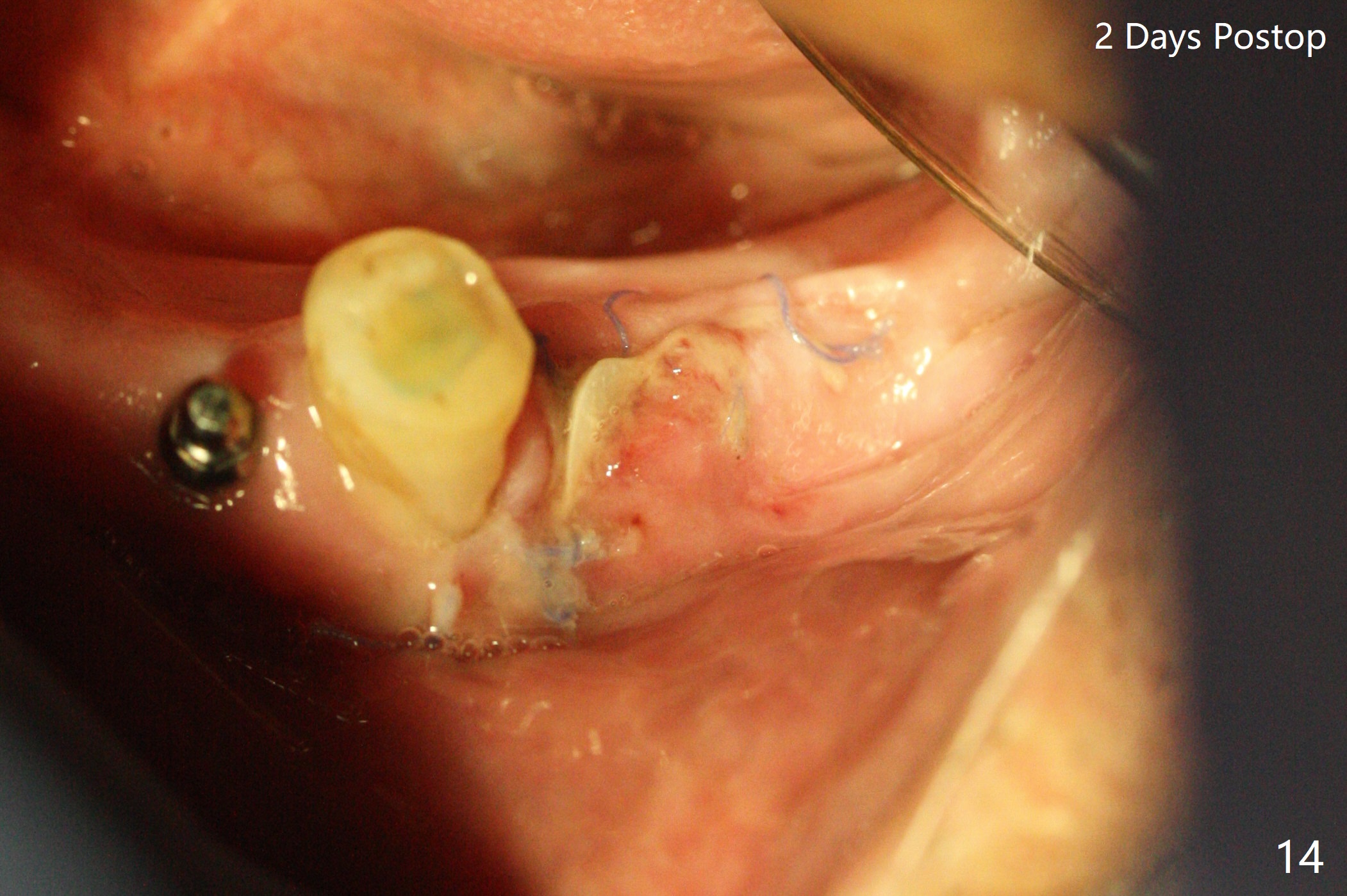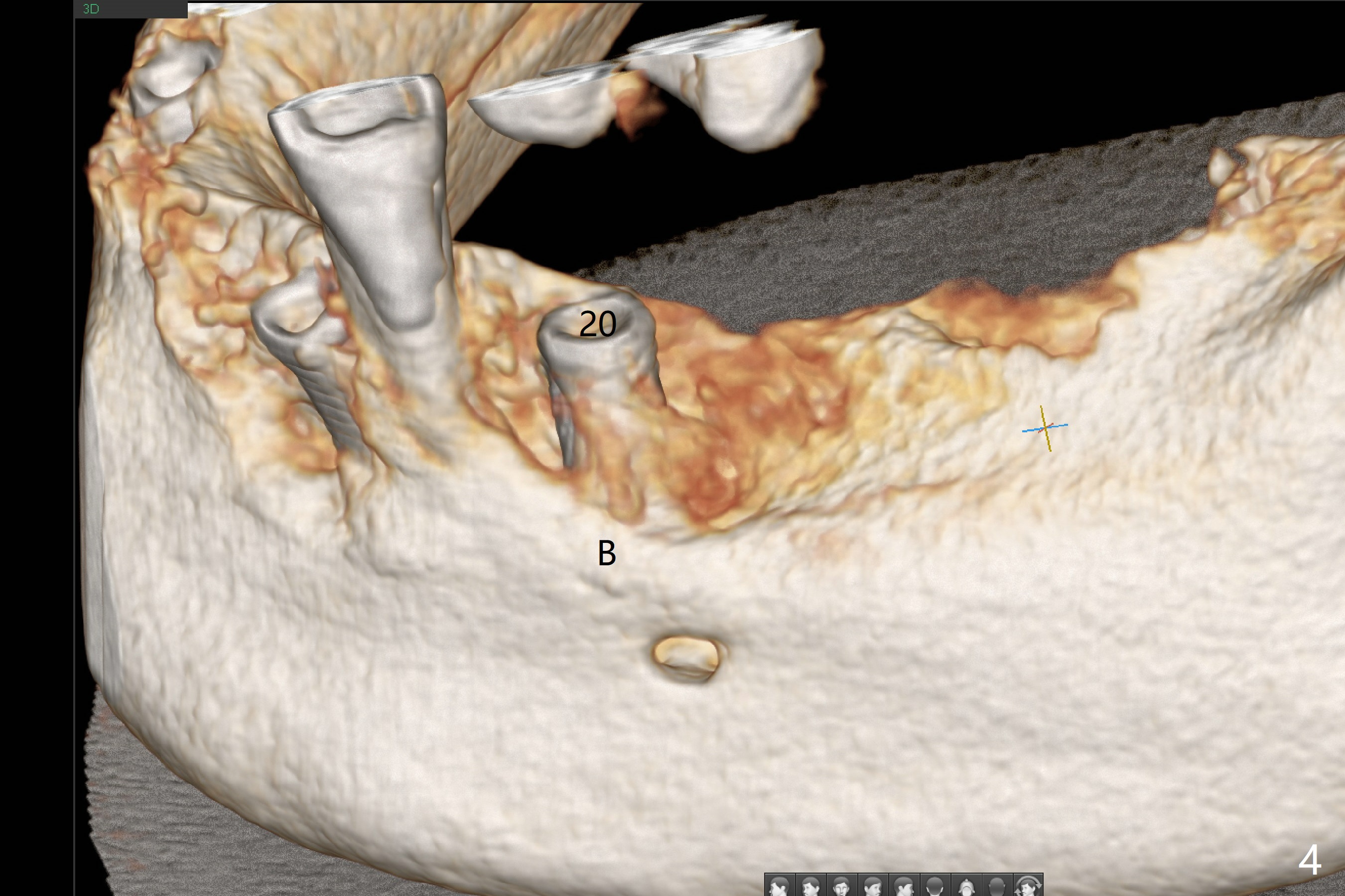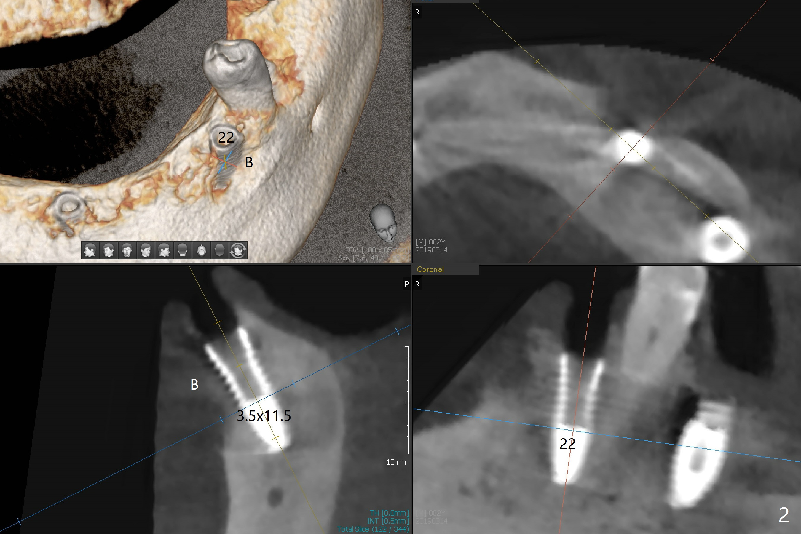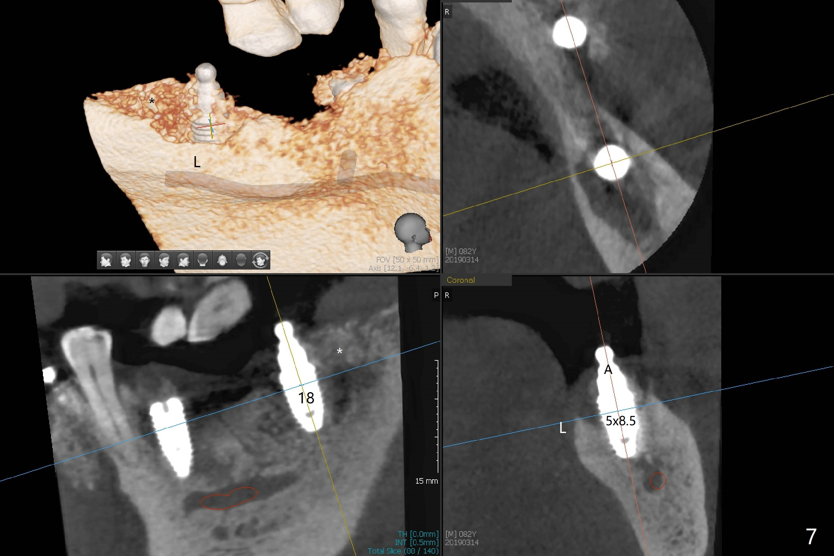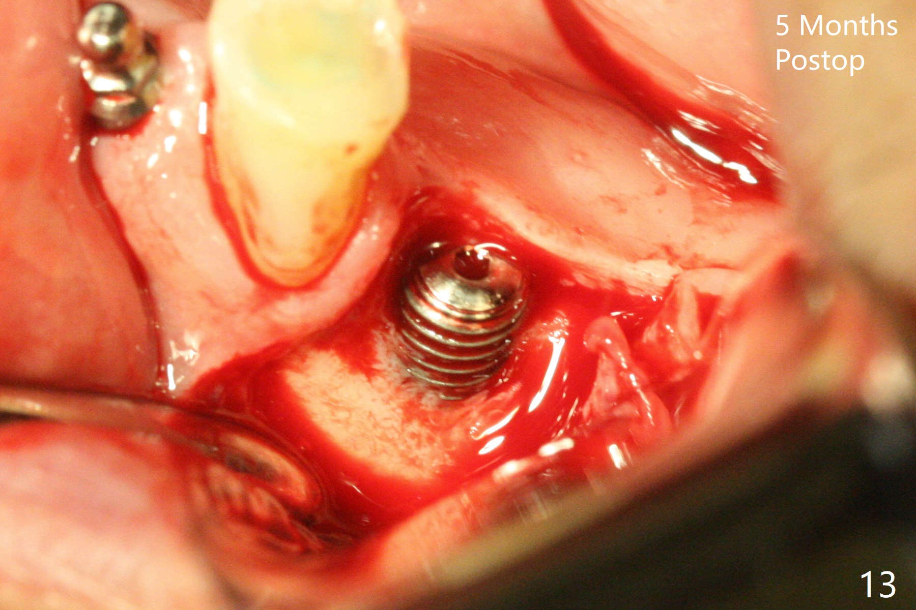 Three months post socket preservation (with buccal plate loss previously), a 3.5x11.5 mm implant is placed at #27 subcrestal (Fig.1). When implants are placed at #22 and 20 (Fig.2,4), threads are exposed buccal (B). Mixture of autogenous bone and allograft is placed to cover the exposed threads (Fig.3,5) following deep placement at #20. For safety, the implant at #20 is buried. Pain control at #18 is poor when initial osteotomy is being established (Fig.6 *), as related to severe infection. Repeated block anesthesia allows to finish implant placement with primary stability; a 3.5x2 mm ball abutment is placed (Fig.7). With placement of 2 other ball abutments at #27 and 22 (Fig.3), the lower existing RPD is converted to a removable provisional (Fig.8). With addition of acrylic, the socket of #20 is covered (Fig.9). There is no apparent bone #20 distal 3 months postop (Fig.10,11 <). Re-graft is needed? The implant at #21 appears immediately subgingival 5 months postop (Fig.12 *). The distobuccal threads are exposed (Fig.13). After decortication, allograft is placed, followed by 6-month membrane. In fact, a shorter and smaller implant should be placed instead. The patient has to wear the RPD for mastication. It would be more painful without it. Later the tissue surface of the RPD is trimmed.