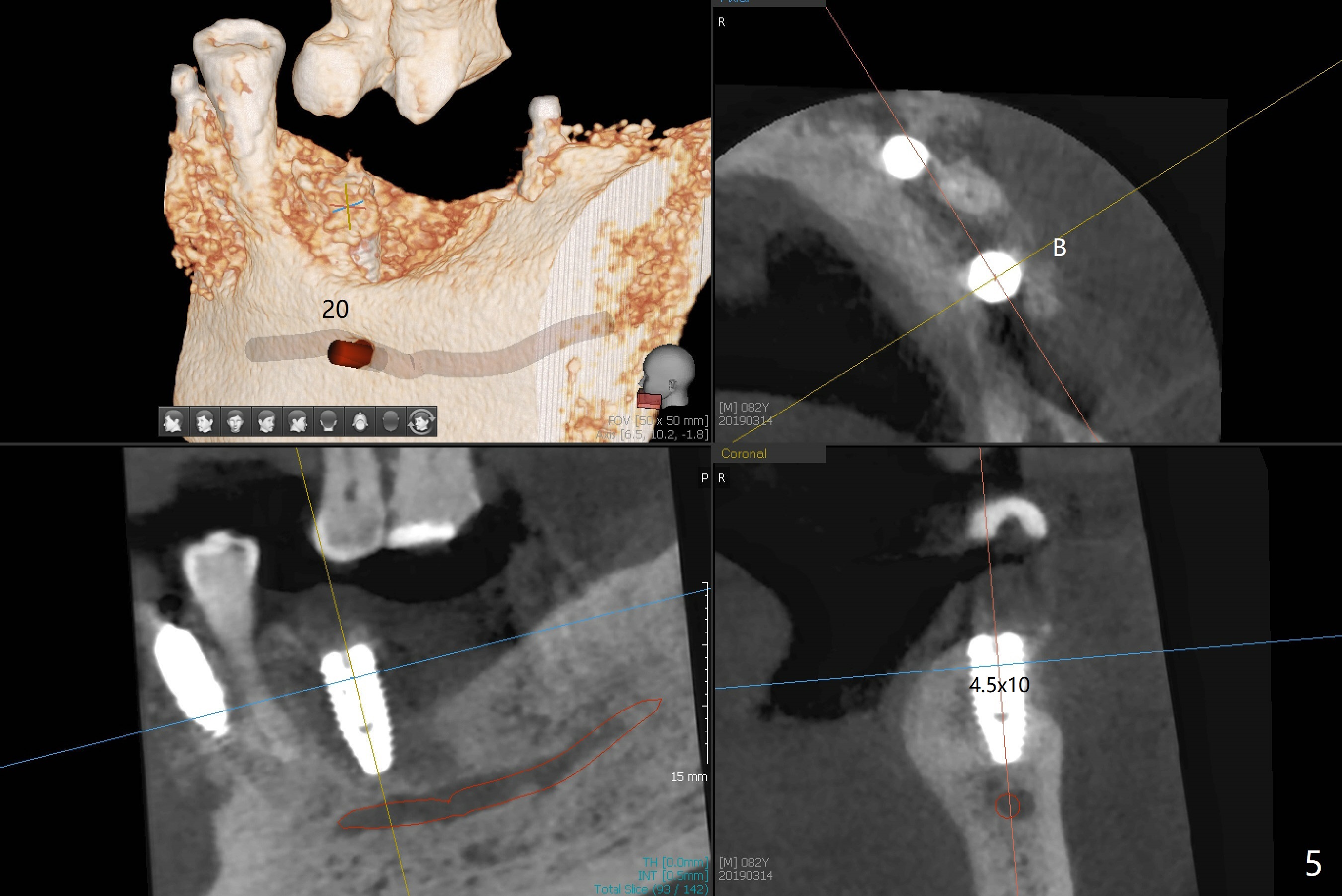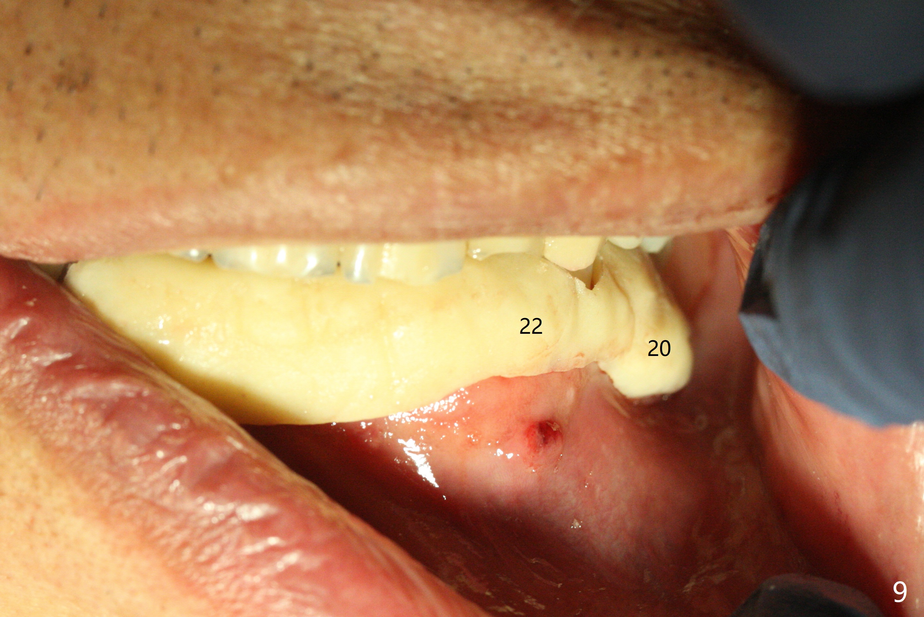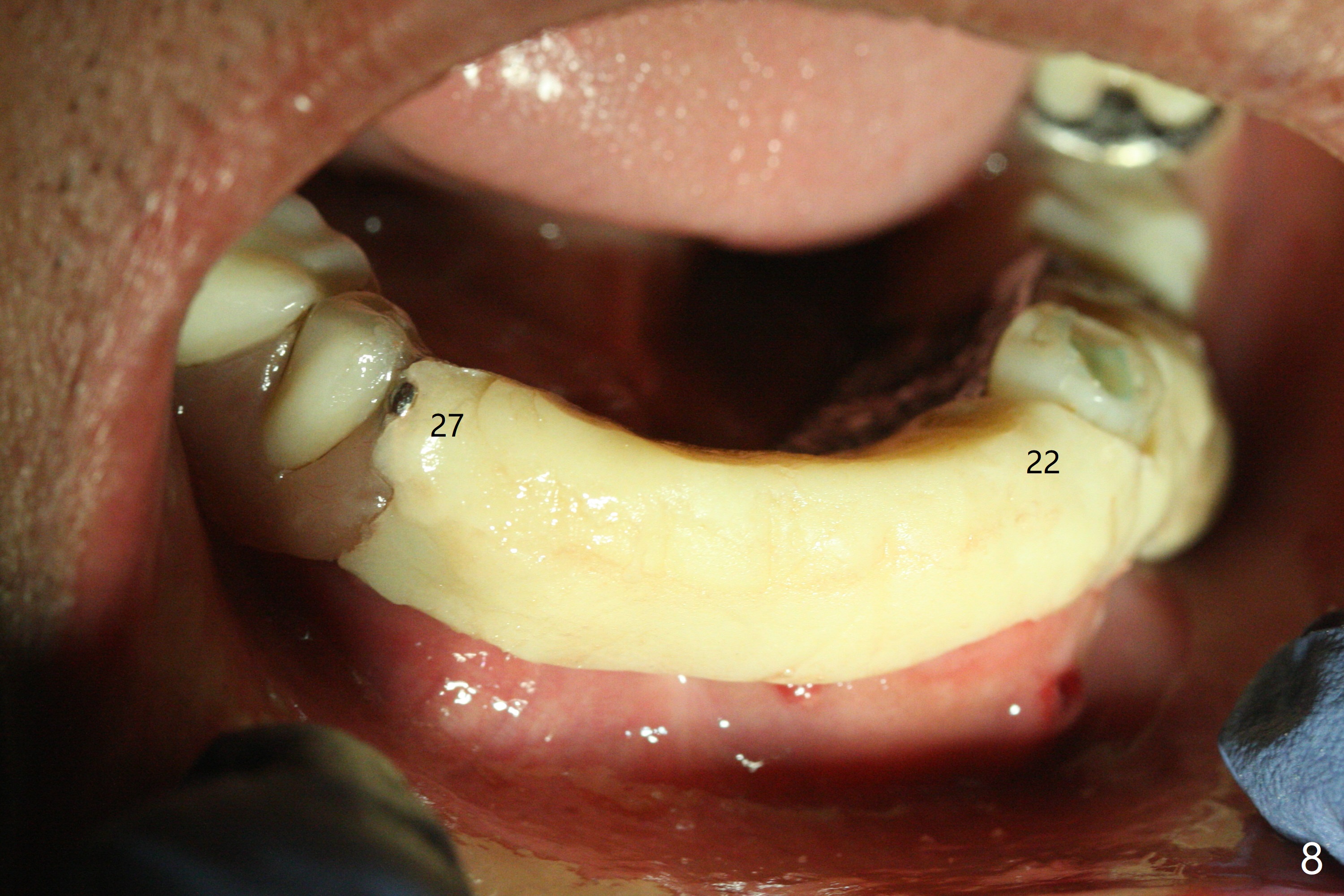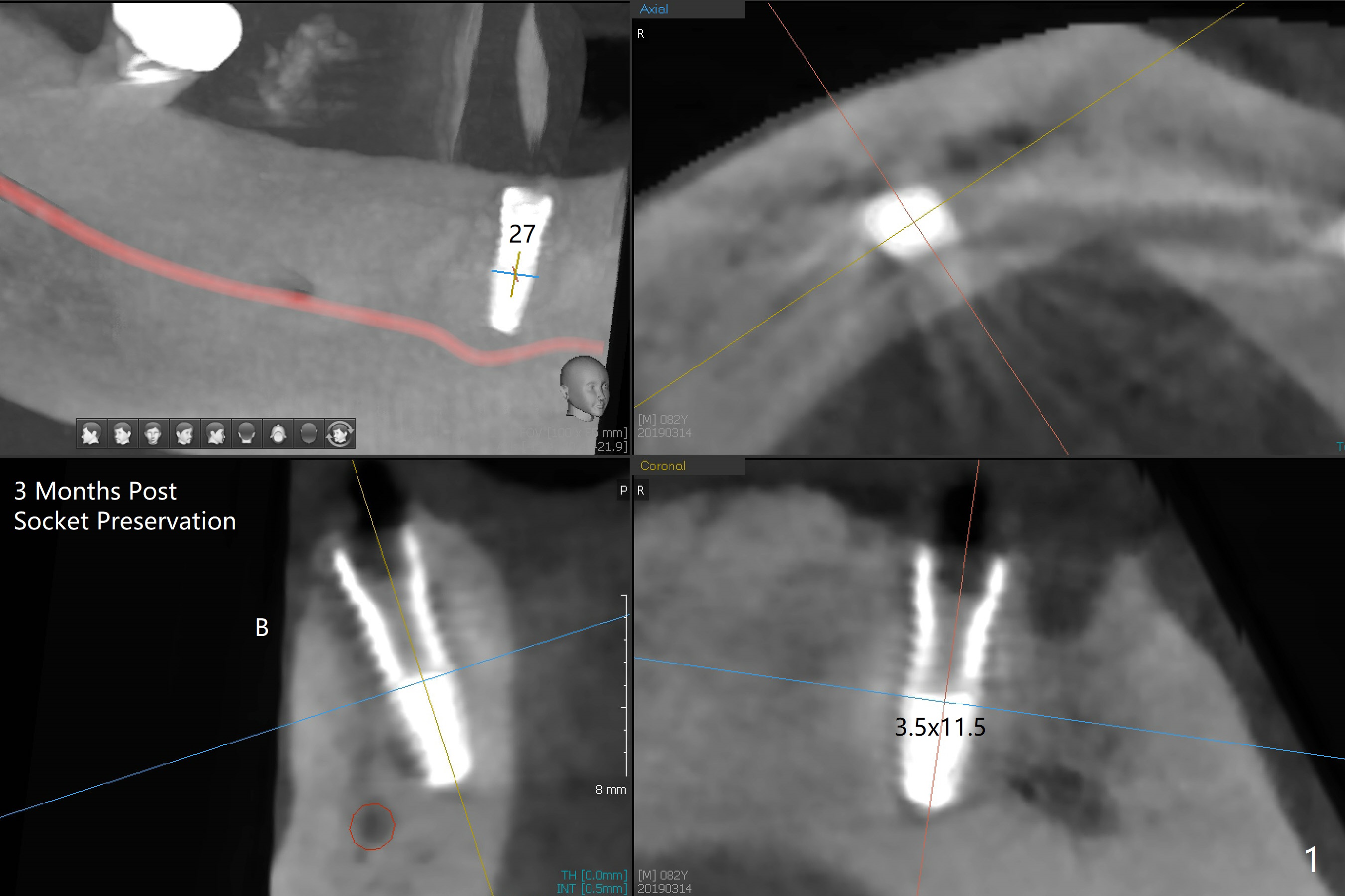 Three months post socket preservation (with buccal plate loss previously), a 3.5x11.5 mm implant is placed at #27 subcrestal (Fig.1). When implants are placed at #22 and 20 (Fig.2,4), threads are exposed buccal (B). Mixture of autogenous bone and allograft is placed to cover the exposed threads (Fig.3,5) following deep placement at #20. For safety, the implant at #20 is buried. Pain control at #18 is poor when initial osteotomy is being established (Fig.6 *), as related to severe infection. Repeated block anesthesia allows to finish implant placement with primary stability; a 3.5x2 mm ball abutment is placed (Fig.7). With placement of 2 other ball abutments at #27 and 22 (Fig.3), the lower existing RPD is converted to a removable provisional (Fig.8). With addition of acrylic, the socket of #20 is covered (Fig.9). There is no apparent bone #20 distal 3 months postop (Fig.10,11 <). Re-graft is needed? The implant at #21 appears immediately subgingival 5 months postop (Fig.12 *). The distobuccal threads are exposed (Fig.13). After decortication, allograft is placed, followed by 6-month membrane. In fact, a shorter and smaller implant should be placed instead. The patient has to wear the RPD for mastication. It would be more painful without it. Later the tissue surface of the RPD is trimmed.