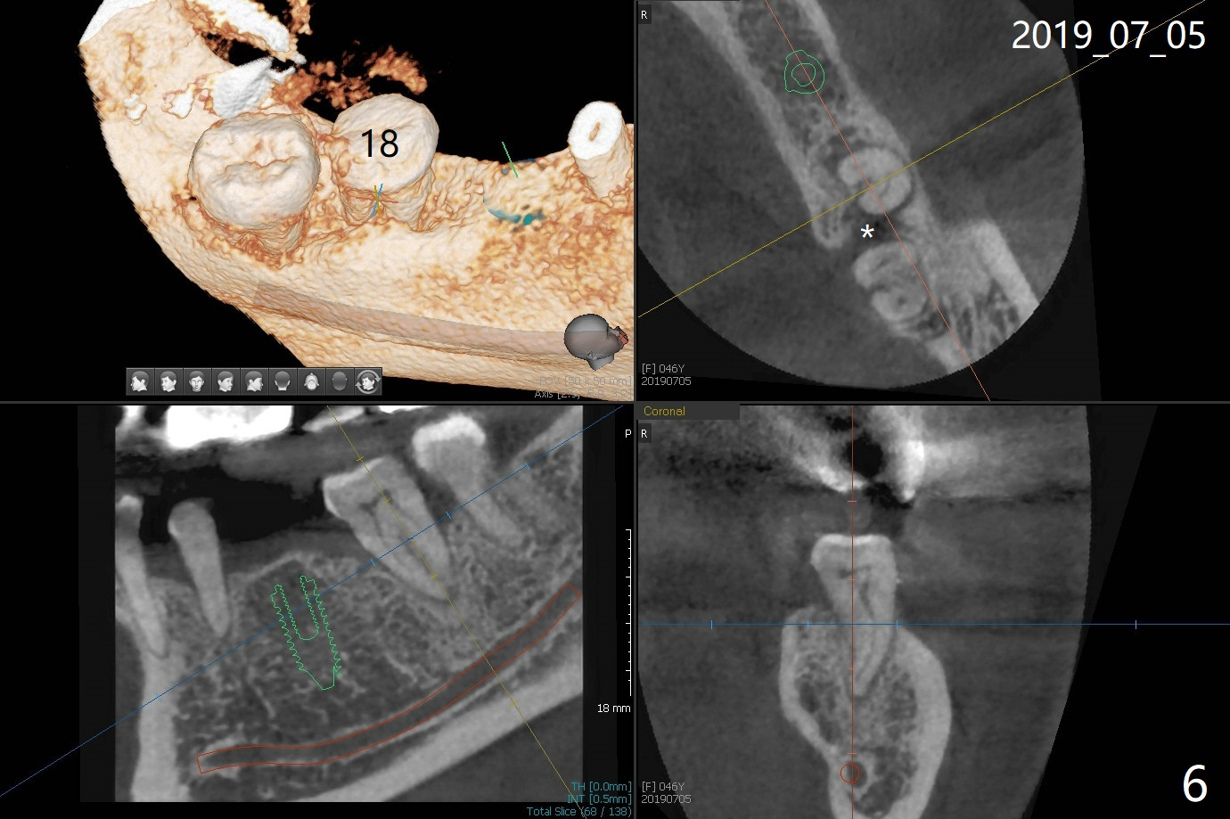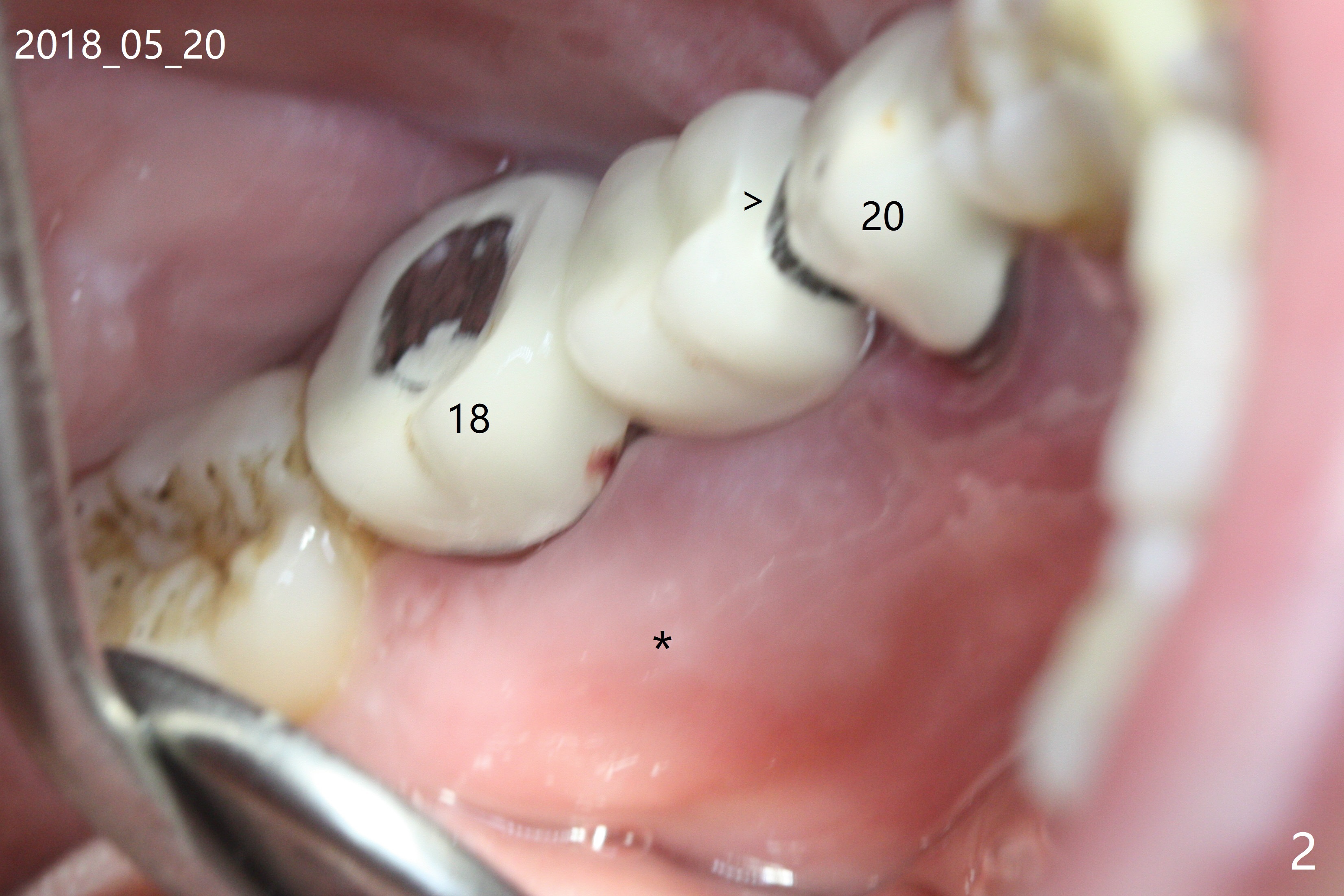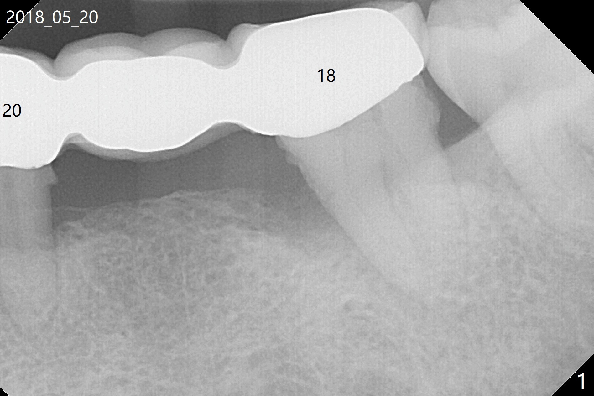 A 46-year-old woman had severe periodontal abscess lingual to #18-20 FPD a year ago (Fig.1,2 *). After SRP and Arestin placement #18 ML, the FPD was sectioned (Fig.2 >) to determine which abutment is to be extracted for implant. Since the sectioning, the patient has been unable to masticate on the left side (Fig.3). With removal of the FPD, CT is taken for surgical guide. Are the abutments salvageable (Fig.4,6)?