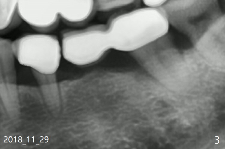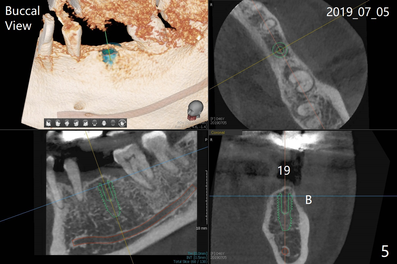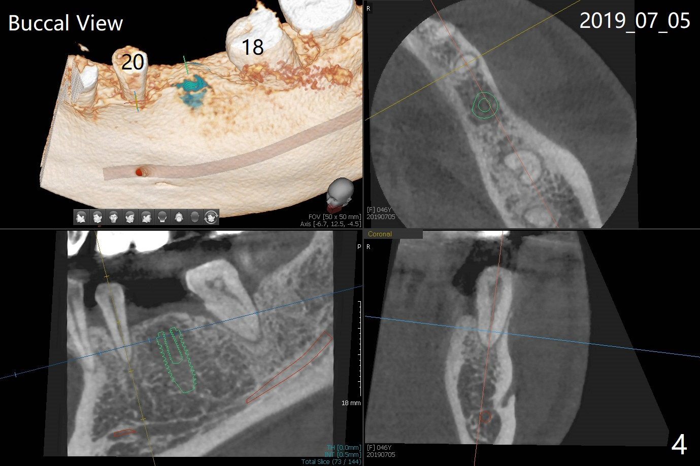 A 46-year-old woman had severe periodontal abscess lingual to #18-20 FPD a year ago (Fig.1,2 *). After SRP and Arestin placement #18 ML, the FPD was sectioned (Fig.2 >) to determine which abutment is to be extracted for implant. Since the sectioning, the patient has been unable to masticate on the left side (Fig.3). With removal of the FPD, CT is taken for surgical guide. Are the abutments salvageable (Fig.4,6)?