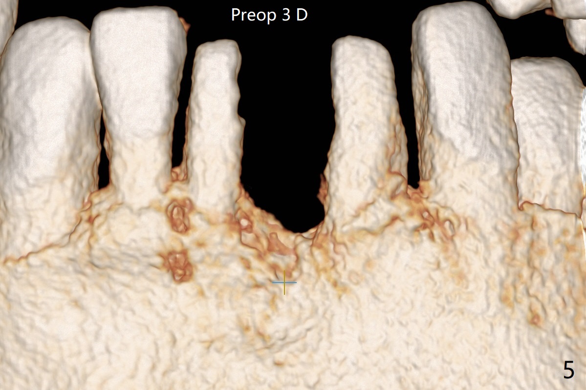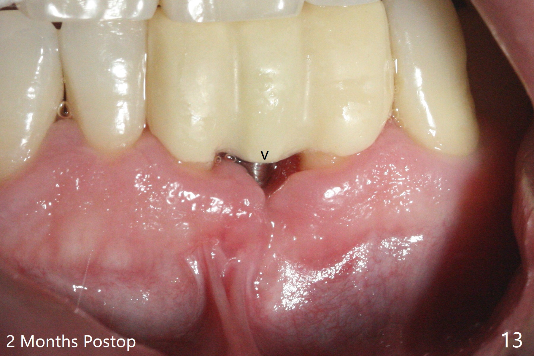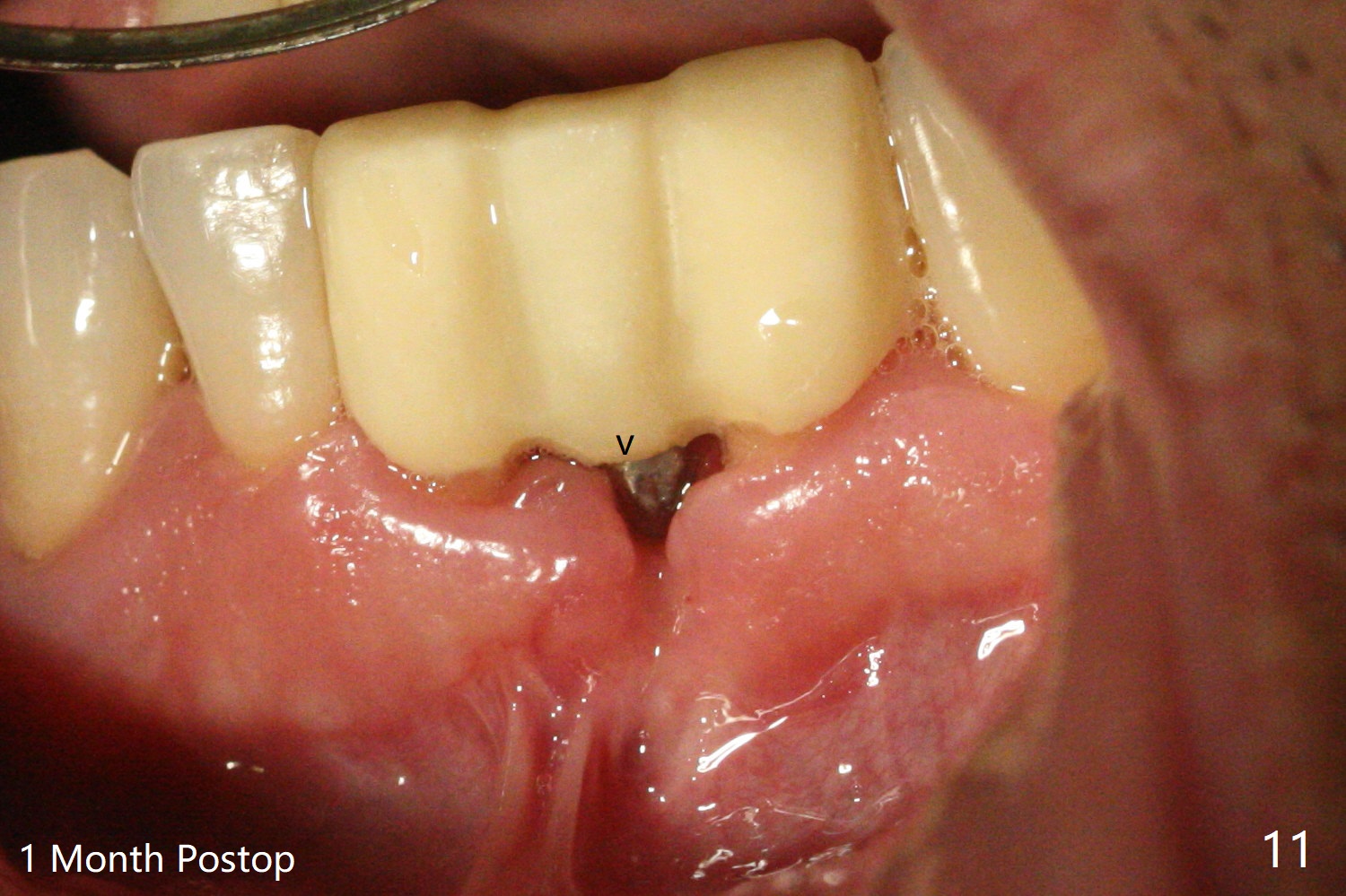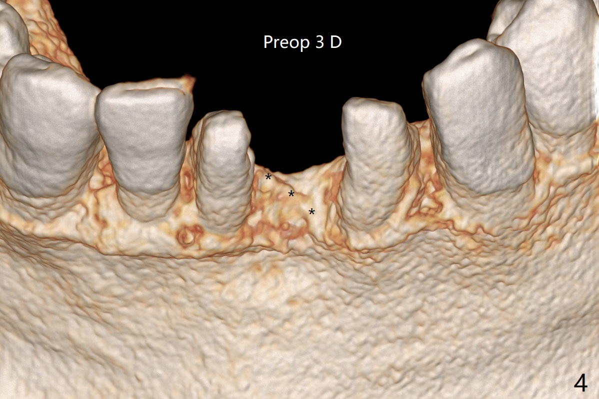 经过深洗以及改善口腔卫生,术前下前牙区牙龈基本没有红肿,但是缺牙处牙龈凹陷(图一,二:箭头),这个现象代表什么?如何影响手术进路?其实后者部分是因为牙龈与下面骨质(骨嵴)粘连(图三:*)产生的,分离粘骨膜瓣时不小心撕裂颊侧牙龈(图三(骨膜分离器下面:#),造成后来缝合困难,需要多用一个胎盘膜)。如果术前仔细分析CT 3D图像(图四,五)可以发现严重颊侧骨壁凹陷(图三:^)以及骨嵴(图四:*),事先抽血制备PRF膜和粘性骨粉,植骨效果好些(图六)。术中发现缺损,再抽血会拖延手术。最后将就用血调袢骨粉,使用胶原膜和胎盘膜覆盖(图七,八)。颊侧裂口术后十天愈合了(图九,十)。术后一个月颊侧牙龈凹陷,牙桥边缘(图十一:箭头)粗糙,临时牙桥取出,调整边缘,有利于局部卫生(图十二)。术后两个月桥边缘光滑(图十三:箭头),局部卫生和牙龈凹陷有所改善。病人将一个半月后回来取模。Return to Protect Graft 前磨牙即种 101 Xin Wei, DDS, PhD, MS 1st edition 04/30/2021, last revision 07/03/2021
