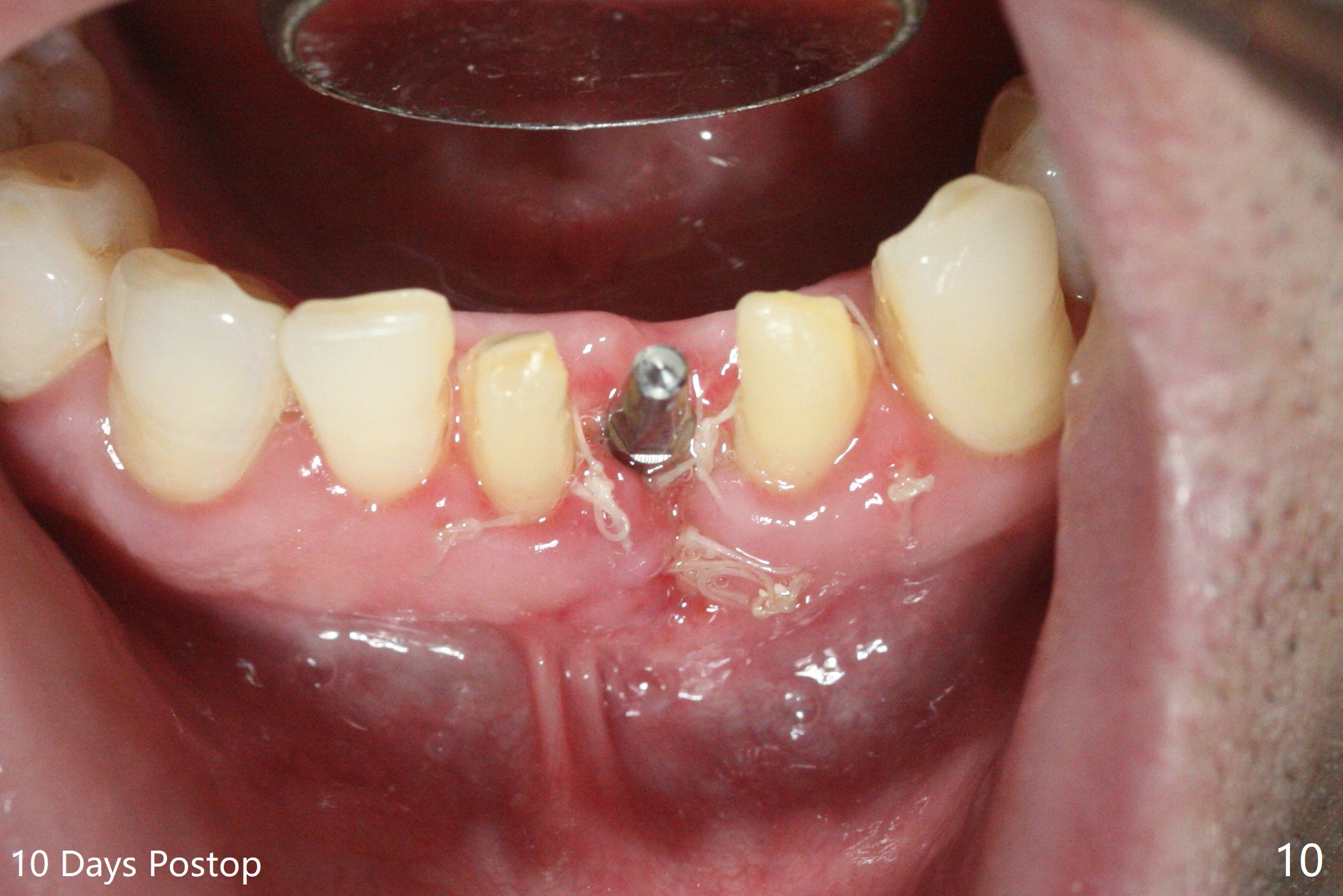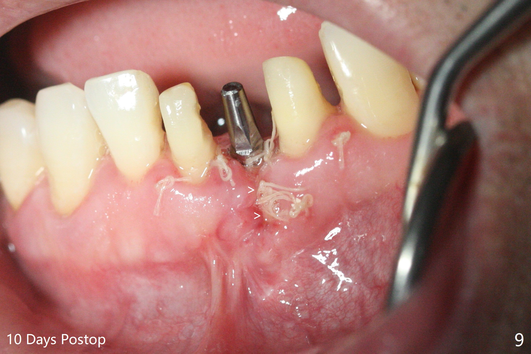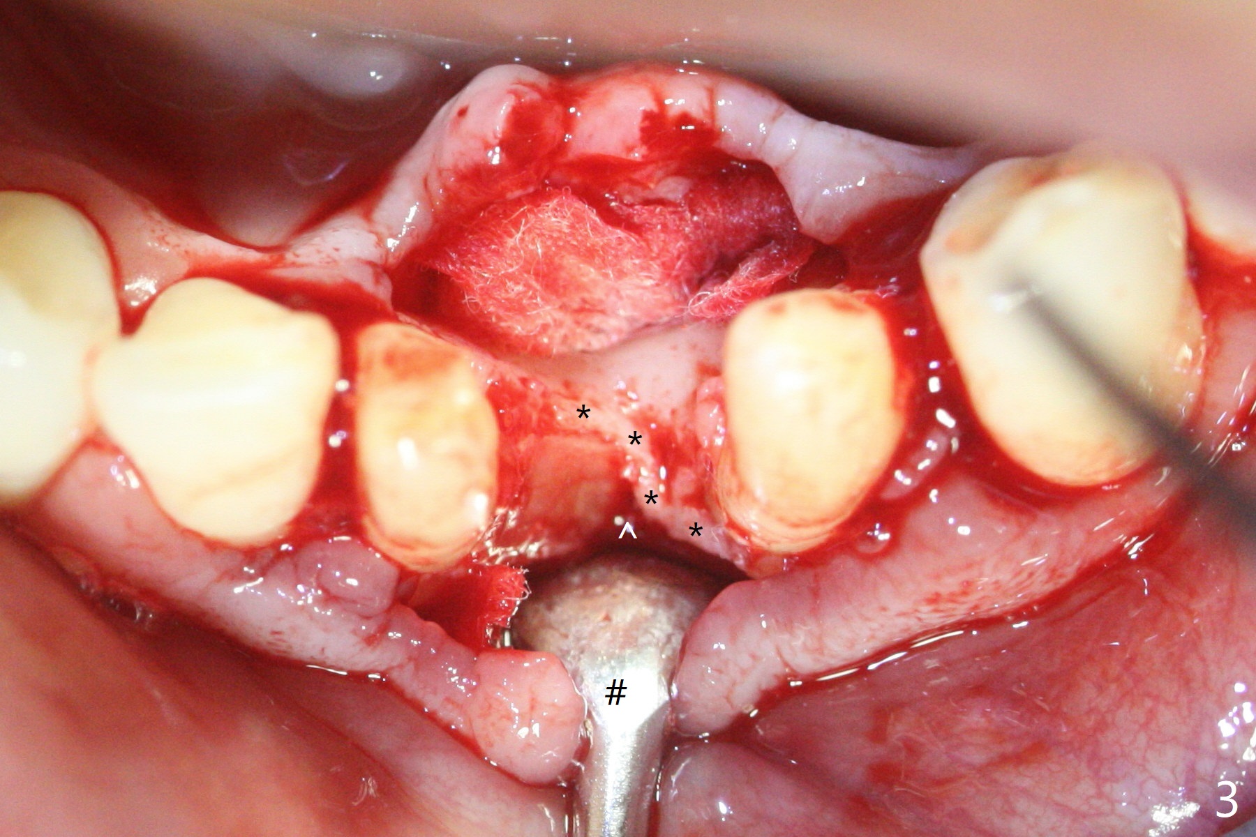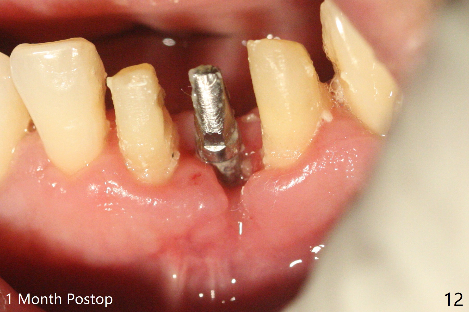 经过深洗以及改善口腔卫生,术前下前牙区牙龈基本没有红肿,但是缺牙处牙龈凹陷(图一,二:箭头),这个现象代表什么?如何影响手术进路?其实后者部分是因为牙龈与下面骨质(骨嵴)粘连(图三:*)产生的,分离粘骨膜瓣时不小心撕裂颊侧牙龈(图三(骨膜分离器下面:#),造成后来缝合困难,需要多用一个胎盘膜)。如果术前仔细分析CT 3D图像(图四,五)可以发现严重颊侧骨壁凹陷(图三:^)以及骨嵴(图四:*),事先抽血制备PRF膜和粘性骨粉,植骨效果好些(图六)。术中发现缺损,再抽血会拖延手术。最后将就用血调袢骨粉,使用胶原膜和胎盘膜覆盖(图七,八)。颊侧裂口术后十天愈合了(图九,十)。术后一个月颊侧牙龈凹陷,牙桥边缘(图十一:箭头)粗糙,临时牙桥取出,调整边缘,有利于局部卫生(图十二)。术后两个月桥边缘光滑(图十三:箭头),局部卫生和牙龈凹陷有所改善。病人将一个半月后回来取模。Return to Protect Graft 前磨牙即种 101 Xin Wei, DDS, PhD, MS 1st edition 04/30/2021, last revision 07/03/2021