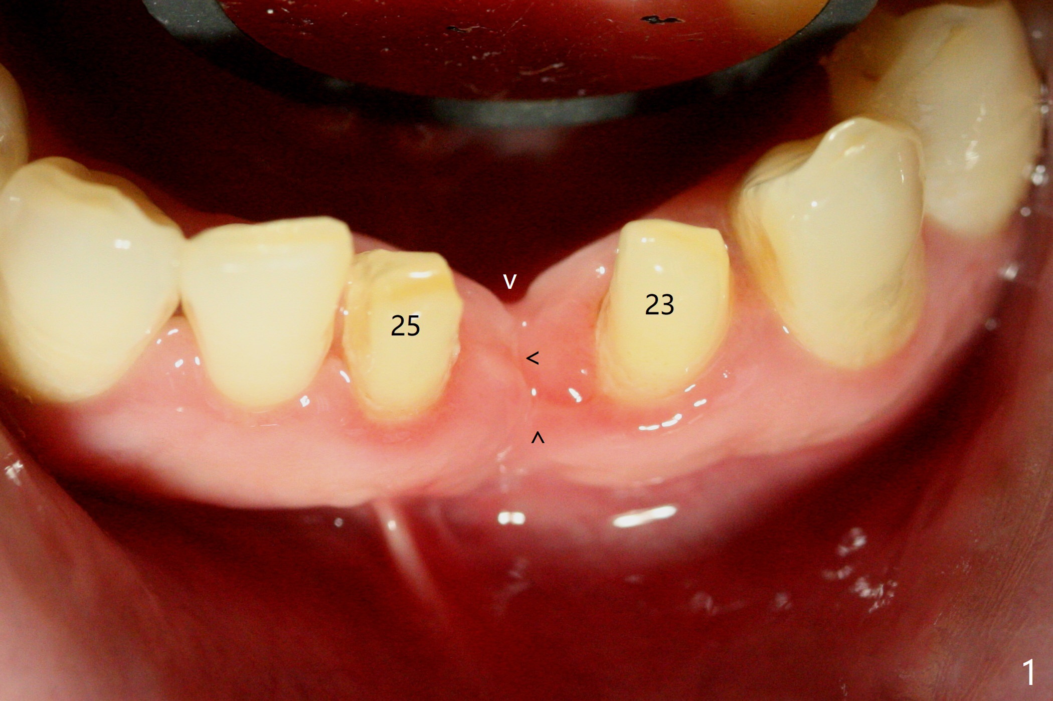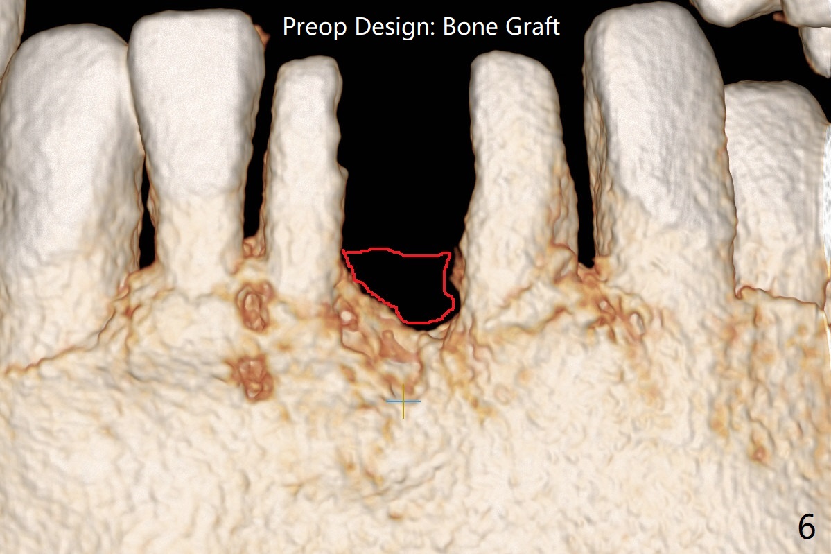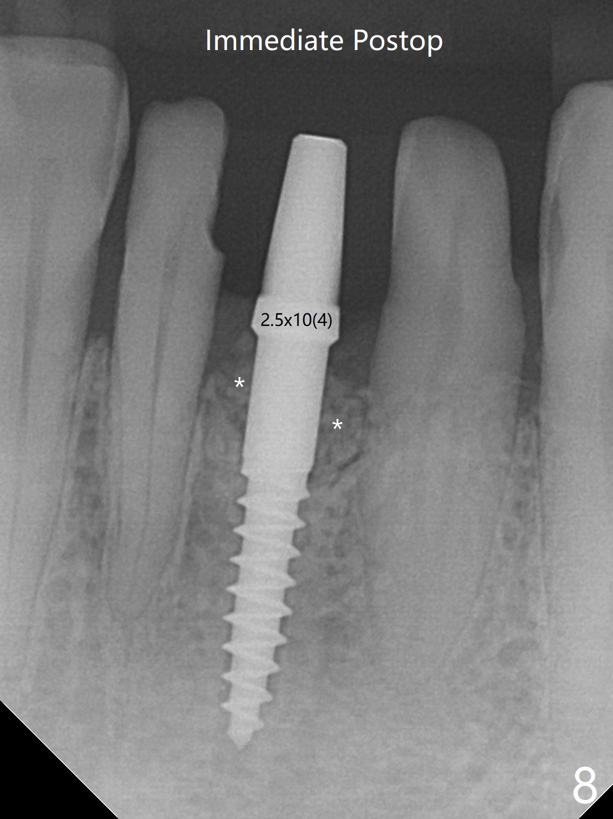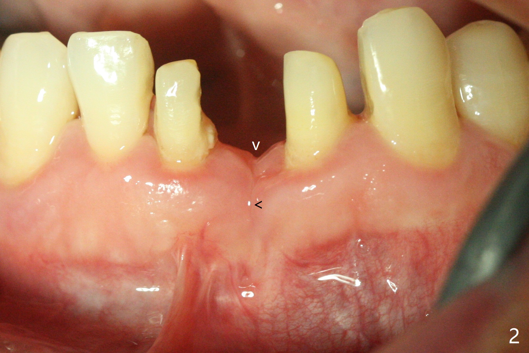 经过深洗以及改善口腔卫生,术前下前牙区牙龈基本没有红肿,但是缺牙处牙龈凹陷(图一,二:箭头),这个现象代表什么?如何影响手术进路?其实后者部分是因为牙龈与下面骨质(骨嵴)粘连(图三:*)产生的,分离粘骨膜瓣时不小心撕裂颊侧牙龈(图三(骨膜分离器下面:#),造成后来缝合困难,需要多用一个胎盘膜)。如果术前仔细分析CT 3D图像(图四,五)可以发现严重颊侧骨壁凹陷(图三:^)以及骨嵴(图四:*),事先抽血制备PRF膜和粘性骨粉,植骨效果好些(图六)。术中发现缺损,再抽血会拖延手术。最后将就用血调袢骨粉,使用胶原膜和胎盘膜覆盖(图七,八)。颊侧裂口术后十天愈合了(图九,十)。术后一个月颊侧牙龈凹陷,牙桥边缘(图十一:箭头)粗糙,临时牙桥取出,调整边缘,有利于局部卫生(图十二)。术后两个月桥边缘光滑(图十三:箭头),局部卫生和牙龈凹陷有所改善。病人将一个半月后回来取模。Return to Protect Graft 前磨牙即种 101 Xin Wei, DDS, PhD, MS 1st edition 04/30/2021, last revision 07/03/2021