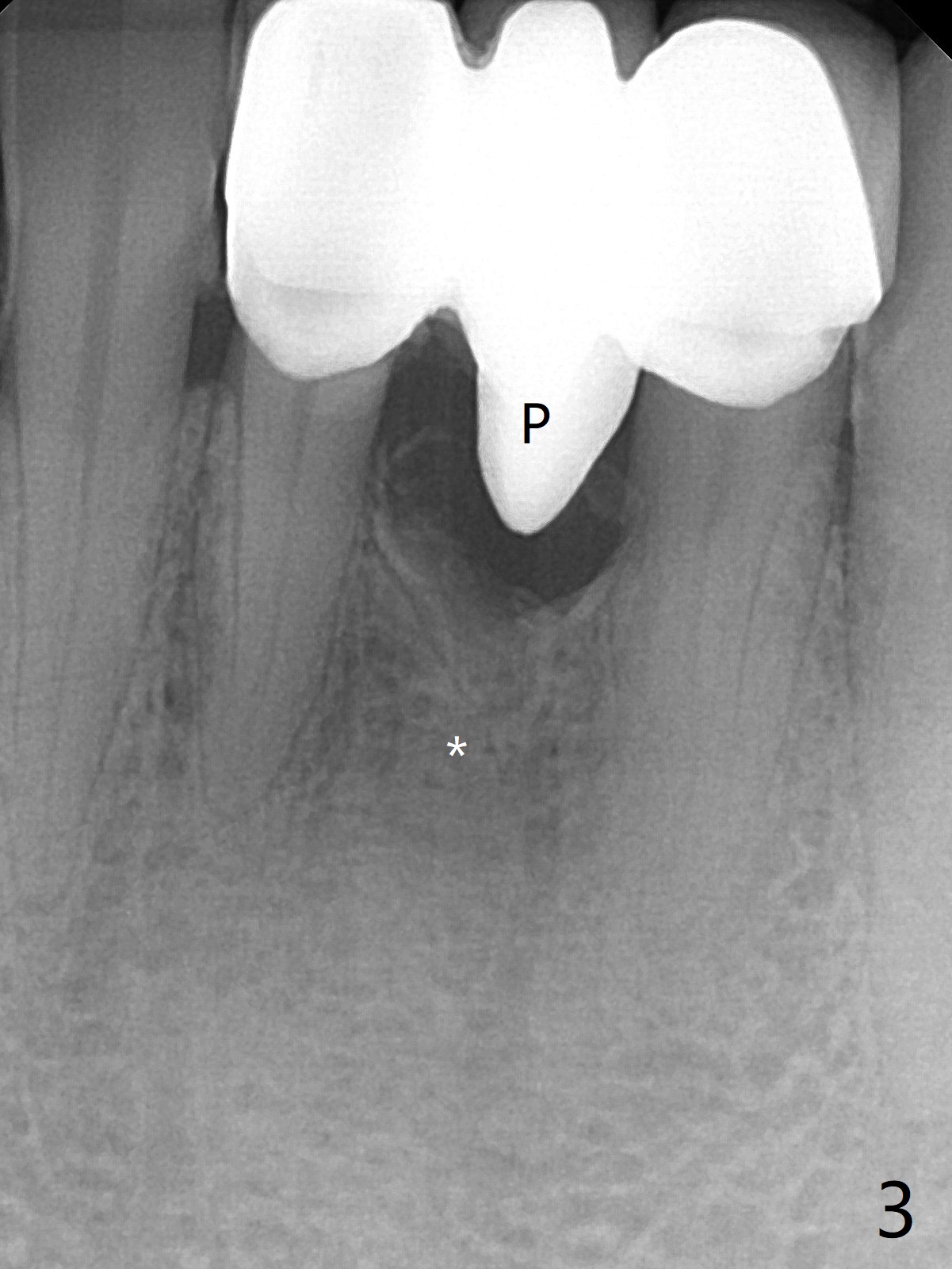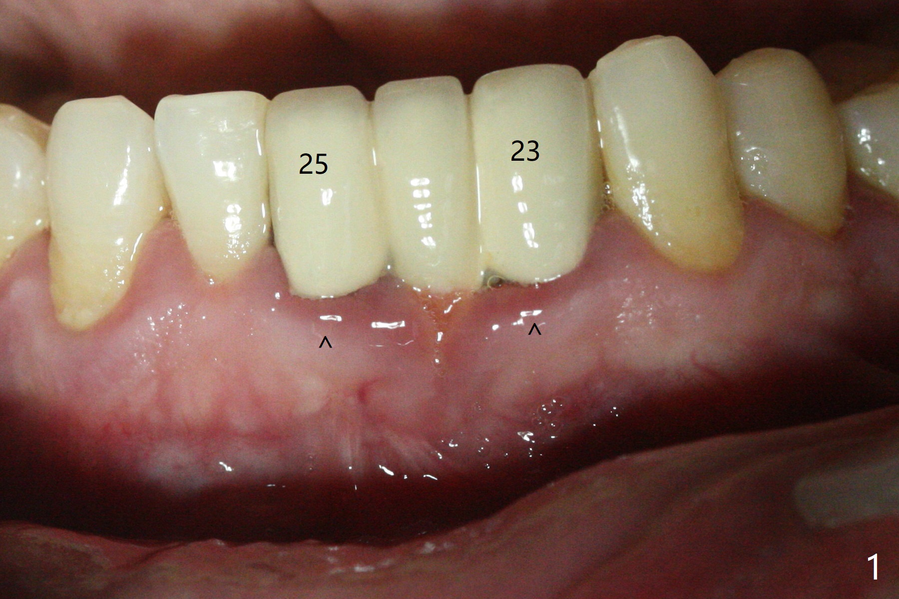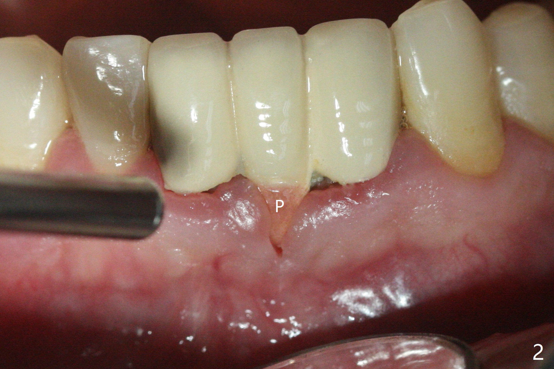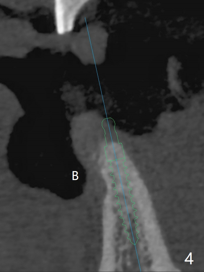 A 38-year-old man has gingival erythema and edema associated with #23-25 bridge (Fig.1). The most abnormal finding is the long pink porcelain at the pontic (Fig.2, 3: P). After taking Alginate for future provisional, the bridge is removed. The edentulous ridge must be atrophic, as shown in low density (Fig.3: *). A 2.0 mm 1-piece implant is proper for the site, as will be shown by CT. In fact 2.5 mm one is proper (Fig.4). The gingival erythema reduces significantly post bridge removal, SRP and water pik. After incision, surgical handpiece and diamond round bur are used to flatten the ridge until 4 mm.