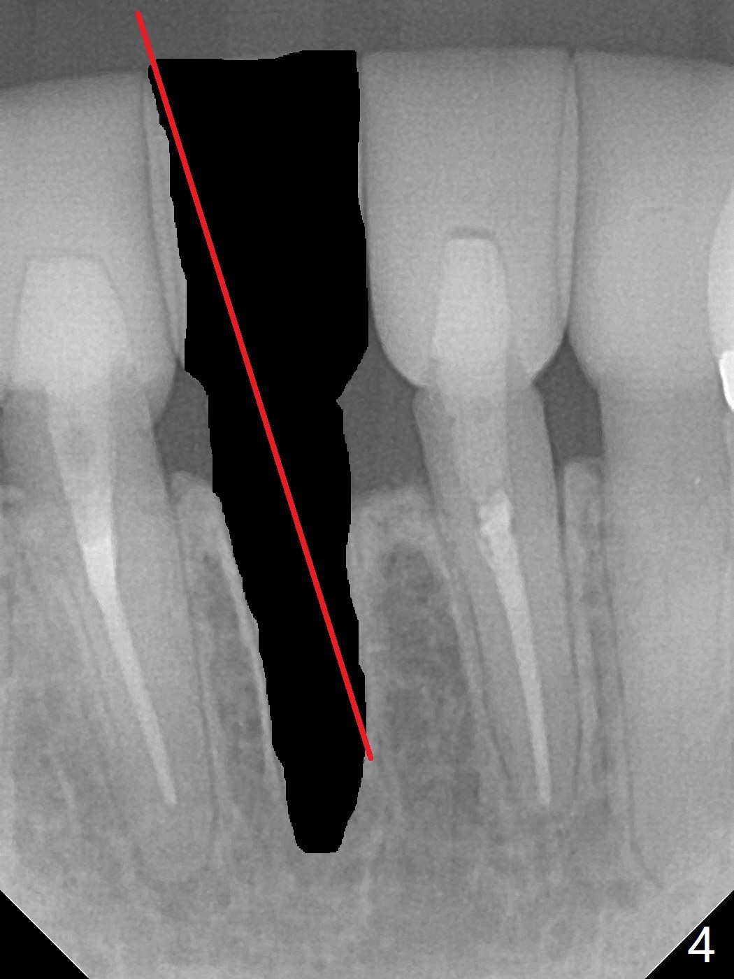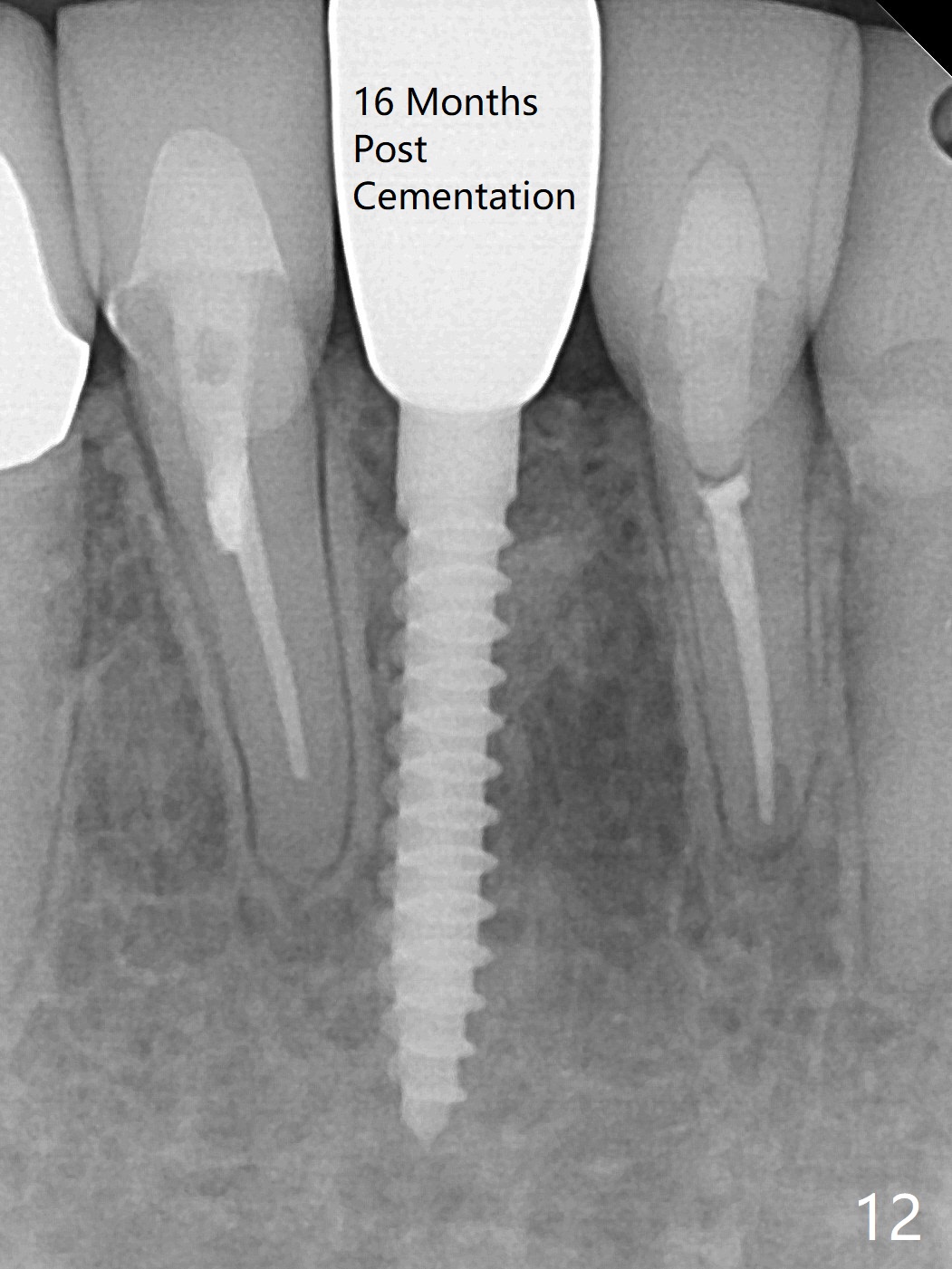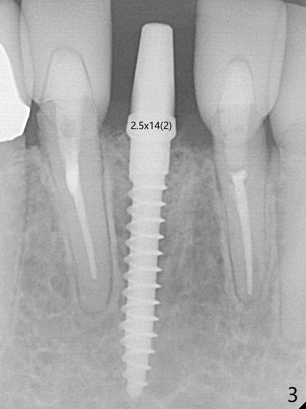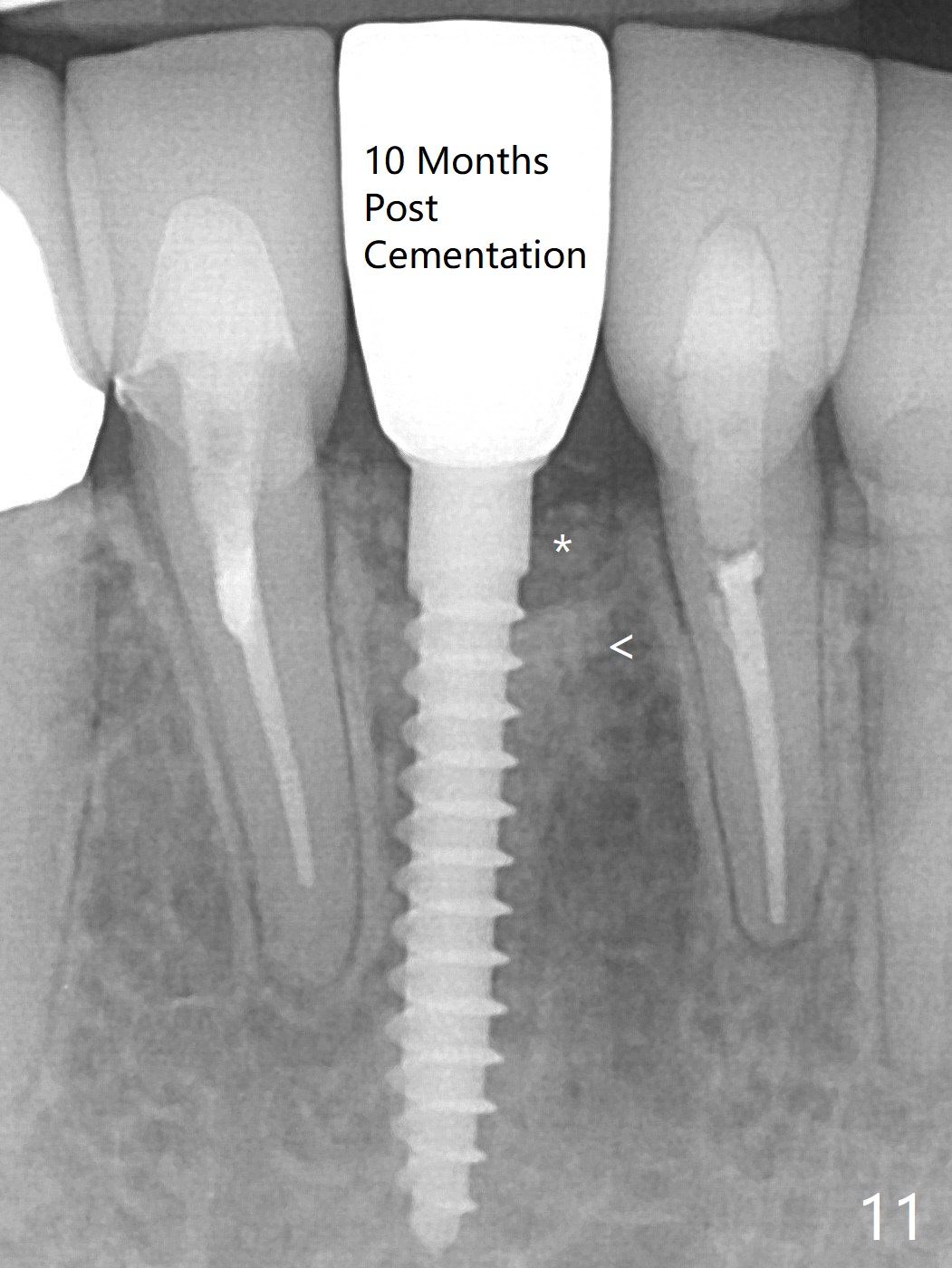 A drawback of implant planning at #25 is not to use a preop PA (Fig.1 (^ fracture line)). The initial trajectory seems to be alright (Fig.2), but a 2.5x14(2) mm implant placed is close to the tooth #26 (Fig.3). In fact the affected tooth is deviated distal; osteotomy should be initiated in the mesial slope of the socket (Fig.4 red line). The final trajectory appears to be perfect (Fig.5). Furthermore the 1st intraop PA should be analyzed carefully (Fig.6). A new osteotomy should be established mesial or the existing one should be moved mesial with Lindamann bur (Fig.7). The distal implant placement may be related to more bone loss in the distal crest 3.5 months postop (Fig.8) and more severe distal papillary recession (Fig.9 *). The bone density increases at the levels of the non-thread and thread portions of the implant (in the original socket) nearly 10 months post cementation (Fig.11 *, <). There is no bone loss 16 months post cementation (Fig.12).