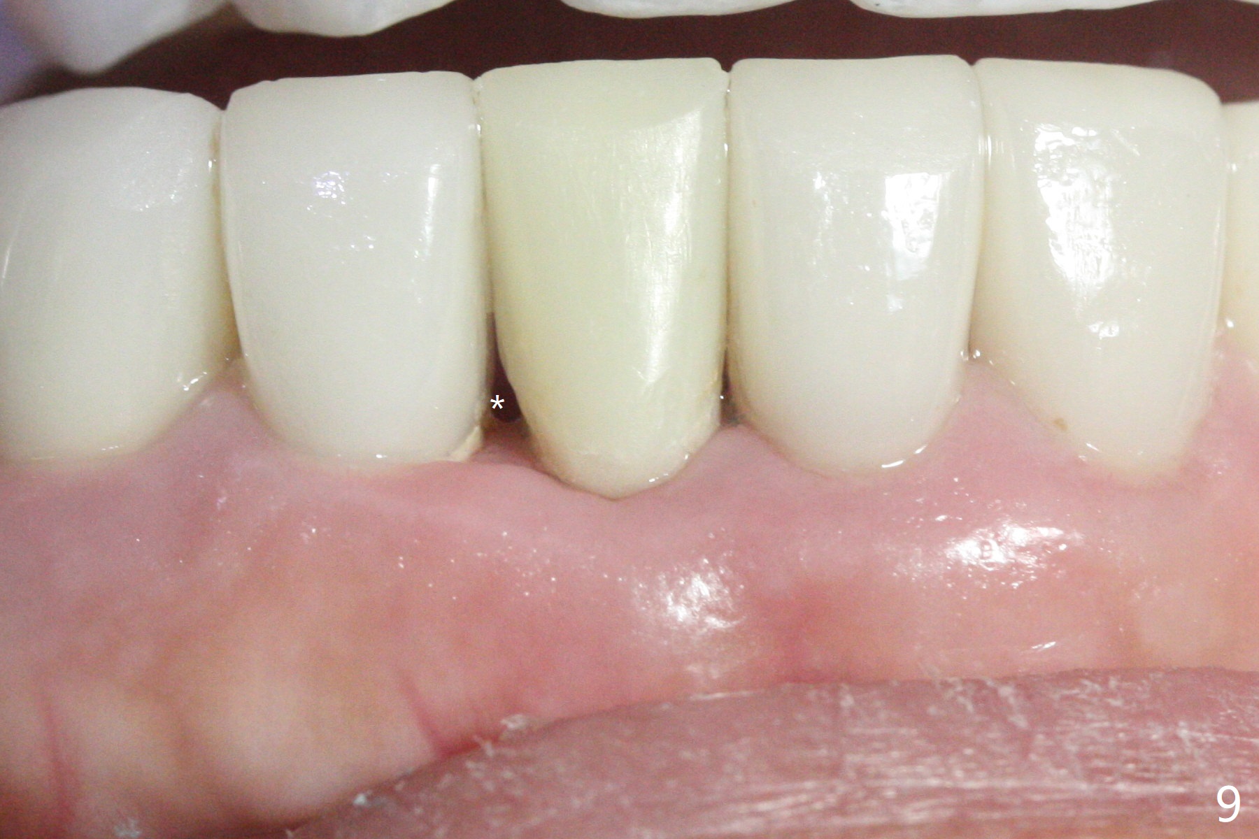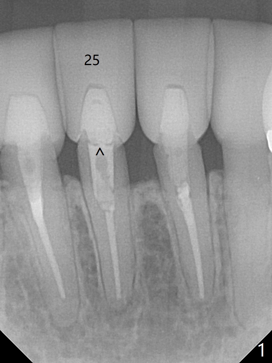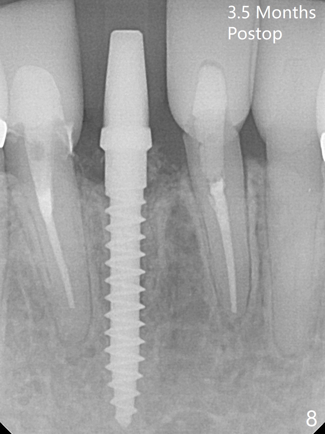 A drawback of implant planning at #25 is not to use a preop PA (Fig.1 (^ fracture line)). The initial trajectory seems to be alright (Fig.2), but a 2.5x14(2) mm implant placed is close to the tooth #26 (Fig.3). In fact the affected tooth is deviated distal; osteotomy should be initiated in the mesial slope of the socket (Fig.4 red line). The final trajectory appears to be perfect (Fig.5). Furthermore the 1st intraop PA should be analyzed carefully (Fig.6). A new osteotomy should be established mesial or the existing one should be moved mesial with Lindamann bur (Fig.7). The distal implant placement may be related to more bone loss in the distal crest 3.5 months postop (Fig.8) and more severe distal papillary recession (Fig.9 *). The bone density increases at the levels of the non-thread and thread portions of the implant (in the original socket) nearly 10 months post cementation (Fig.11 *, <). There is no bone loss 16 months post cementation (Fig.12).