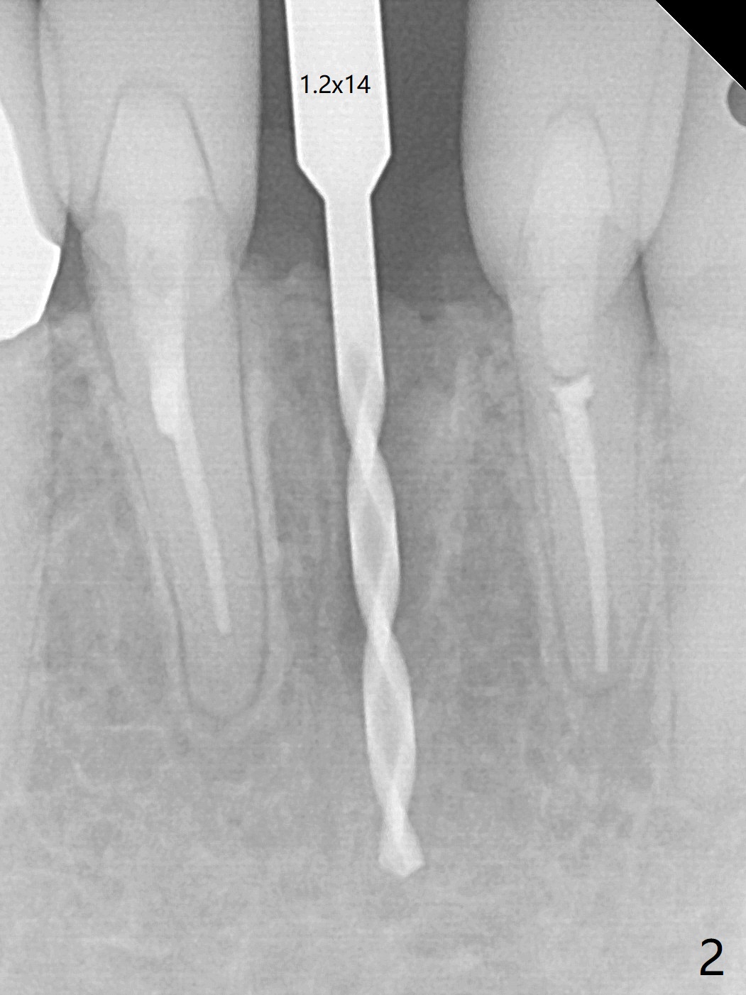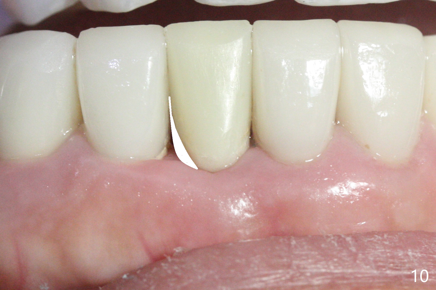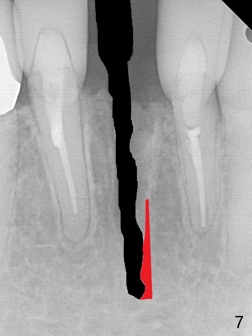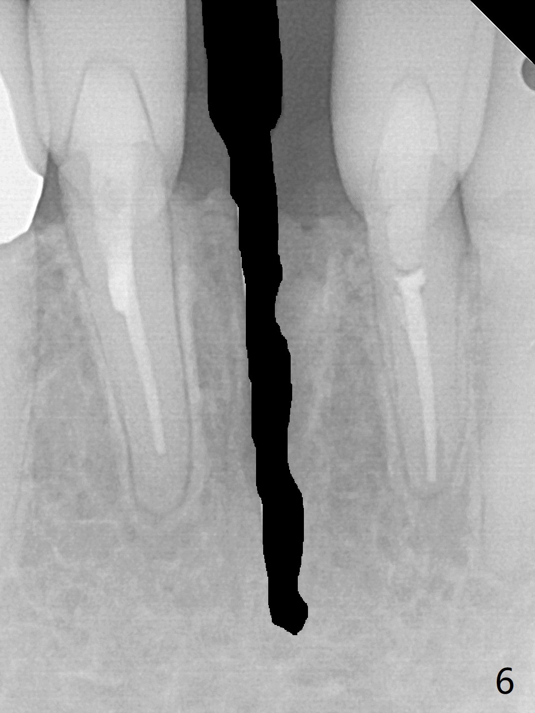 A drawback of implant planning at #25 is not to use a preop PA (Fig.1 (^ fracture line)). The initial trajectory seems to be alright (Fig.2), but a 2.5x14(2) mm implant placed is close to the tooth #26 (Fig.3). In fact the affected tooth is deviated distal; osteotomy should be initiated in the mesial slope of the socket (Fig.4 red line). The final trajectory appears to be perfect (Fig.5). Furthermore the 1st intraop PA should be analyzed carefully (Fig.6). A new osteotomy should be established mesial or the existing one should be moved mesial with Lindamann bur (Fig.7). The distal implant placement may be related to more bone loss in the distal crest 3.5 months postop (Fig.8) and more severe distal papillary recession (Fig.9 *). The bone density increases at the levels of the non-thread and thread portions of the implant (in the original socket) nearly 10 months post cementation (Fig.11 *, <). There is no bone loss 16 months post cementation (Fig.12).