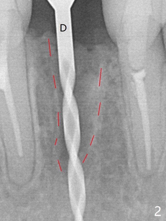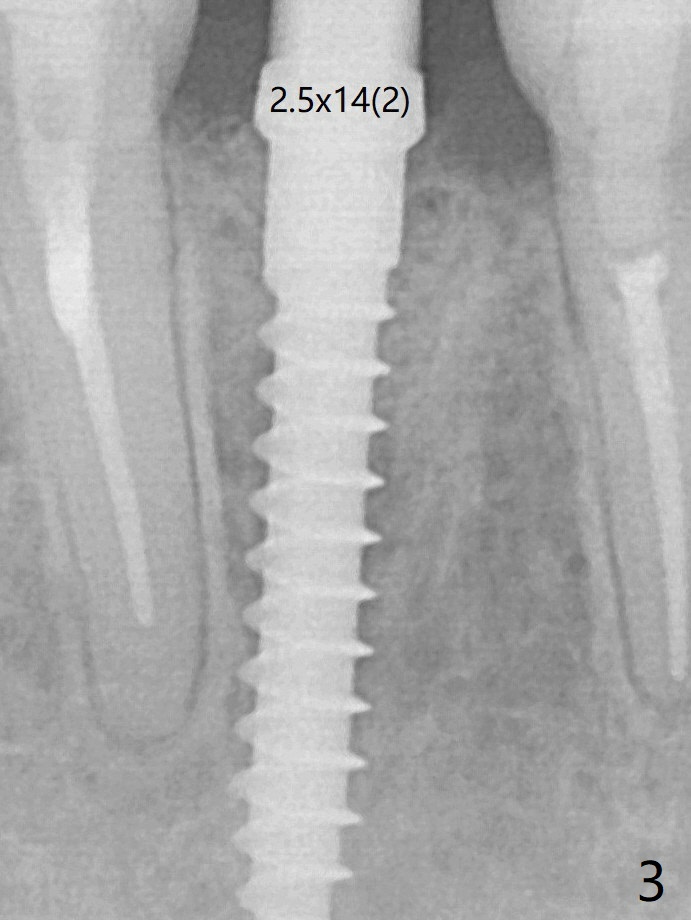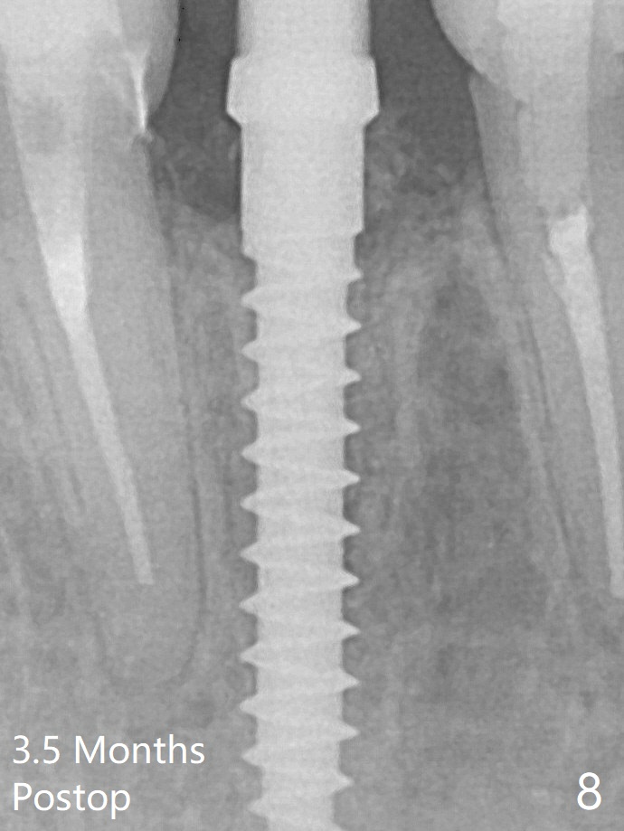 A drawback of implant planning at #25 is not to use a preop PA (Fig.1 (^ fracture line)). The initial trajectory seems to be alright (Fig.2 (red line: socket; D: 1.2 mm drill)), but a 2.5x14(2) mm implant placed is close to the tooth #26 (Fig.3 (allograft having been placed)). The latter may be related to more bone loss in the distal crest 3.5 months postop (Fig.8) and more severe distal papillary recession (Fig.9 *). The meisal bone seems to be wider.