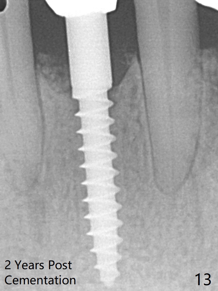 Because of the narrow flat ridge buccolingually, a 2.5x12(4) mm 1-piece implant is placed with >40 Ncm (Fig.8). With deeper placement of the implant, Vanilla graft is placed in 2 steps (Fig.9,10 *). No implant threads are exposed 10 months postop (Fig.11) or 2 years post cementation (Fig.13). Undermine the papilla between 24/25 and place bone graft next case.