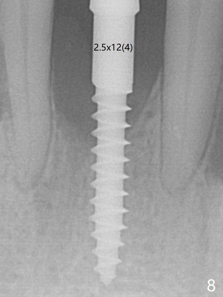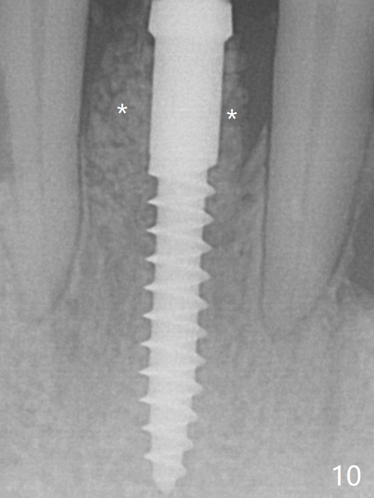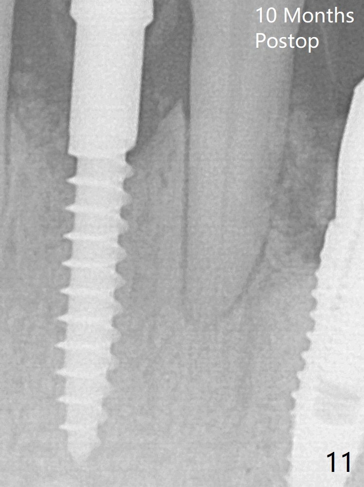 Because of the narrow flat ridge buccolingually, a 2.5x12(4) mm 1-piece implant is placed with >40 Ncm (Fig.8). With deeper placement of the implant, Vanilla graft is placed in 2 steps (Fig.9,10 *). No implant threads are exposed 10 months postop (Fig.11).