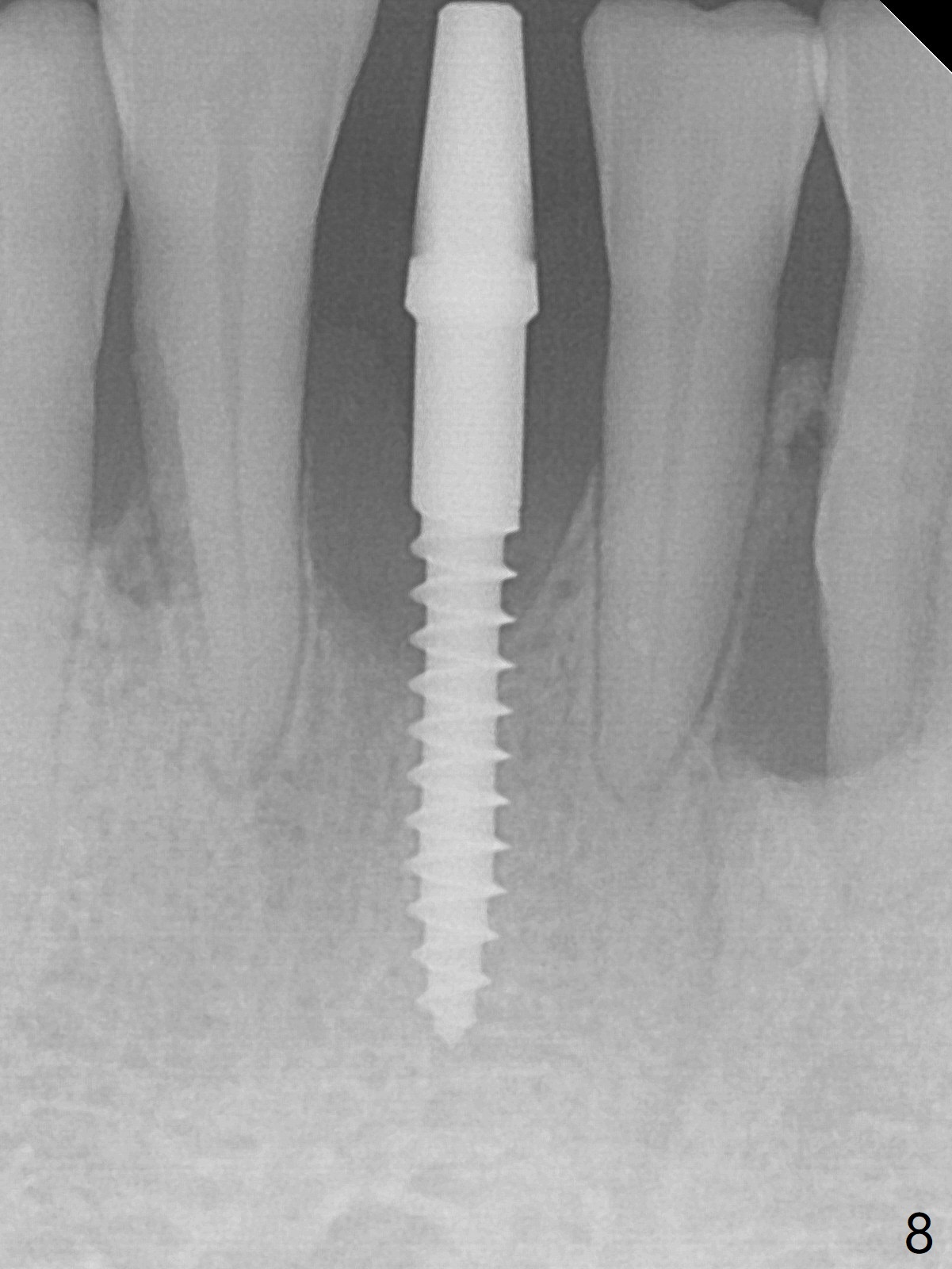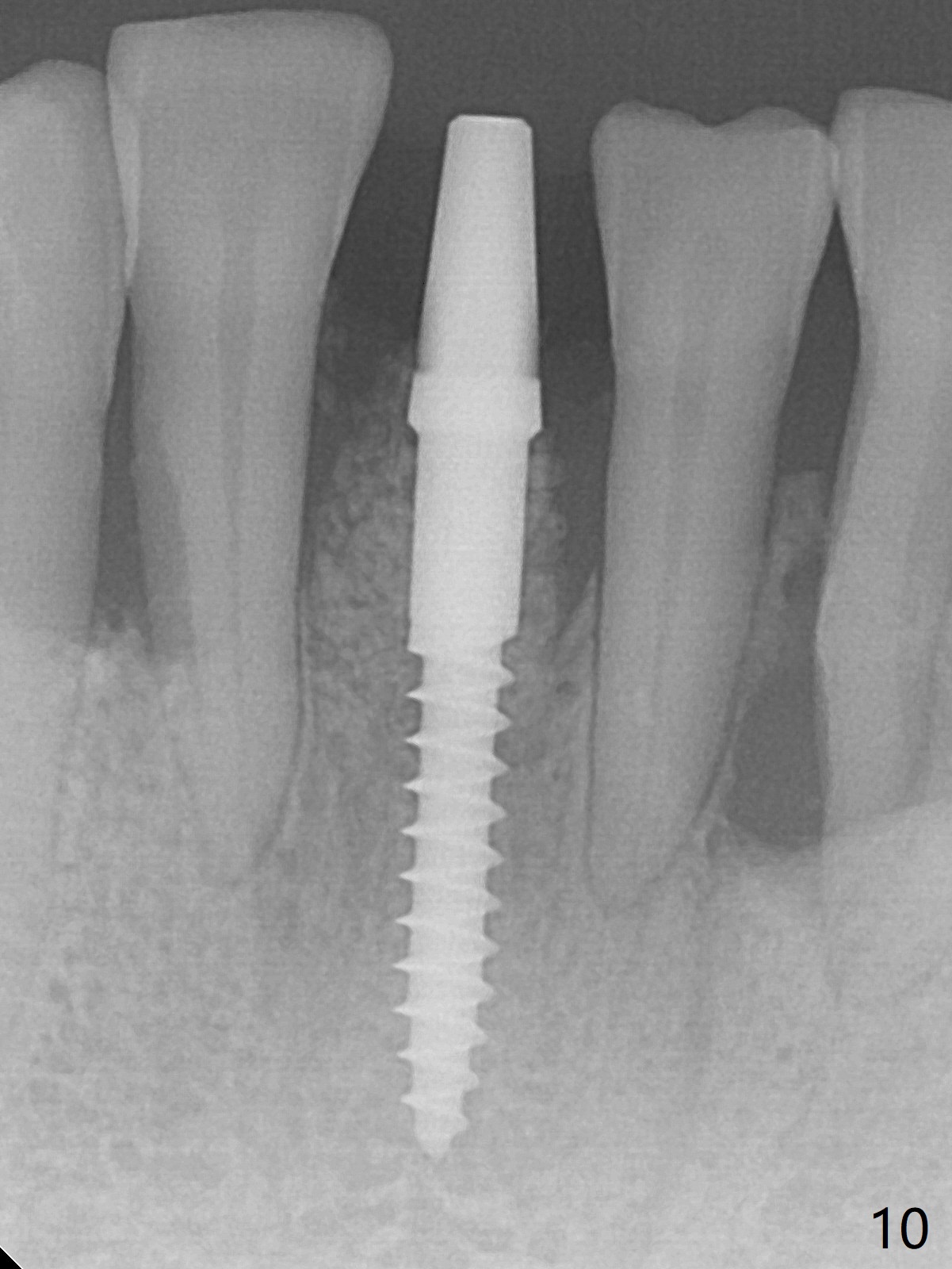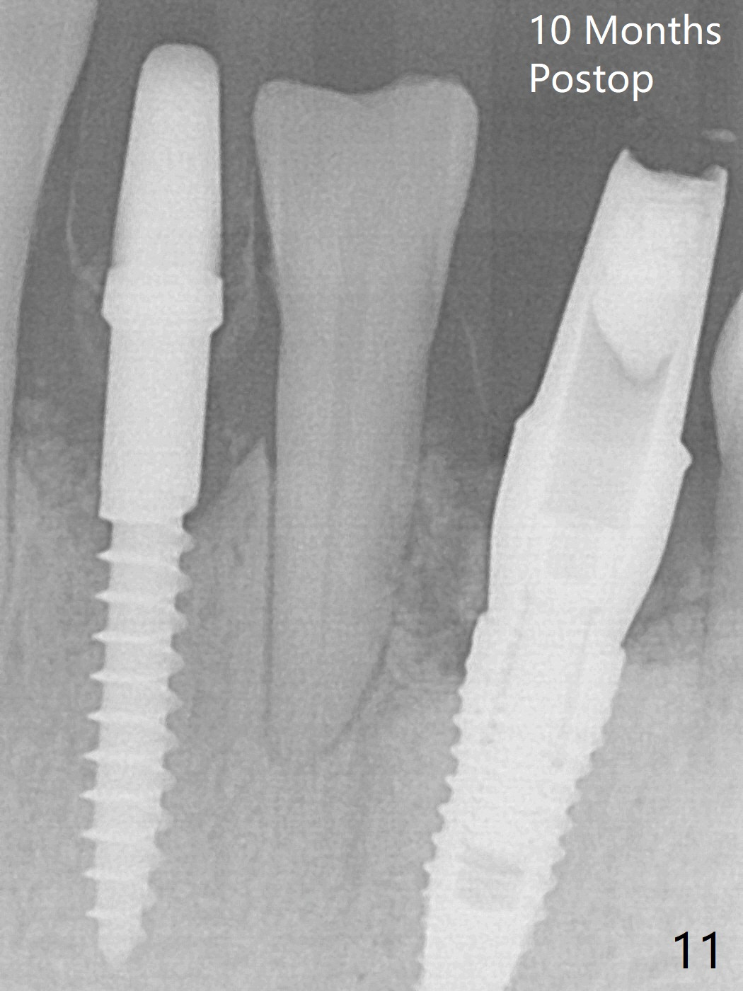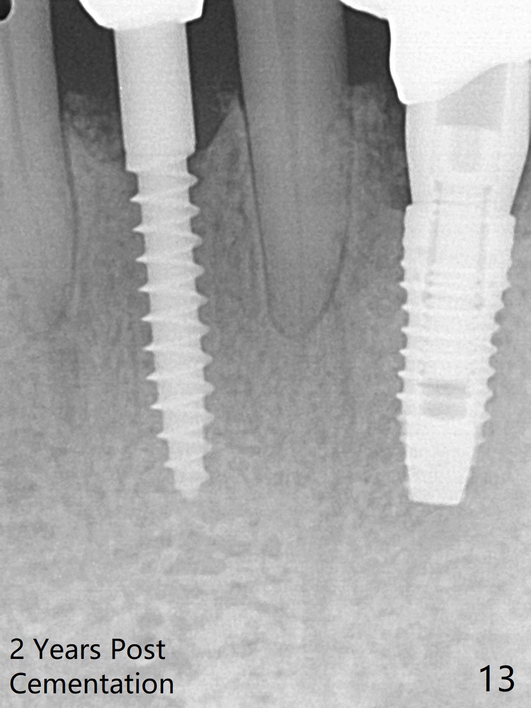 There is gingival inflammation at #25 buccally (Fig.1) and lingually (Fig.2). The bone loss is severe (Fig.3). Soft and hard tissue heights are 5 mm (cuff will be 4 mm) and 10 mm (implant will be 12 mm with 2 mm outside the native bone, Fig.4). The apex of the affected tooth appears deviated distal (Fig.5 *). The initial osteotomy happens to follow the long axis of the socket (Fig.6); to establish a correct trajectory, a new osteotomy should be made at the site labeled as a red line. In fact it is executed as planned (Fig.7). Because of the narrow flat ridge buccolingually, a 2.5x12(4) mm 1-piece implant is placed with >40 Ncm (Fig.8). With deeper placement of the implant, Vanilla graft is placed in 2 steps (Fig.9,10). The patient will return 2.5 months for extraction and implant of the fused teeth #22 and 23. No implant threads are exposed 10 months postop (Fig.11). CT taken 11 months postop shows that the 2.5 mm implant is in the middle of the bone (Fig.12) or 2 years post cementation (Fig.13).