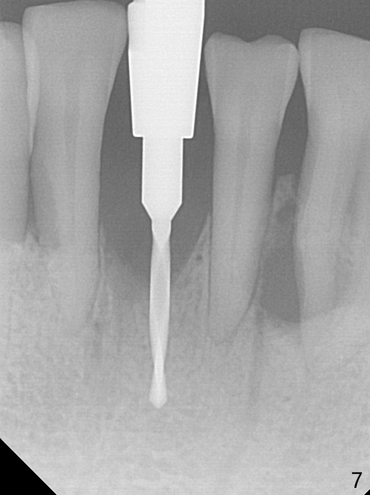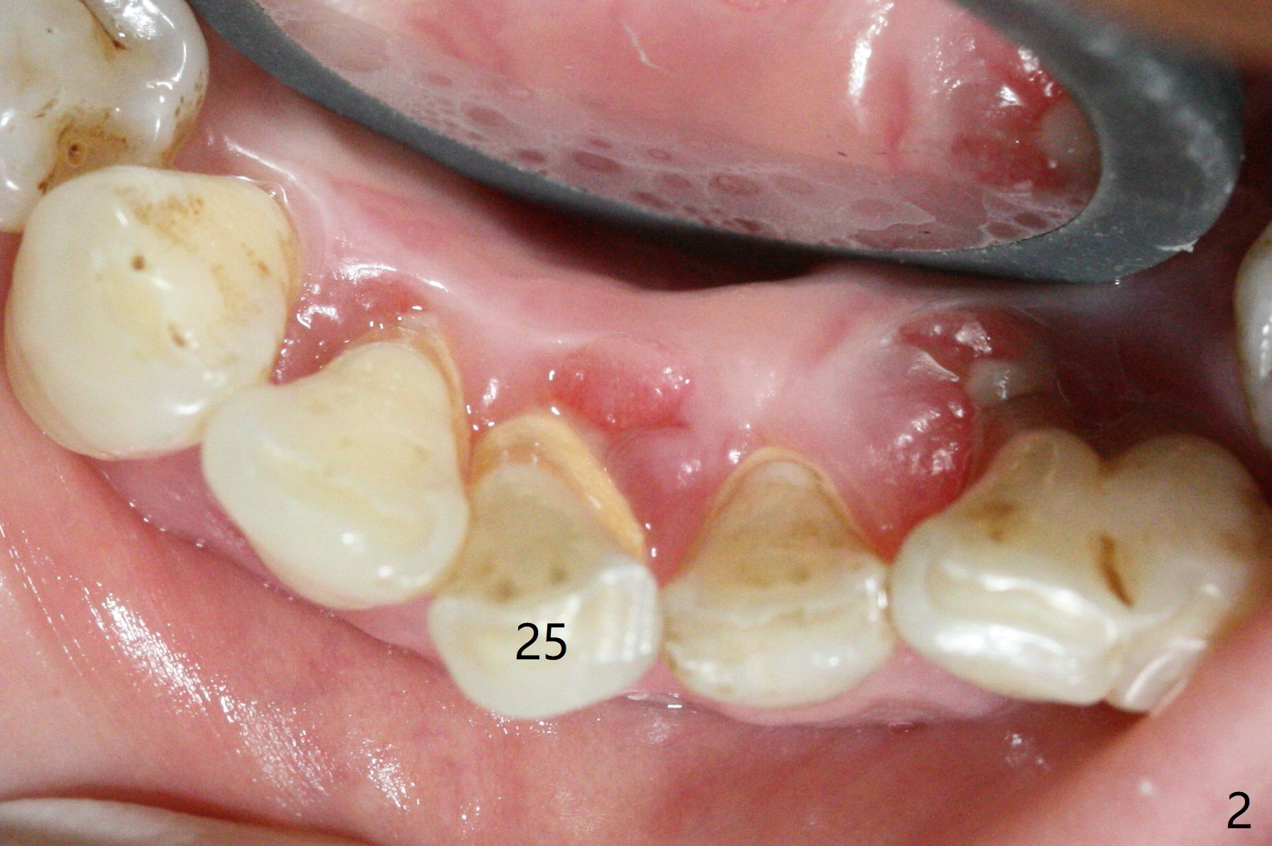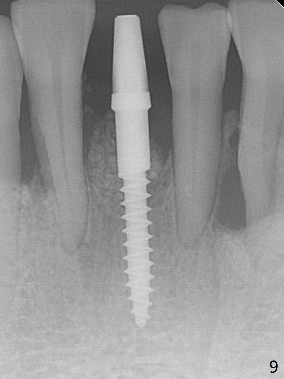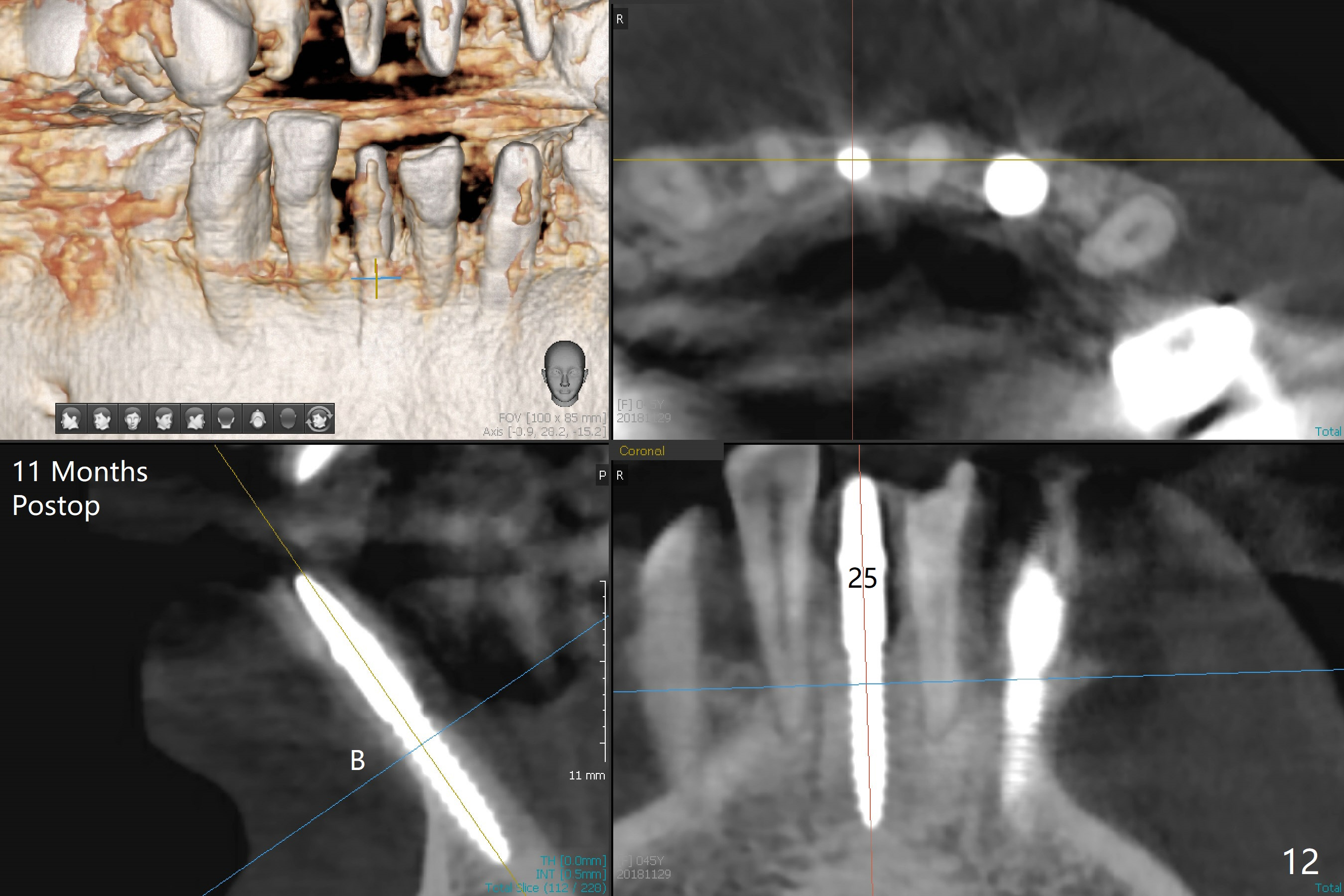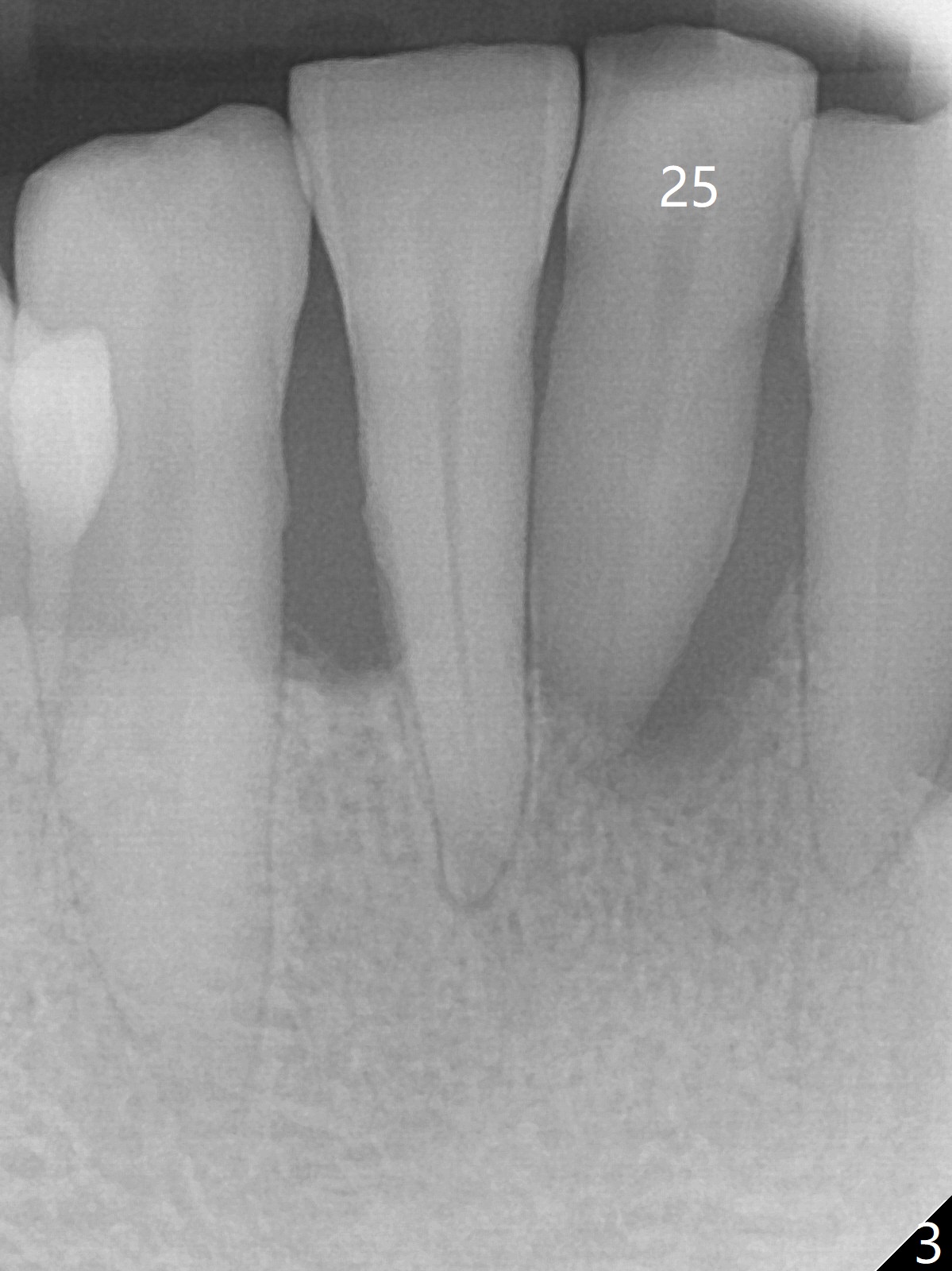 There is gingival inflammation at #25 buccally (Fig.1) and lingually (Fig.2). The bone loss is severe (Fig.3). Soft and hard tissue heights are 5 mm (cuff will be 4 mm) and 10 mm (implant will be 12 mm with 2 mm outside the native bone, Fig.4). The apex of the affected tooth appears deviated distal (Fig.5 *). The initial osteotomy happens to follow the long axis of the socket (Fig.6); to establish a correct trajectory, a new osteotomy should be made at the site labeled as a red line. In fact it is executed as planned (Fig.7). Because of the narrow flat ridge buccolingually, a 2.5x12(4) mm 1-piece implant is placed with >40 Ncm (Fig.8). With deeper placement of the implant, Vanilla graft is placed in 2 steps (Fig.9,10). The patient will return 2.5 months for extraction and implant of the fused teeth #22 and 23. No implant threads are exposed 10 months postop (Fig.11). CT taken 11 months postop shows that the 2.5 mm implant is in the middle of the bone (Fig.12) or 2 years post cementation (Fig.13).