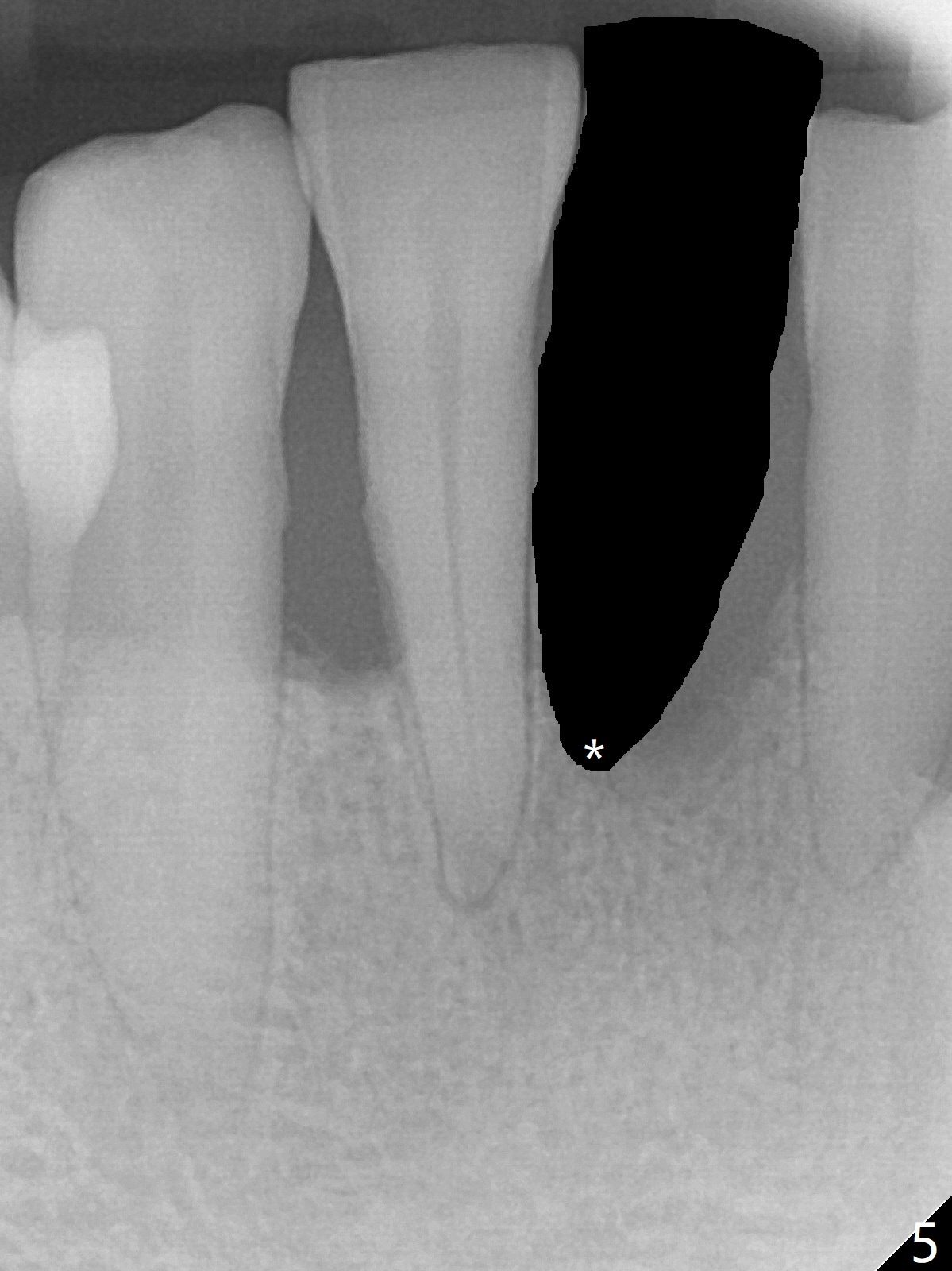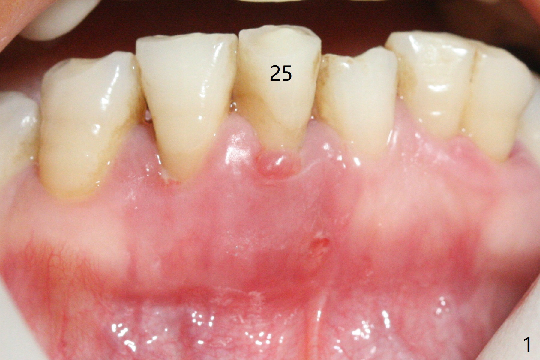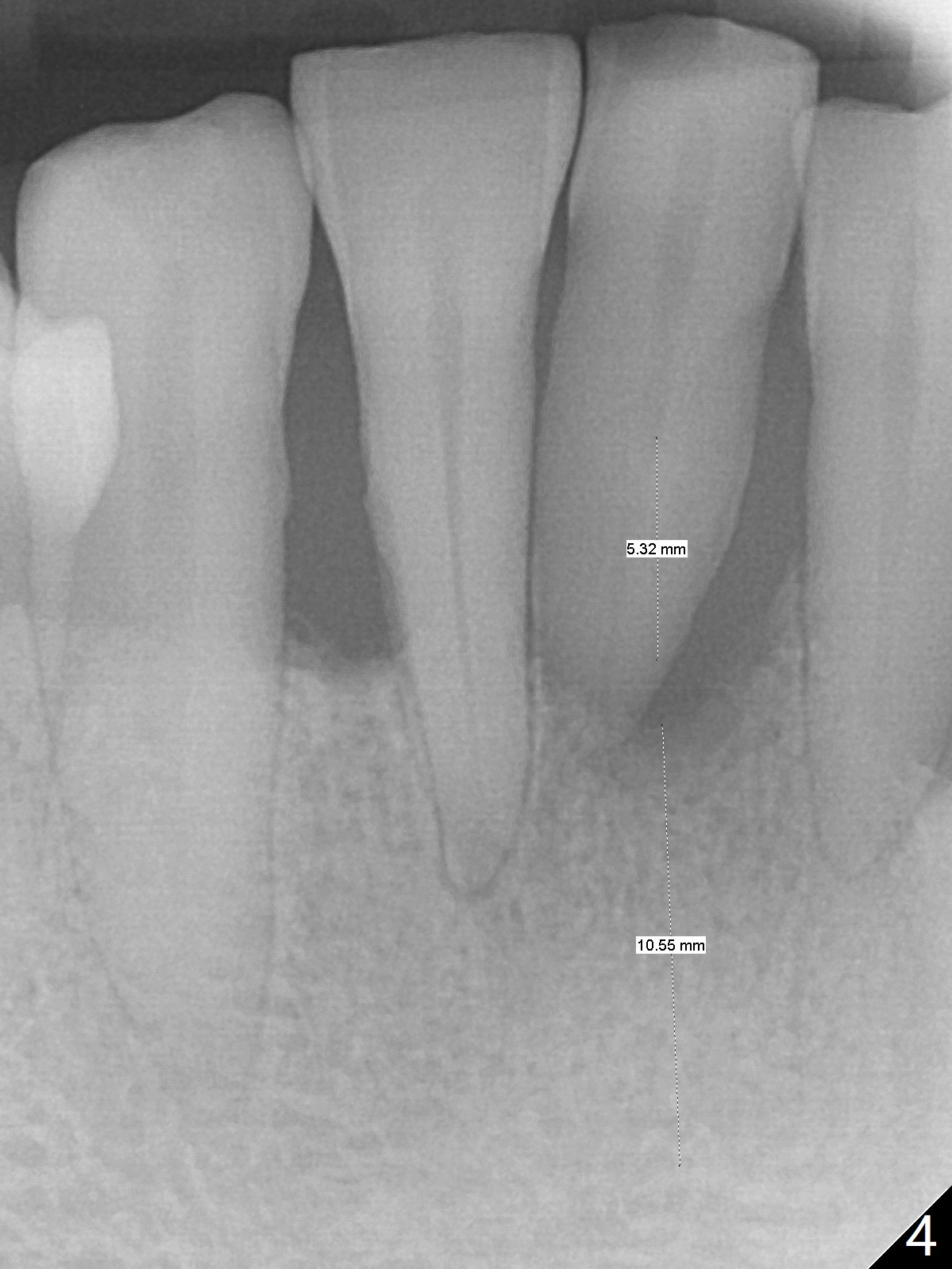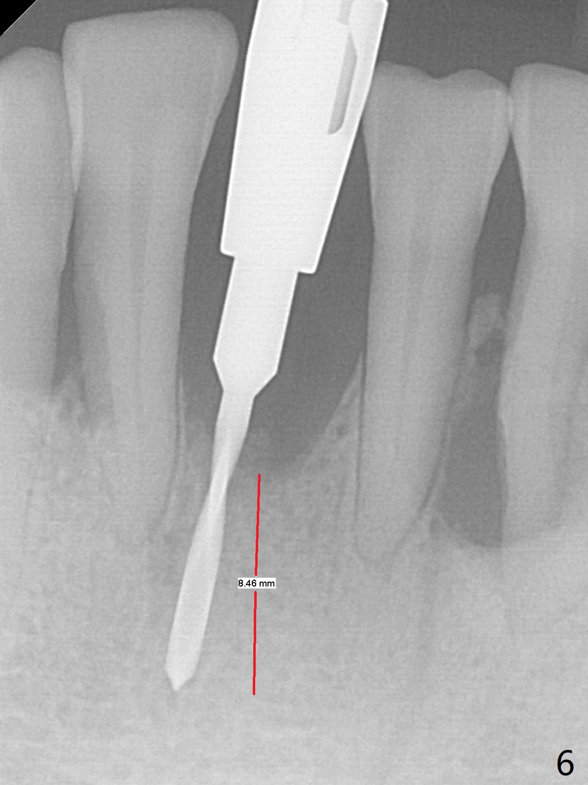 There is gingival inflammation at #25 buccally (Fig.1) and lingually (Fig.2). The bone loss is severe (Fig.3). Soft and hard tissue heights are 5 mm (cuff will be 4 mm) and 10 mm (implant will be 12 mm with 2 mm outside the native bone, Fig.4). The apex of the affected tooth appears deviated distal (Fig.5 *). The initial osteotomy happens to follow the long axis of the socket (Fig.6); to establish a correct trajectory, a new osteotomy should be made at the site labeled as a red line. In fact it is executed as planned (Fig.7). Because of the narrow flat ridge buccolingually, a 2.5x12(4) mm 1-piece implant is placed with >40 Ncm (Fig.8). With deeper placement of the implant, Vanilla graft is placed in 2 steps (Fig.9,10). The patient will return 2.5 months for extraction and implant of the fused teeth #22 and 23. No implant threads are exposed 10 months postop (Fig.11). CT taken 11 months postop shows that the 2.5 mm implant is in the middle of the bone (Fig.12) or 2 years post cementation (Fig.13).
