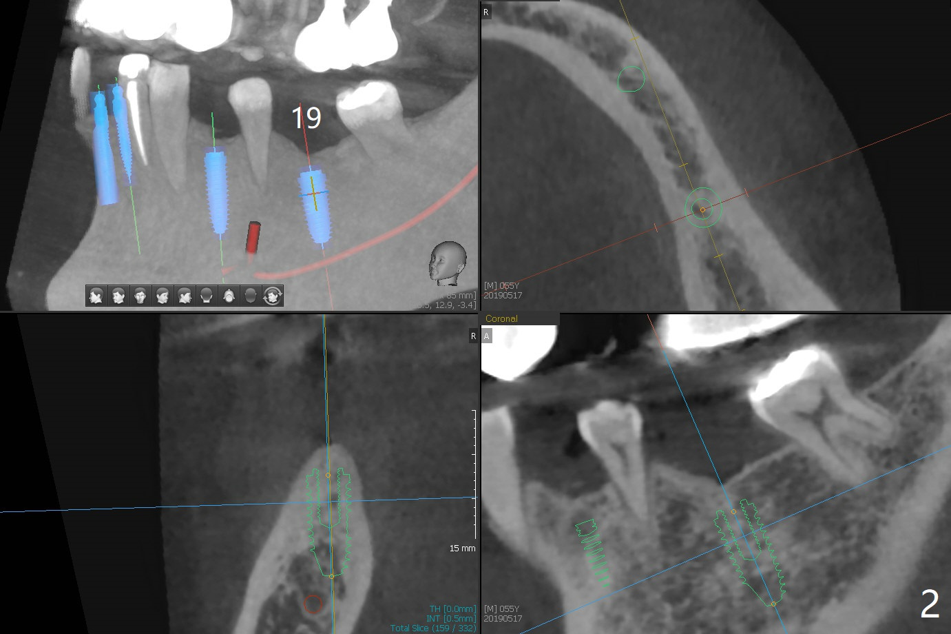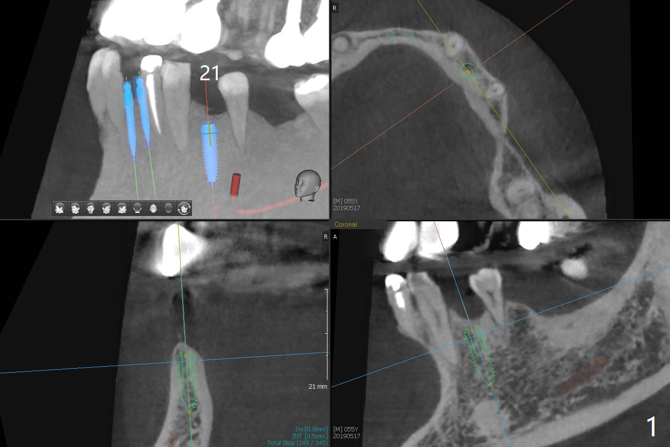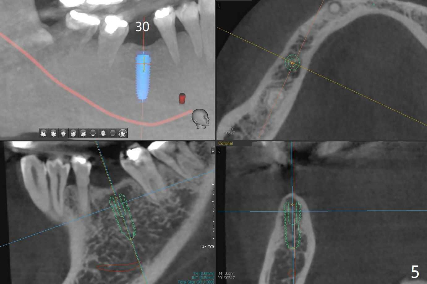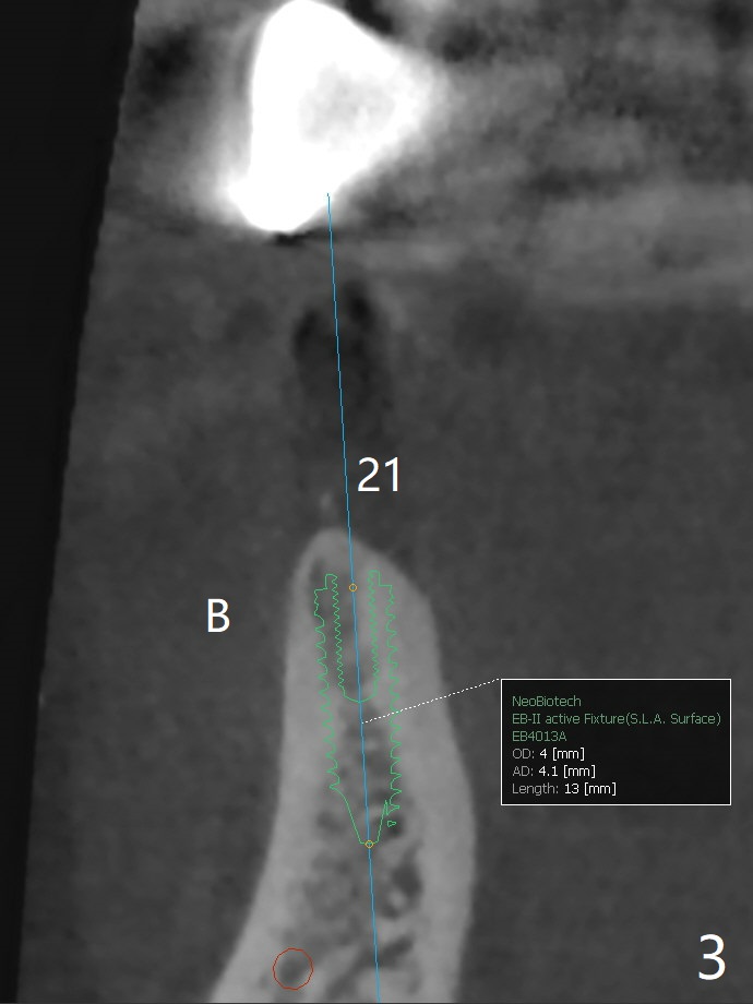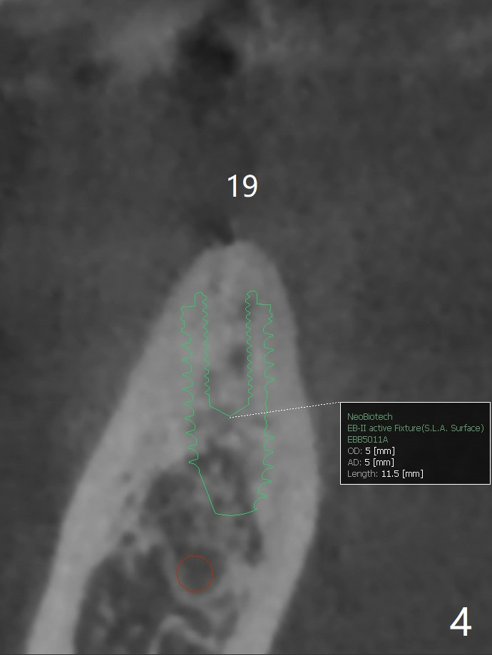 The implants at #11, 14 and 15 are IBS. To reduce the chance of screw loosening, IS guide will be used for better trajectory at #19,21,30. Since the ridge at #21 and 19 is pointed at the top, the implant will be placed deep (Fig.1-4). Bone trimmer will be used prior to pointed drill to avoid drill deflection. Check whether the IS implant driver fits IBS implant well. Try dummy implants first.
