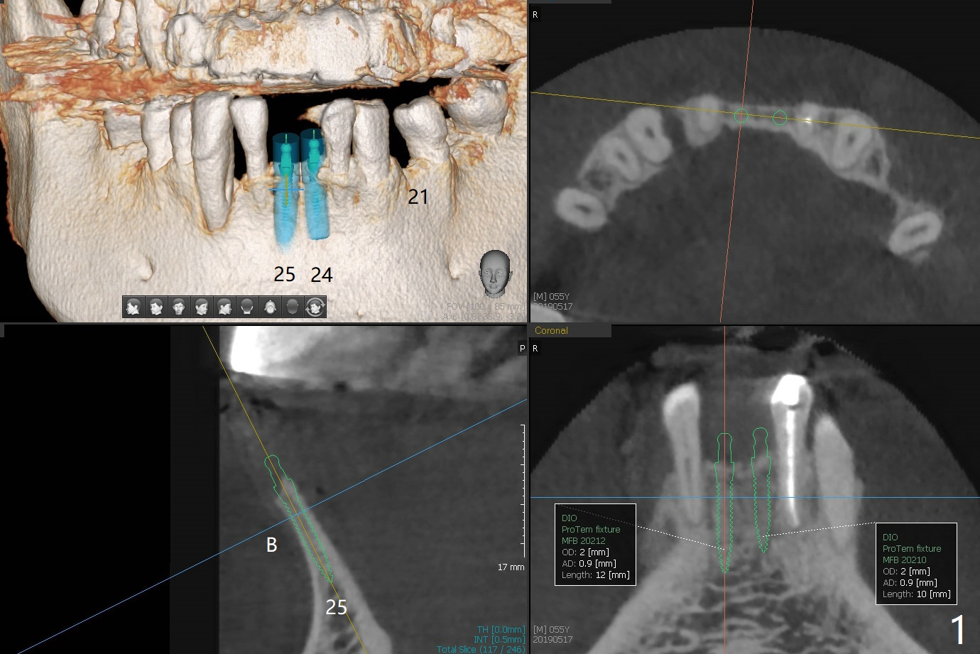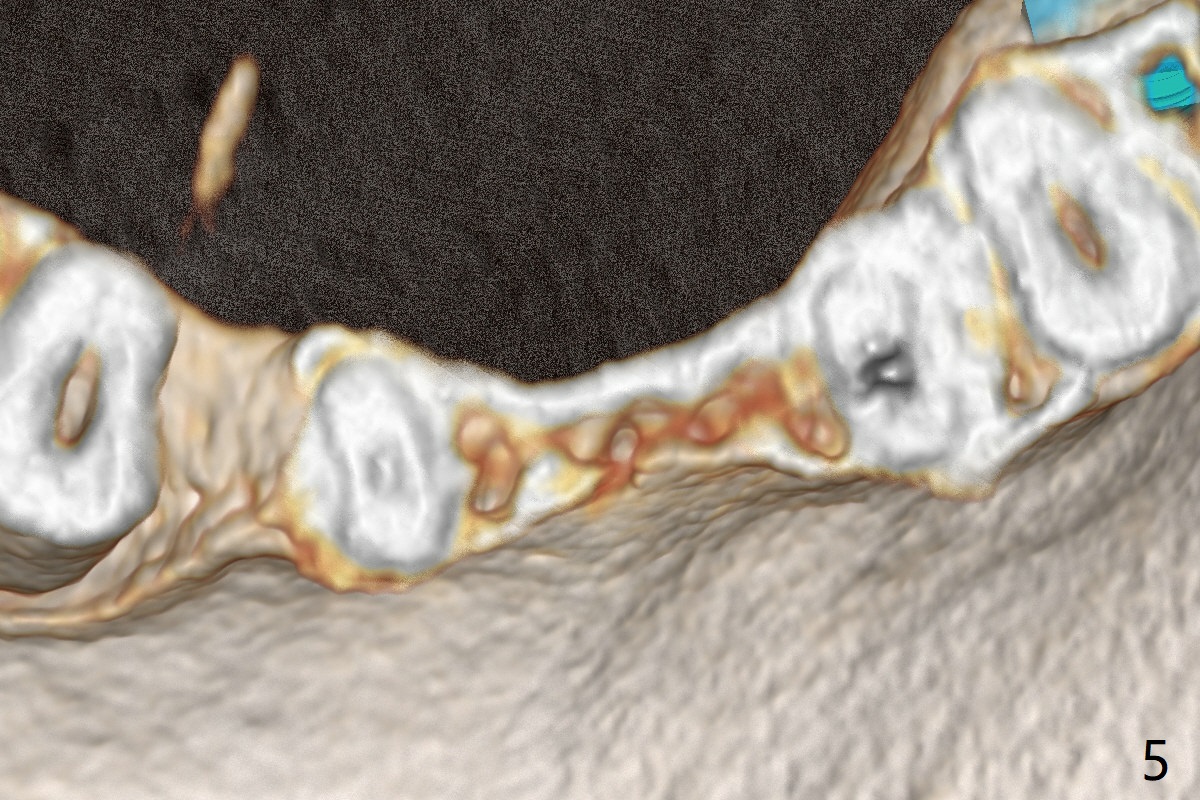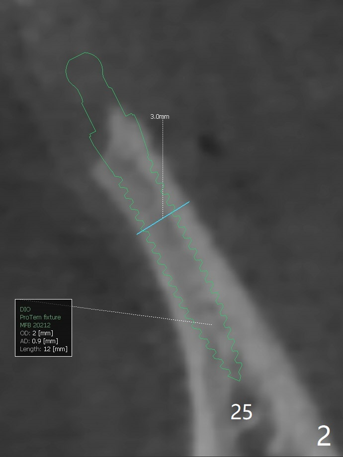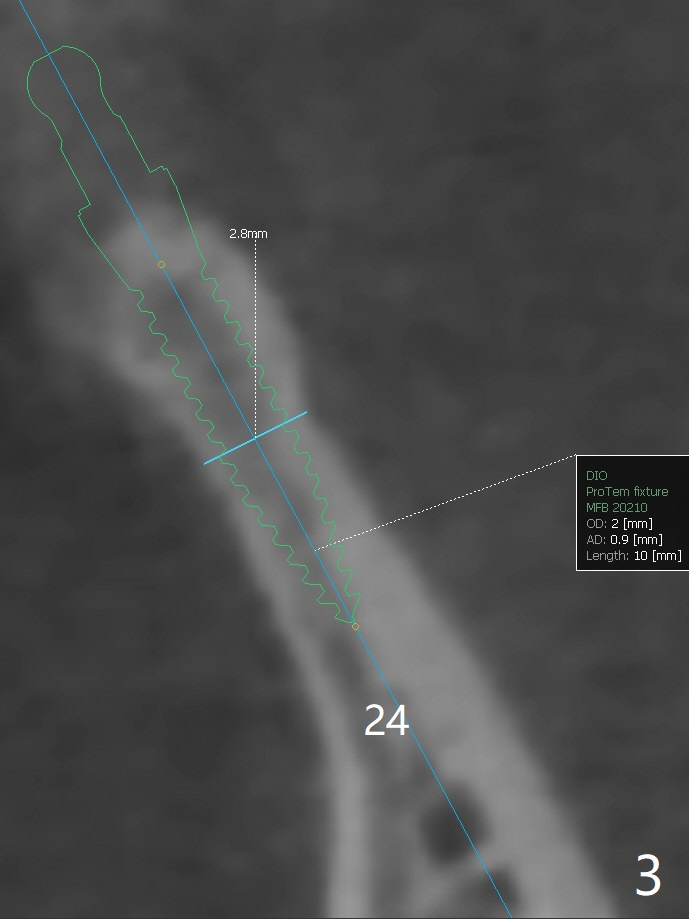A 55-year-old man wants to change the lower RPD to implants gradually (Fig.1). The first step is to have fixed restoration at #21 and 24/25 (1 implant with cantilever FPD (treatment planning before taking CT)). Since the ridge in the incisor region is quite narrow and long, it appears necessary to place 2 of the smallest 1-piece implants (2x10 or 12 mm, Fig.2,3 (coronal sections)). Use surgical handpiece to flatten the ridge top (Fig.4-5) and start osteotomy with 1.2 mm drill for 10 mm while using two digits to hold the ridge (Fig.6 red circles). Take PA. Bone graft if there is perforation. Prepare PRF membrane. Also prepare IS mini implant kit. It is said that the shank of the drill from this kit fits acrylic stent.