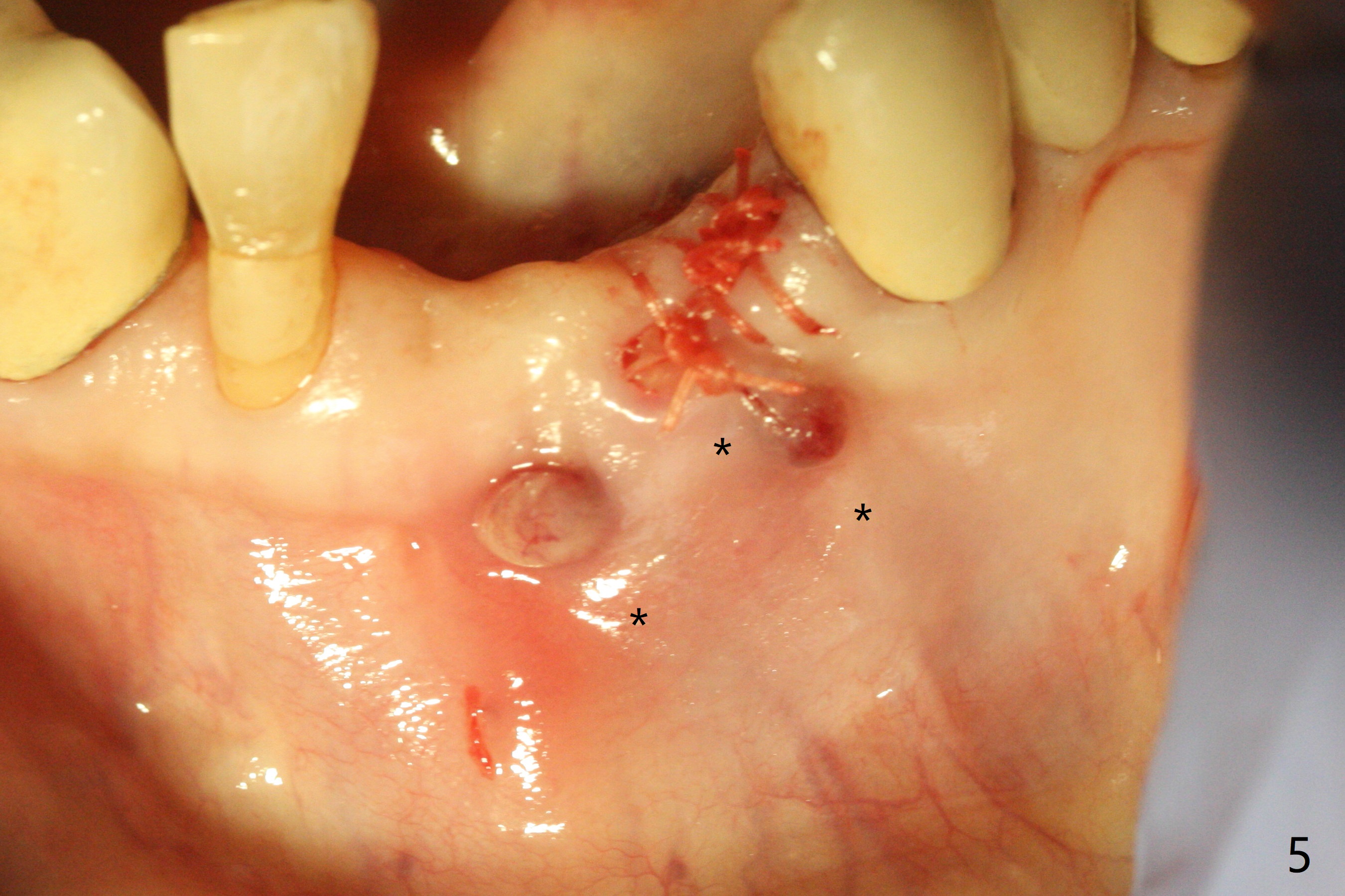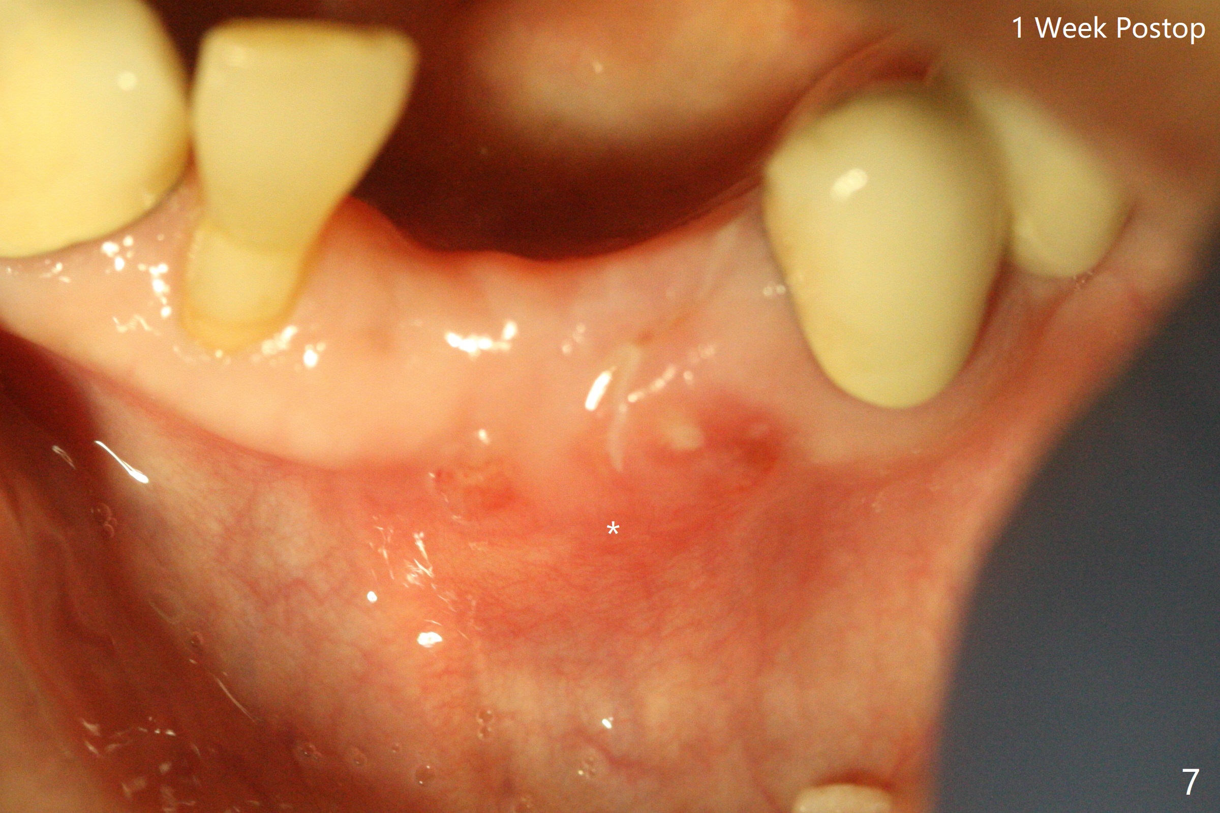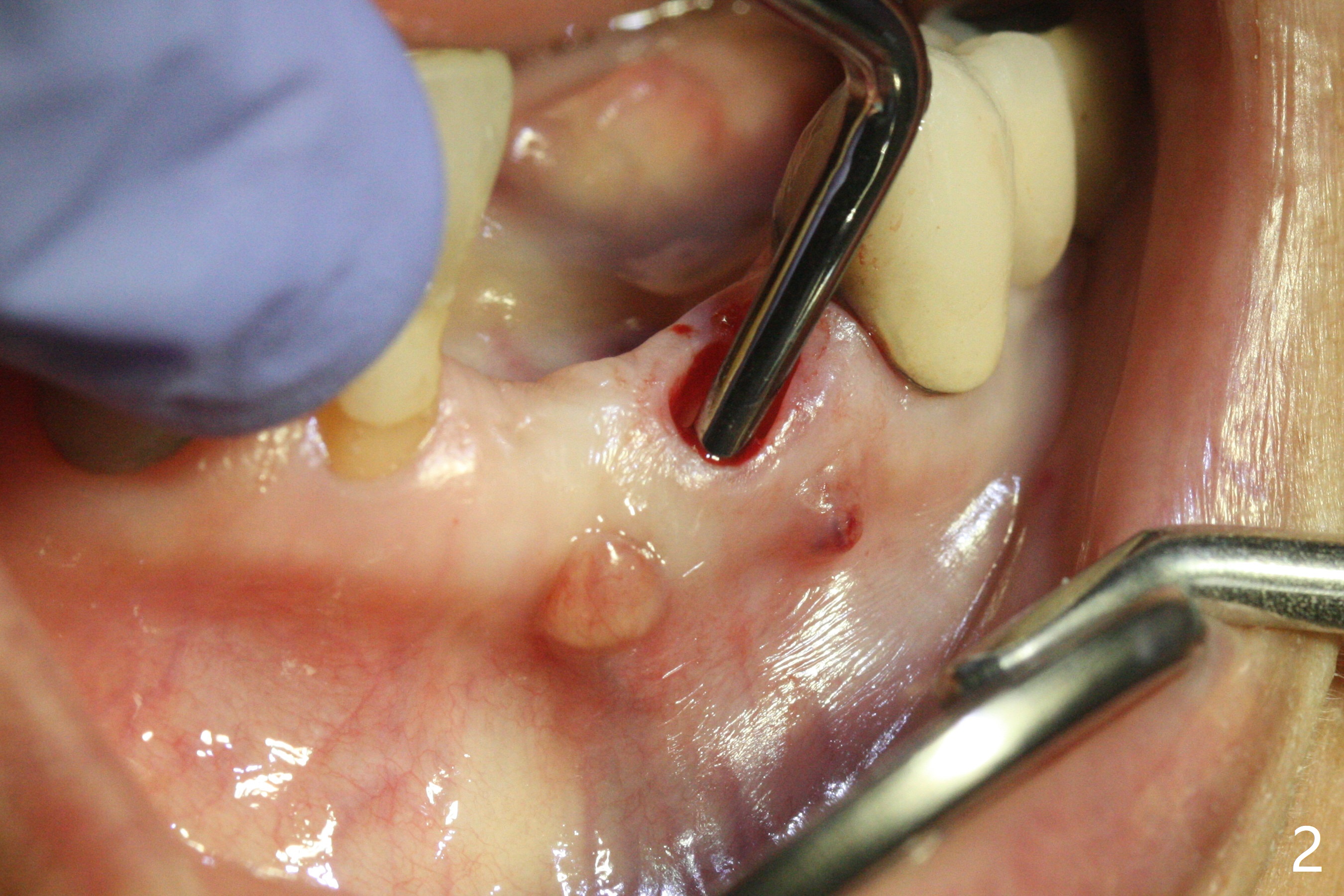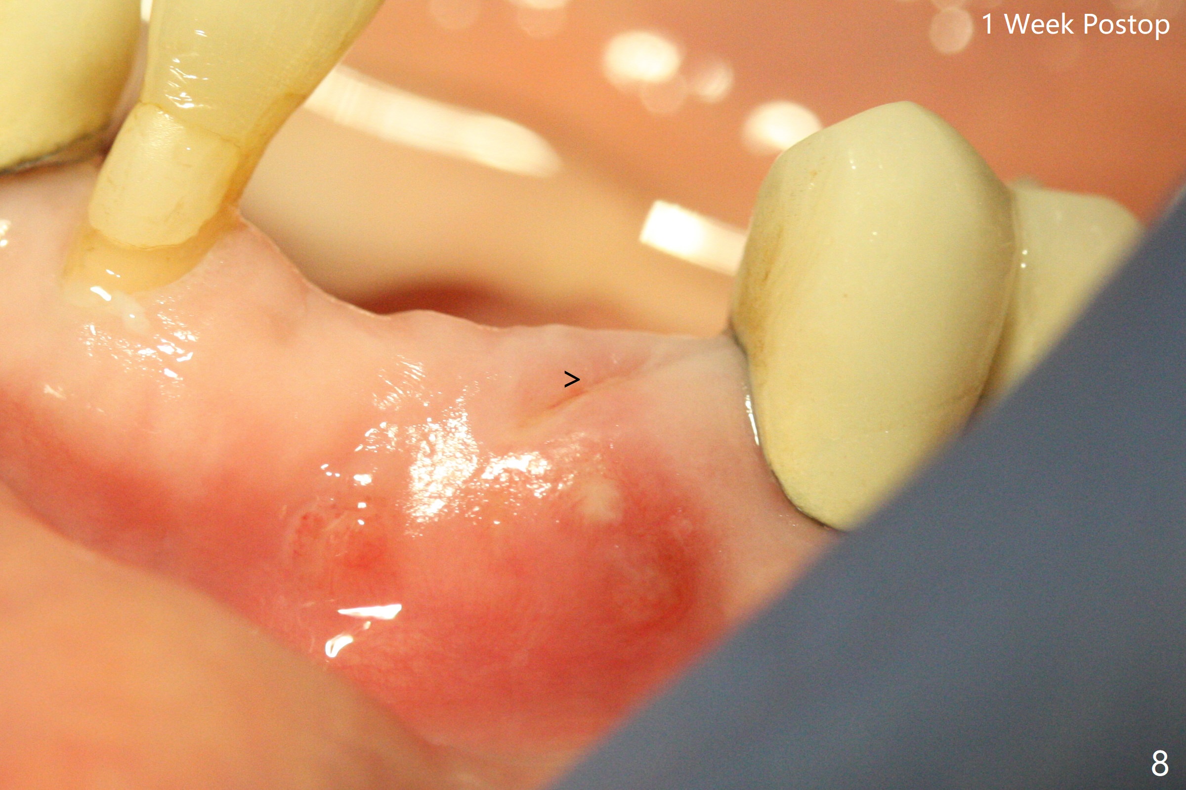 A 64-year-old woman requests extraction of the tooth #23 for lower partial (Fig.1). Since there are 2 buccal sinus tracks, another residual root is suspected (?). After shown loss of the buccal plate (Fig.2,3), the patient agrees to have socket preservation with allograft (Fig.5,6 *) and BioXclude (Fig.4 >). The suspected residual root is not explored considering the 2 sinus tracks being associated with the lesion of #23 (Fig.2,3). Cytoplast is not used because of time constraint and fear of gingival dehiscence associated with extensive dissection. In fact the sinus tracks shrink in a week, while the buccal plate remains bulging (Fig.7 *) and the socket heals (Fig.8 >). The buccal plate is flat (no swelling) 1 month postop (Fig.9).