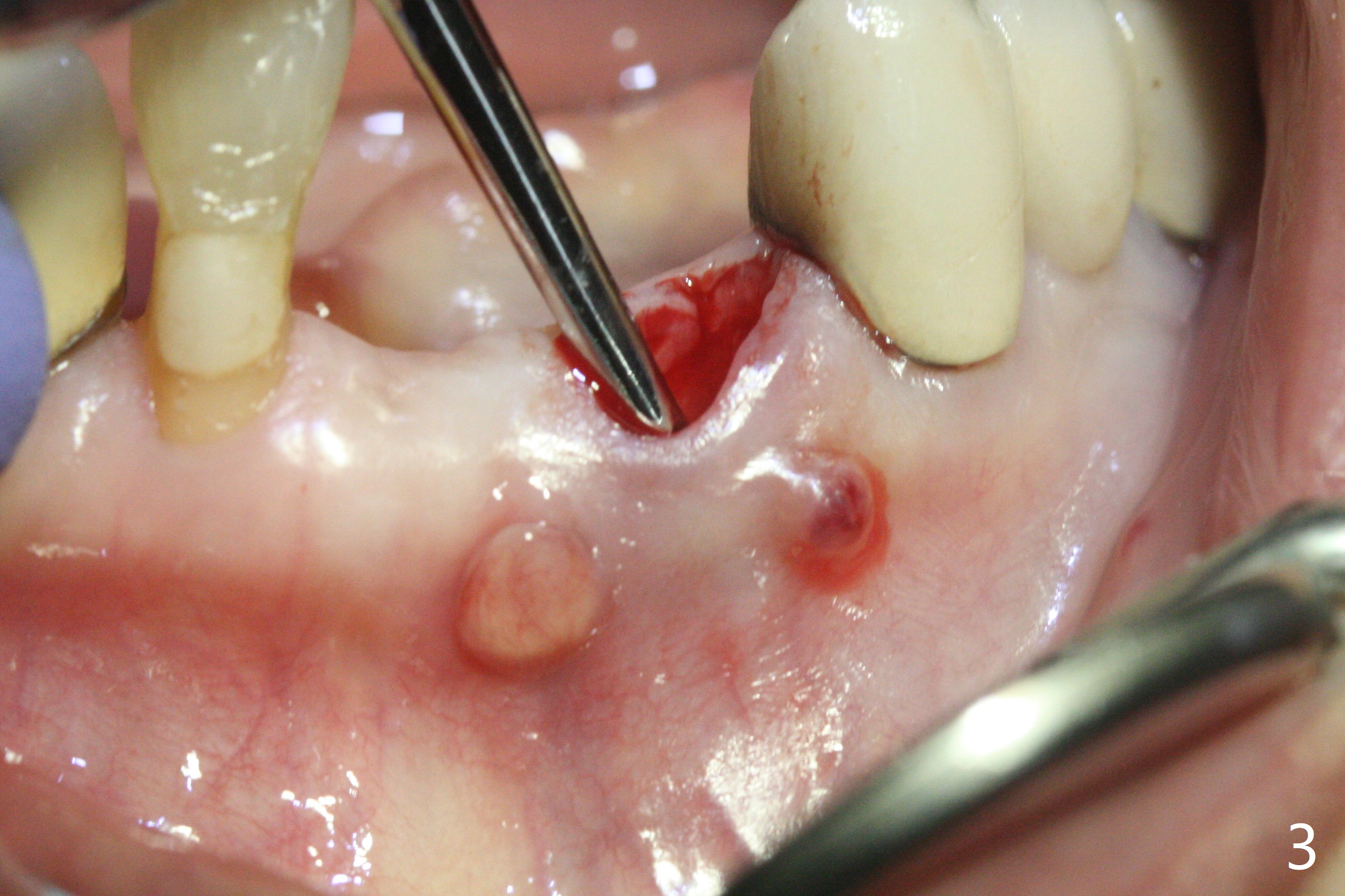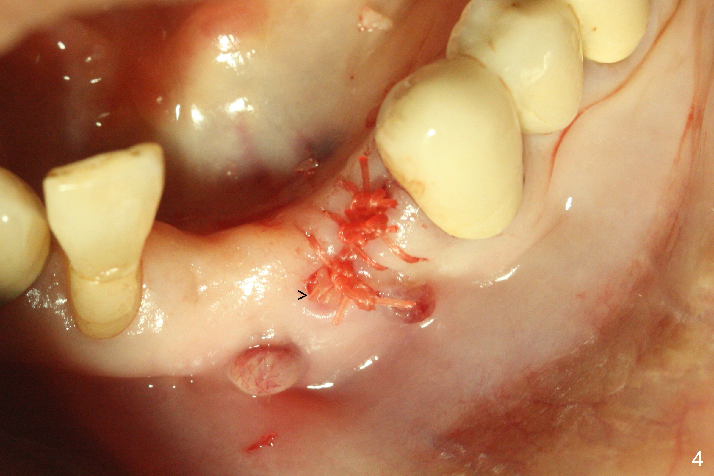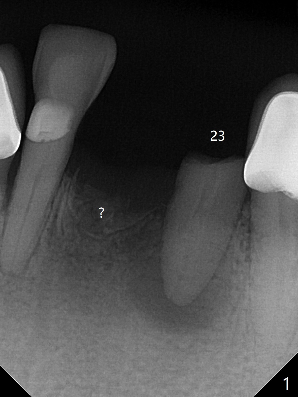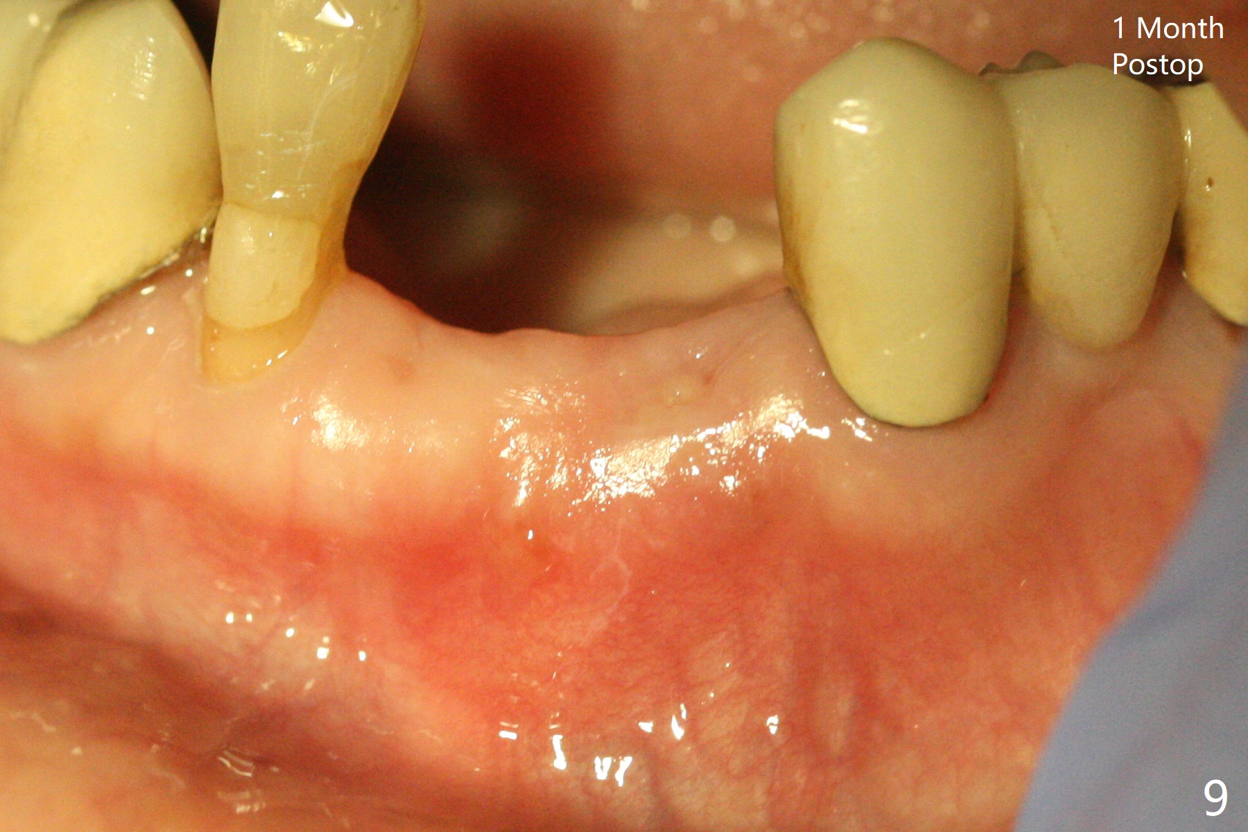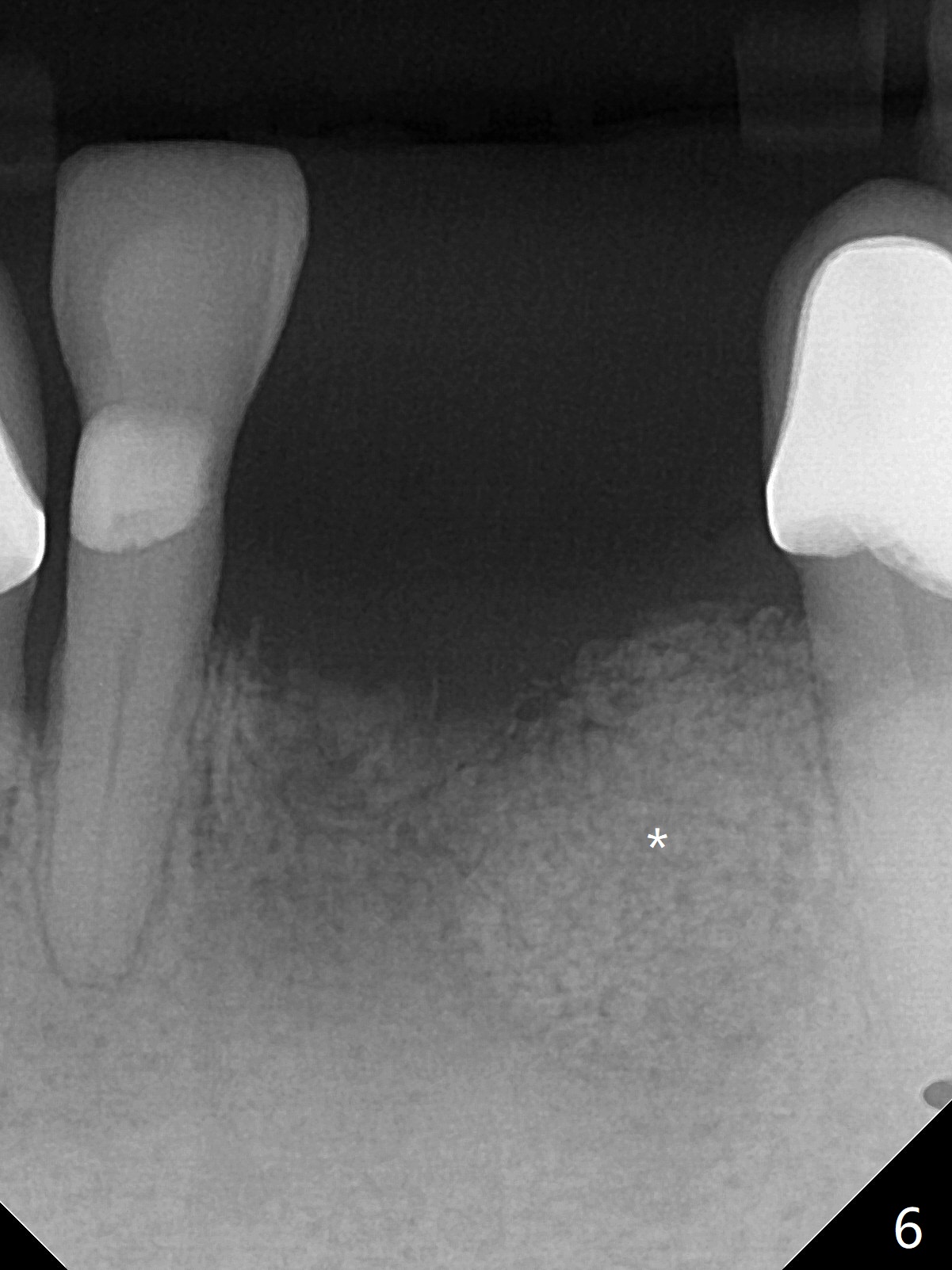 A 64-year-old woman requests extraction of the tooth #23 for lower partial (Fig.1). Since there are 2 buccal sinus tracks, another residual root is suspected (?). After shown loss of the buccal plate (Fig.2,3), the patient agrees to have socket preservation with allograft (Fig.5,6 *) and BioXclude (Fig.4 >). The suspected residual root is not explored considering the 2 sinus tracks being associated with the lesion of #23 (Fig.2,3). Cytoplast is not used because of time constraint and fear of gingival dehiscence associated with extensive dissection. In fact the sinus tracks shrink in a week, while the buccal plate remains bulging (Fig.7 *) and the socket heals (Fig.8 >). The buccal plate is flat (no swelling) 1 month postop (Fig.9).