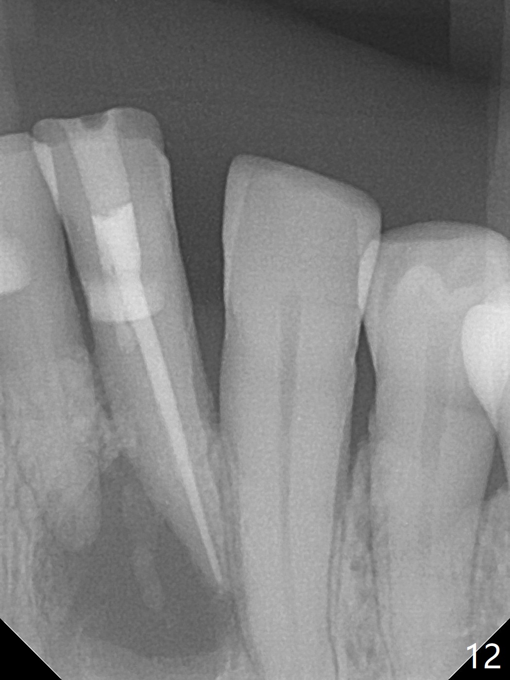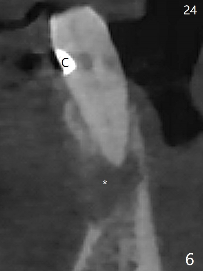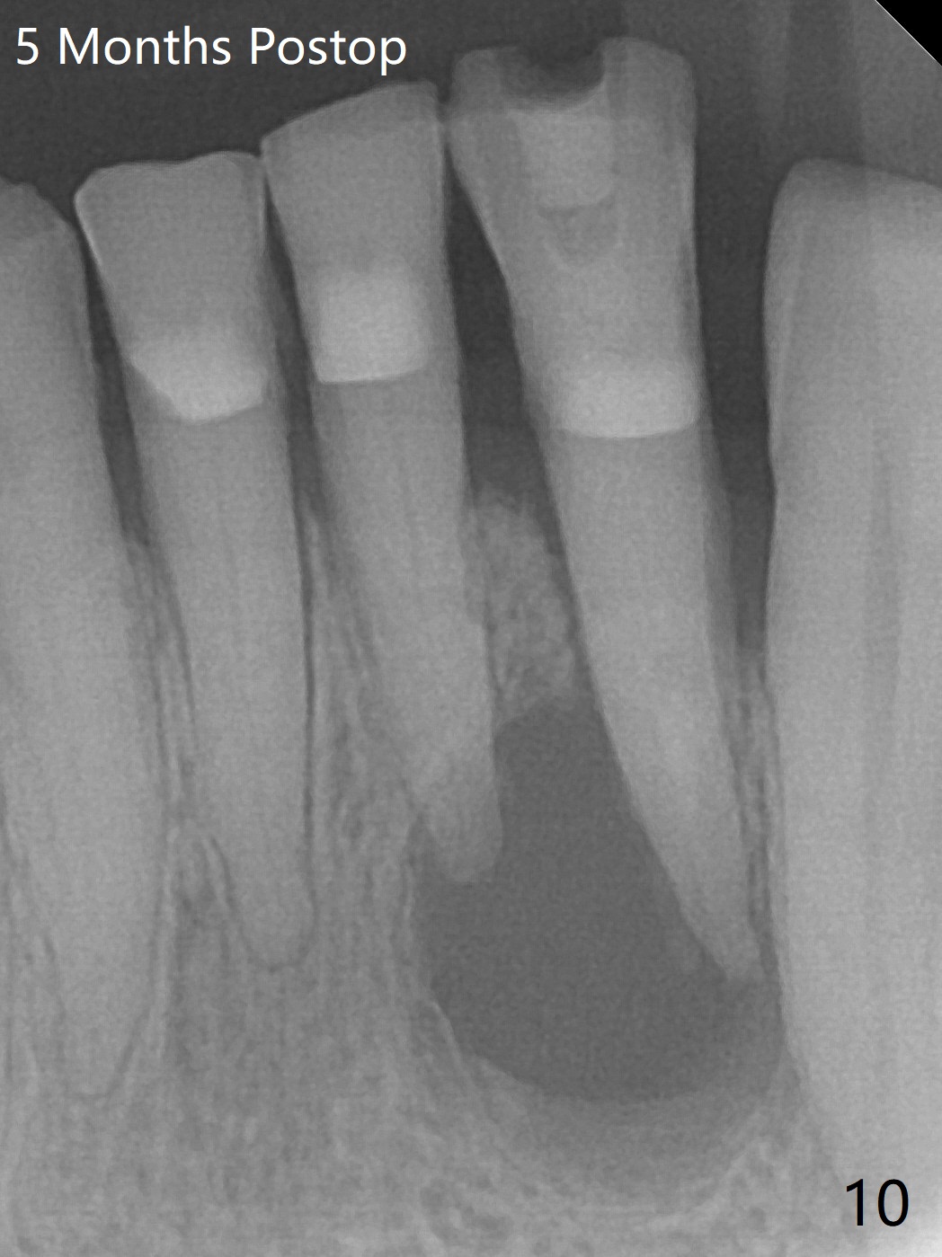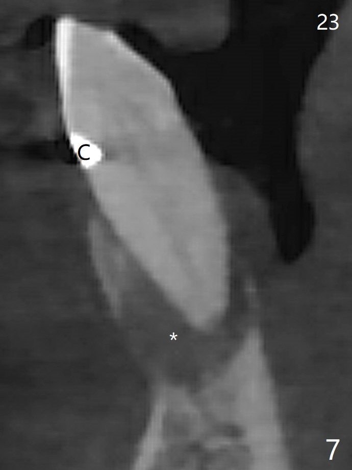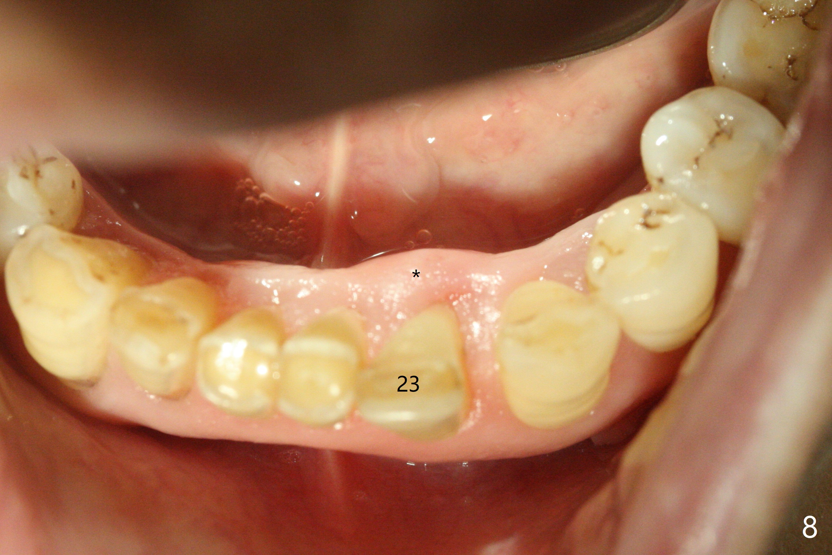 A 73-year-old woman has discomfort associated with #23 four months post Class V composite at #23-25 (Fig.1 C (*: Class V lesions)). Bone loss seems to be more severe lingually, especially at the crest (Fig.2 L). It appears that the apex of the tooth #24 is also in the large apical lesion (Fig.3). Class V composite is apparently continuous with the pulp at #25,24,23 (Fig.5-7). In contrast, Class V defect does not involve the pulp at #26 (Fig.4). If necrosis is confirmed clinically for #23 24 and 25, RCT will be conducted. Due to 7-day Amoxicillin taken for #3 implant, the patient feels that her tongue moves freely, as related to reduction in pain and swelling lingual to #23 (Fig.8 *). Endo ice test shows necrosis of #23 to 25. RCT is initiated at #23 (Fig.9) with buccal and lingual swelling. Endo may have to be at #24 with apicoectomy with PRF. The lingual swelling remains at #23, although there is no pain or purulent discharge 5 and 5.5 months post debridement (Fig.10,11). RCT is finished (Fig.12). Apicoectomy is pending with PRF. Less aggressive curettage will be done at #24 to maintain apical blood supply. Vitality tests have been done without conclusion.