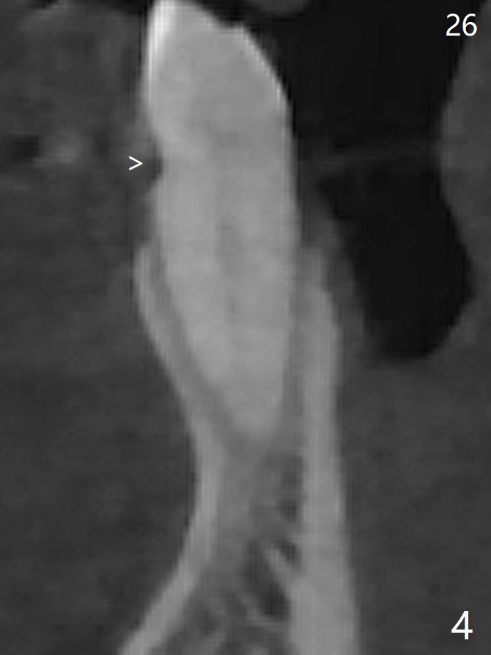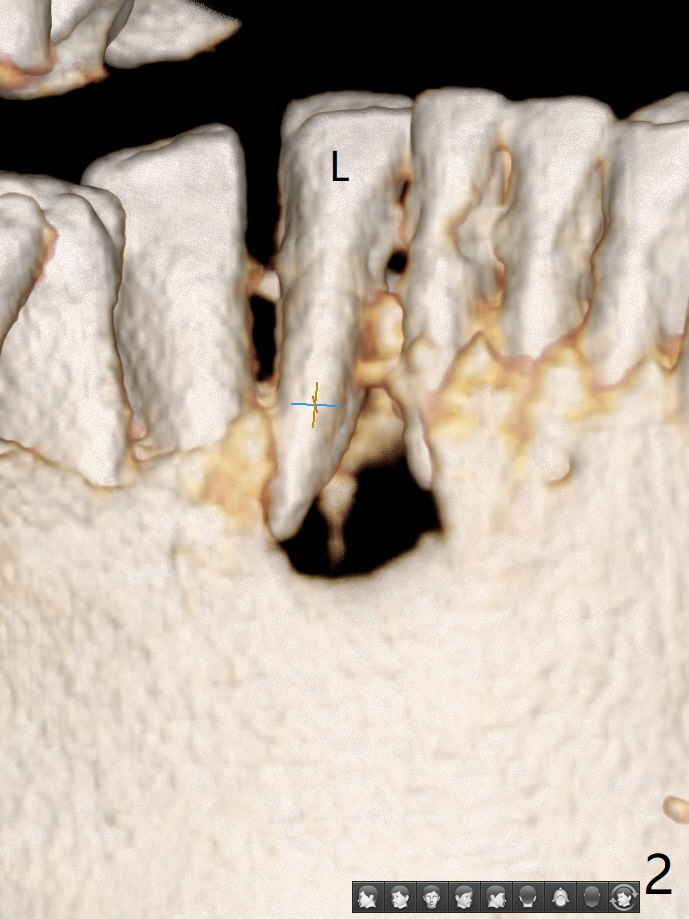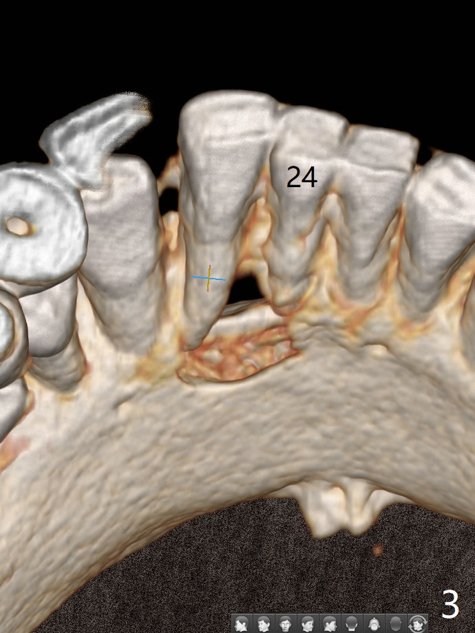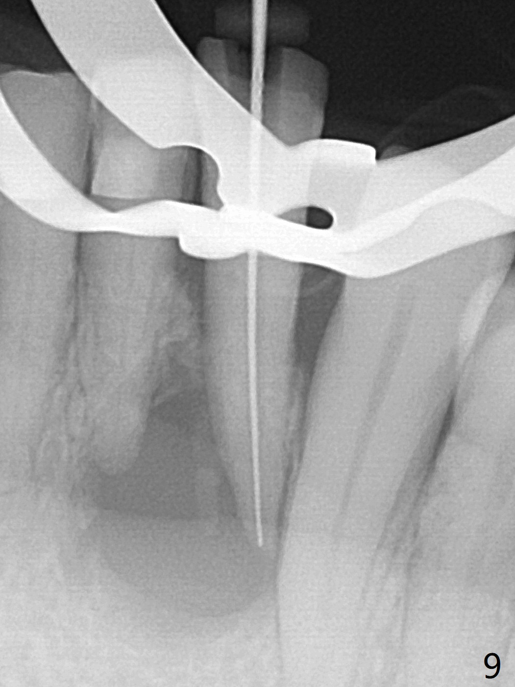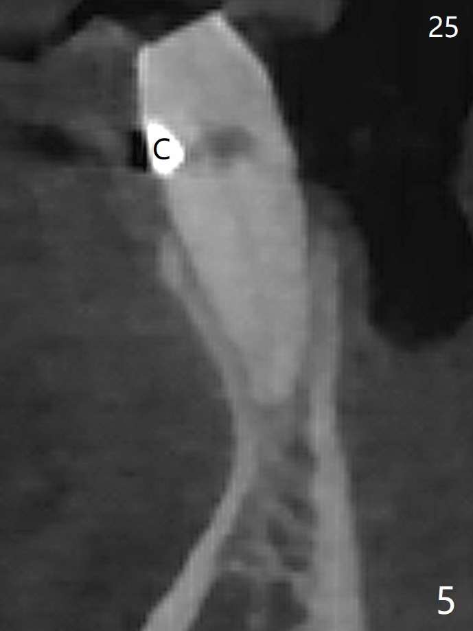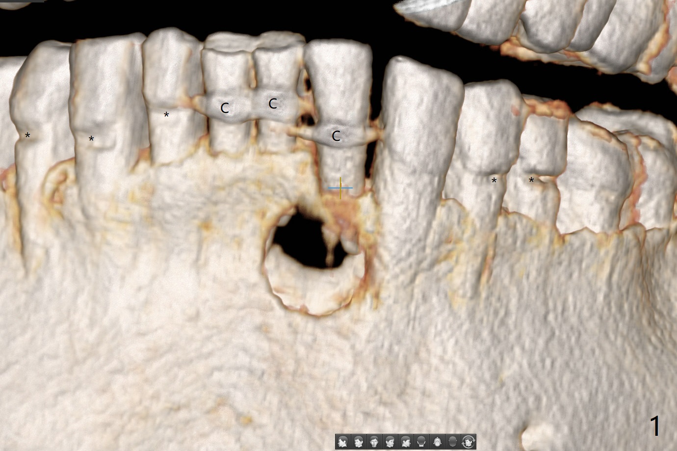 A 73-year-old woman has discomfort associated with #23 four months post Class V composite at #23-25 (Fig.1 C (*: Class V lesions)). Bone loss seems to be more severe lingually, especially at the crest (Fig.2 L). It appears that the apex of the tooth #24 is also in the large apical lesion (Fig.3). Class V composite is apparently continuous with the pulp at #25,24,23 (Fig.5-7). In contrast, Class V defect does not involve the pulp at #26 (Fig.4). If necrosis is confirmed clinically for #23 24 and 25, RCT will be conducted. Due to 7-day Amoxicillin taken for #3 implant, the patient feels that her tongue moves freely, as related to reduction in pain and swelling lingual to #23 (Fig.8 *). Endo ice test shows necrosis of #23 to 25. RCT is initiated at #23 (Fig.9) with buccal and lingual swelling. Endo may have to be at #24 with apicoectomy with PRF. The lingual swelling remains at #23, although there is no pain or purulent discharge 5 and 5.5 months post debridement (Fig.10,11). RCT is finished (Fig.12). Apicoectomy is pending with PRF. Less aggressive curettage will be done at #24 to maintain apical blood supply. Vitality tests have been done without conclusion.