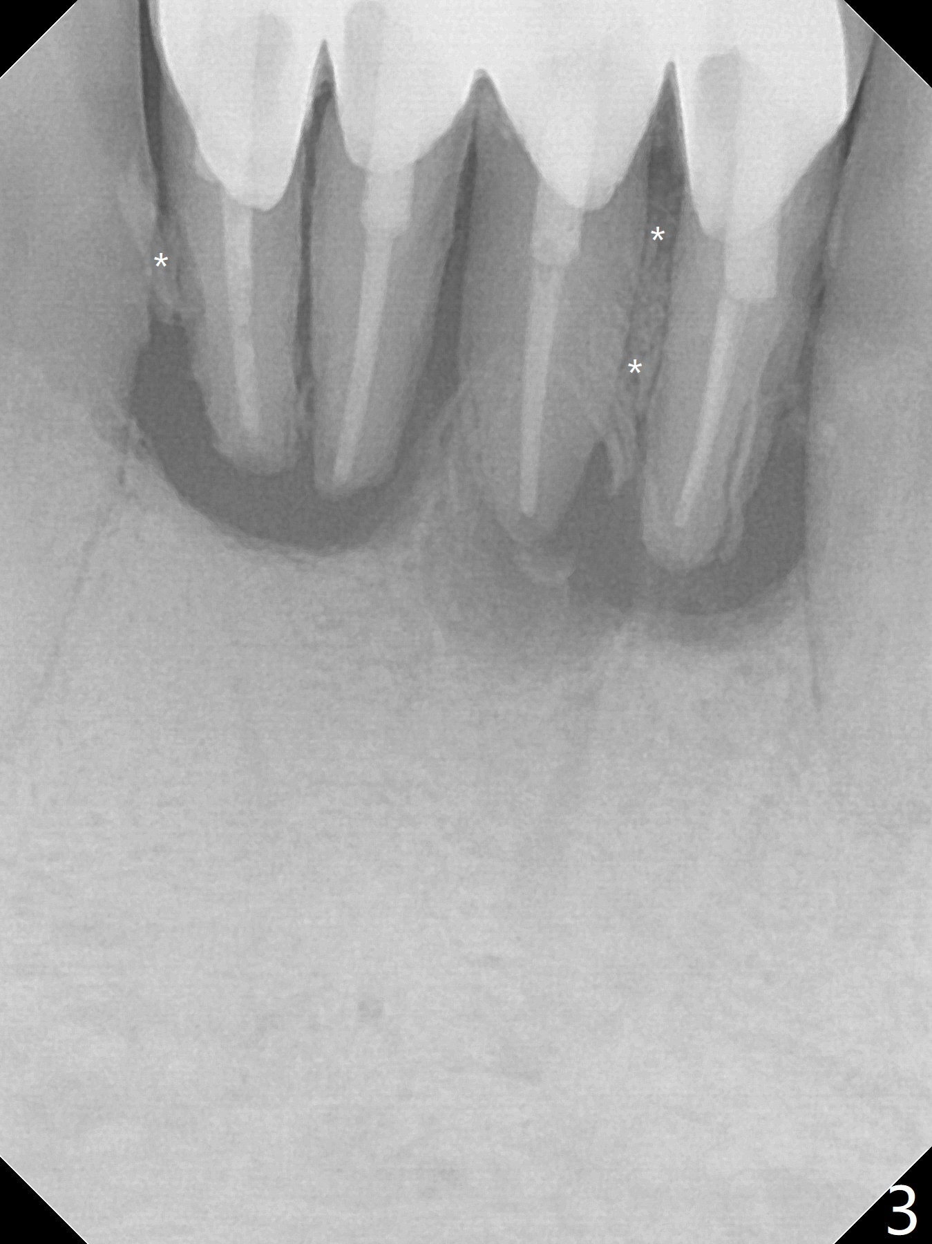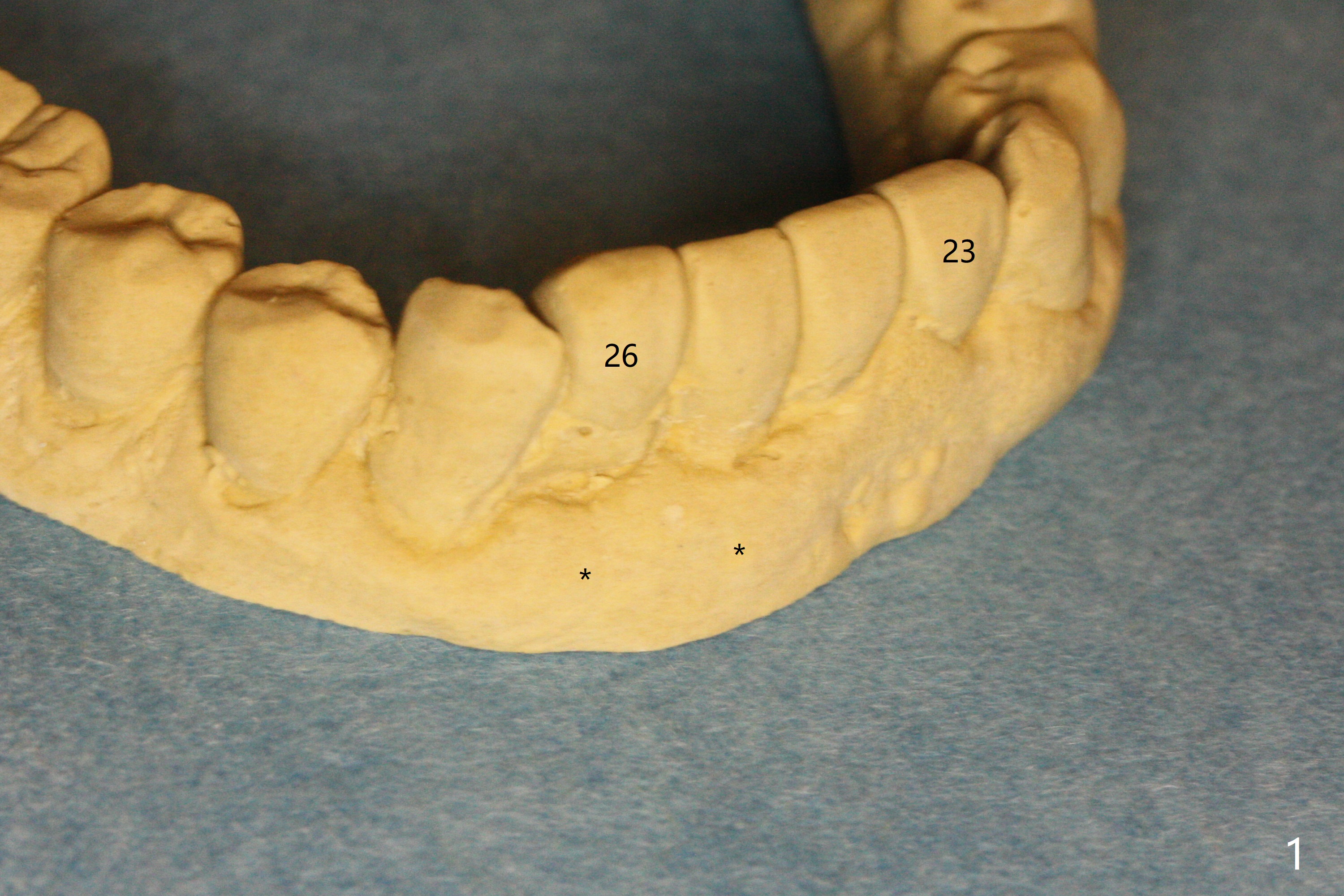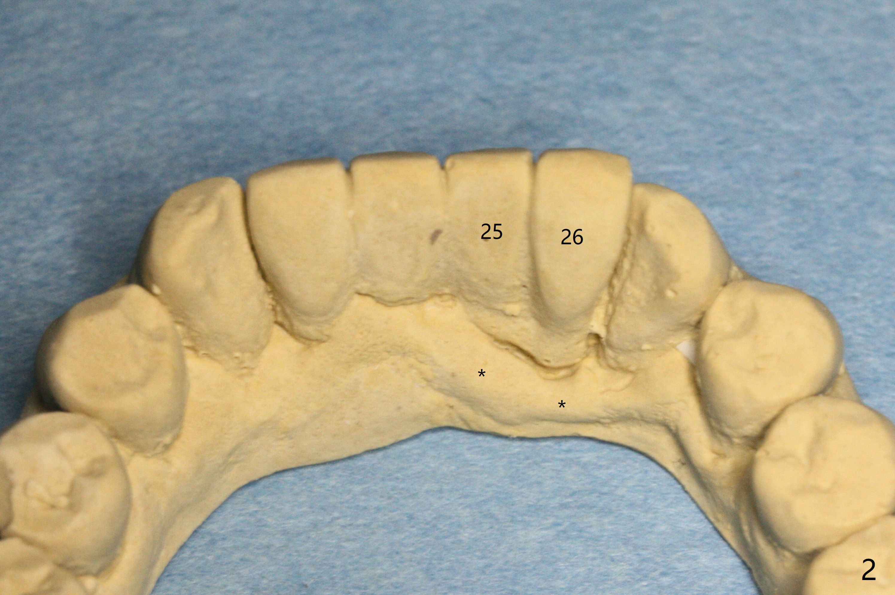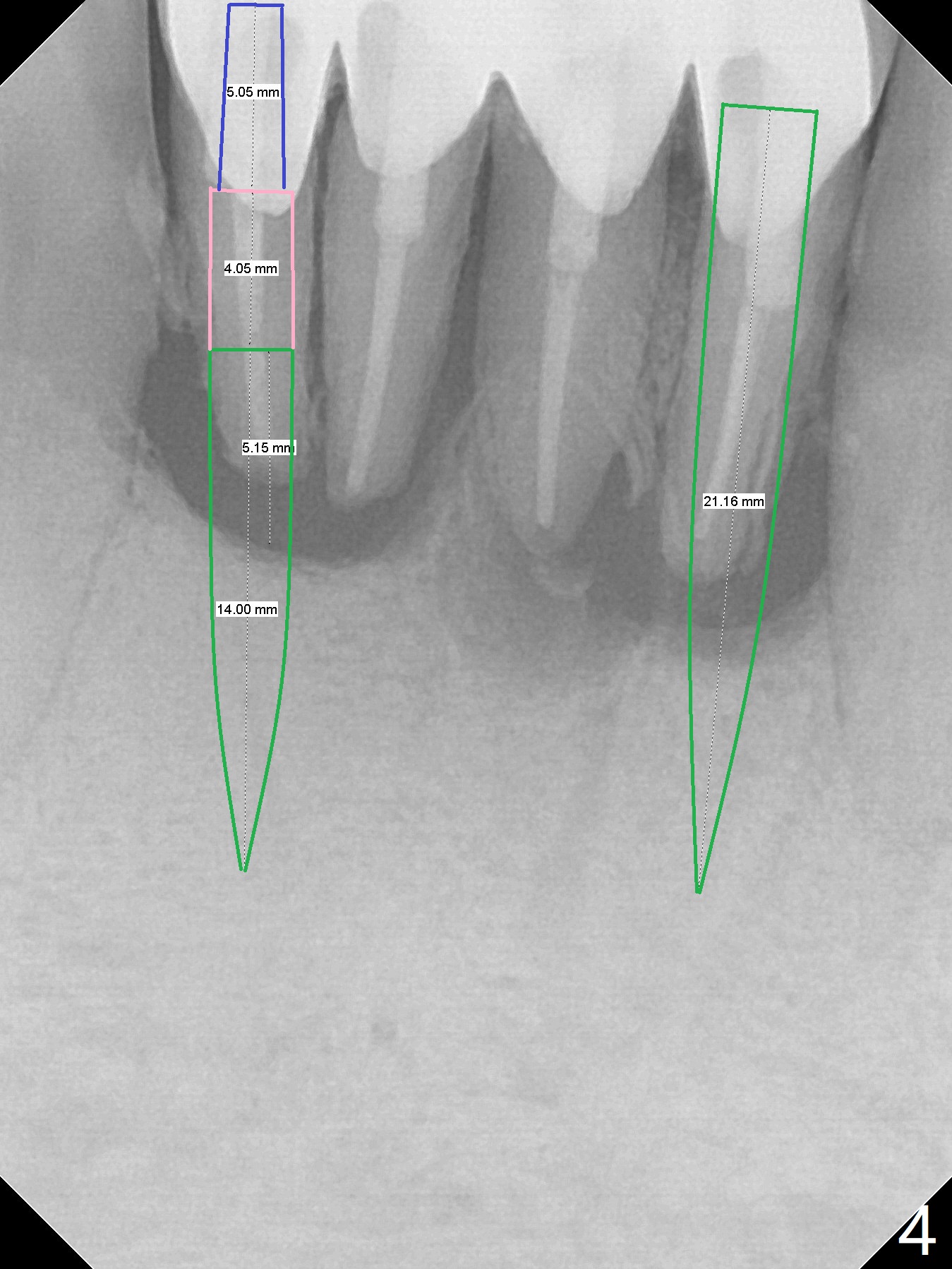 A 58-year-old man with splinted crowns at #23-26 has buccal abscess and lingual gingival recession at #25 and 26 (Fig.1,2). Large periapical radiolucency involves all of the 4 incisors (Fig.3). Note residual crestal bone between the incisors (*). It appears that a 1-piece implant with 4 mm cuff (Fig.4 pink) should be placed on the right side, while a longer 1-piece implant (23 mm) with shorter cuff (1.5 mm) on the left side. A provisional FPD will be fabricated from a stent.