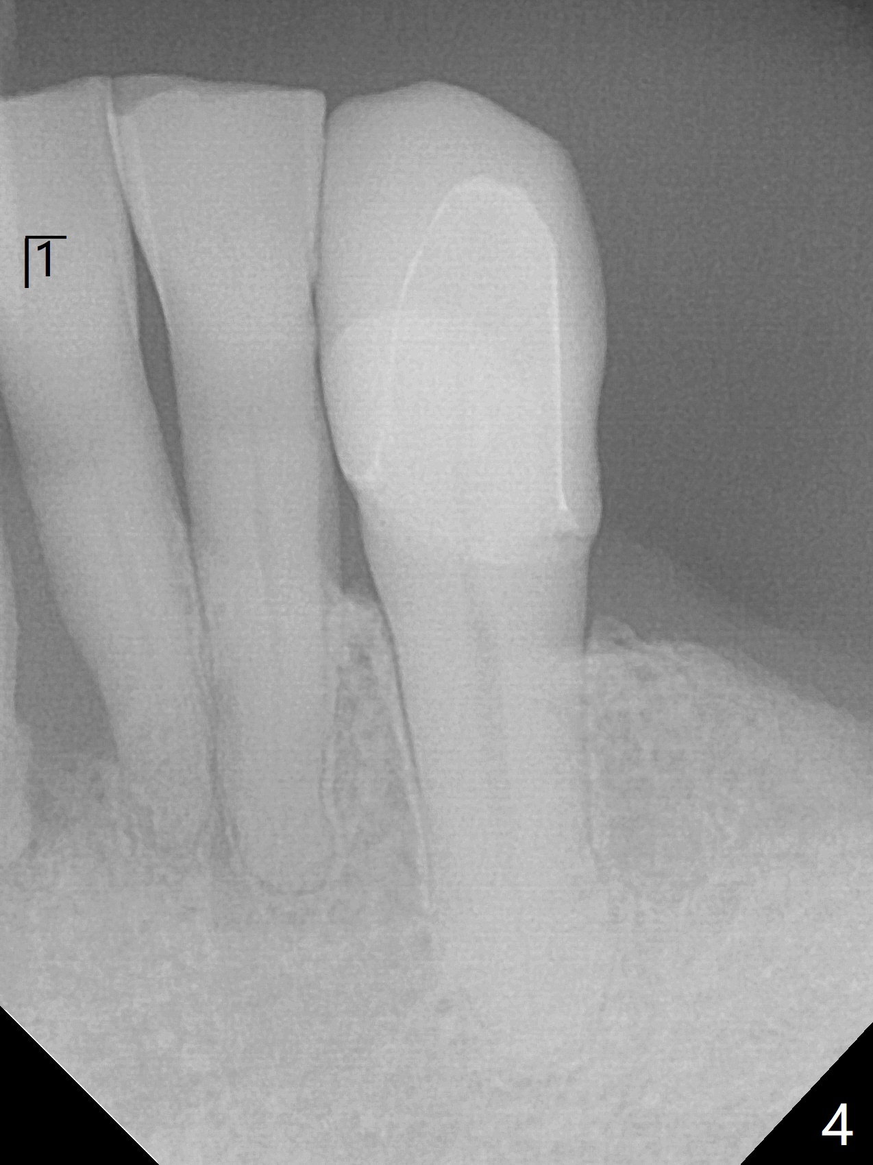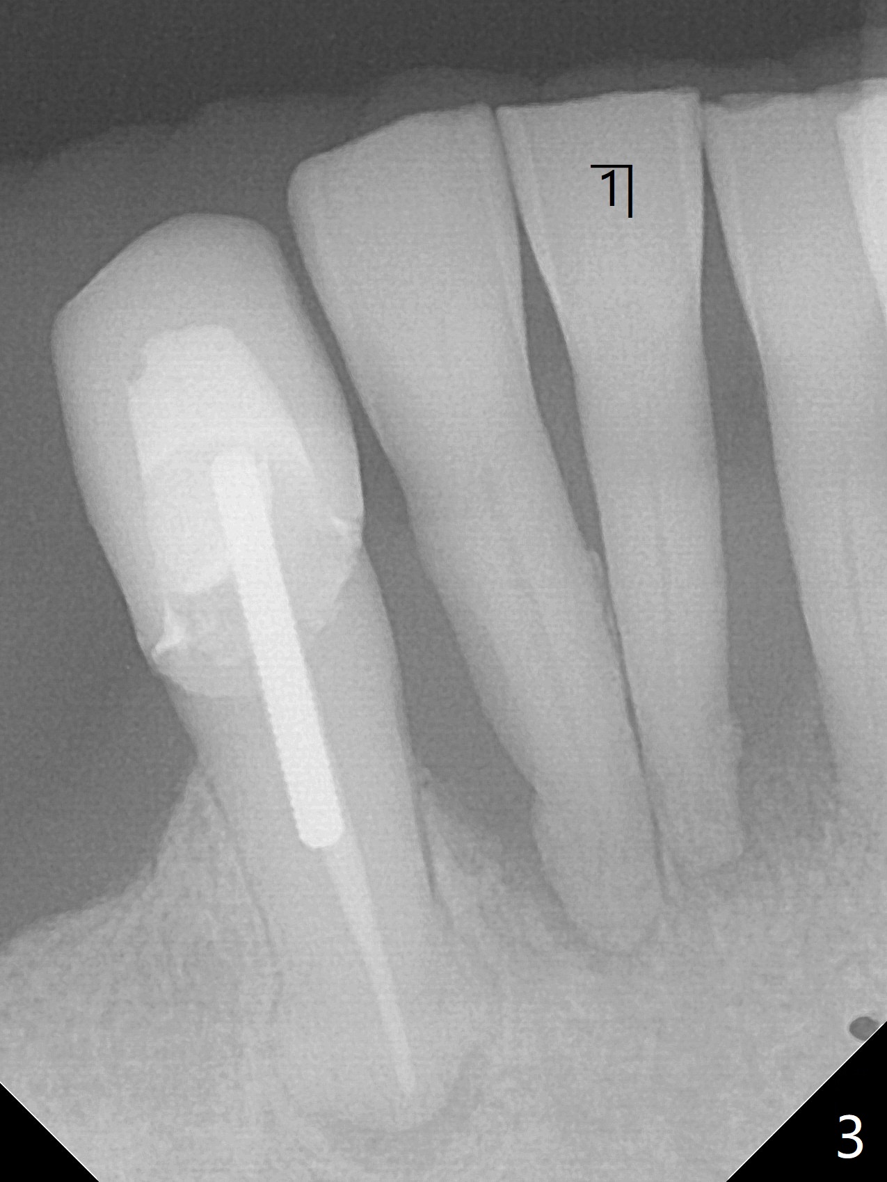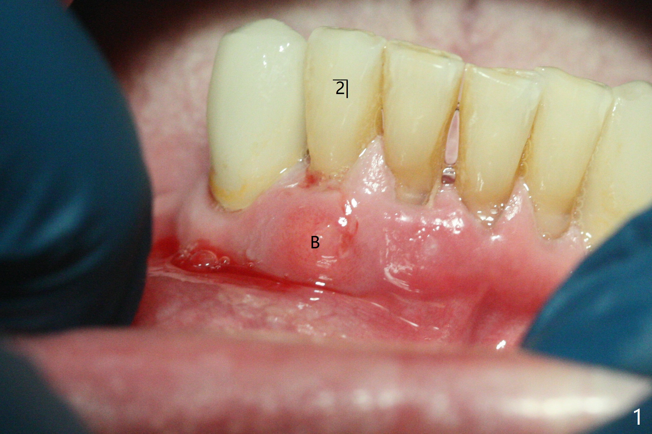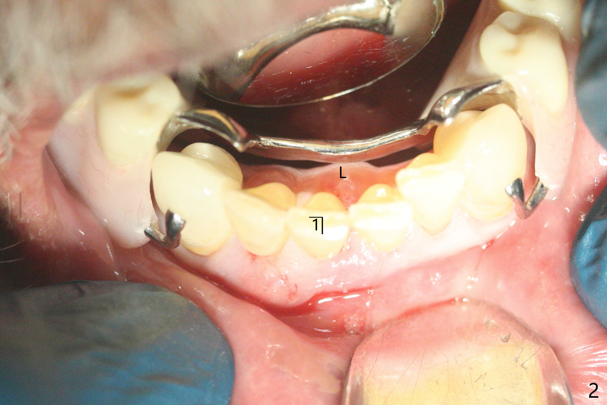 70岁男有上颌全口义齿,下颌局部义齿,后者由于右下切牙肿痛,松动无法戴入(图一至三),左下1骨质吸收严重,但是没有症状(图四)。理想治疗拔除右下1,2,即刻植牙,预防右下三断裂,不过病人没有思想准备,同意即刻植骨(图五,6个月吸收膜)。右下1舌侧,2颊侧脓肿(图一,二),拔牙时发现相应骨质缺损严重。四个月后在右下2植牙,做悬臂桥。当左下1不行时,做单个植牙,这样病人至少可以暂时使用局部托牙。
