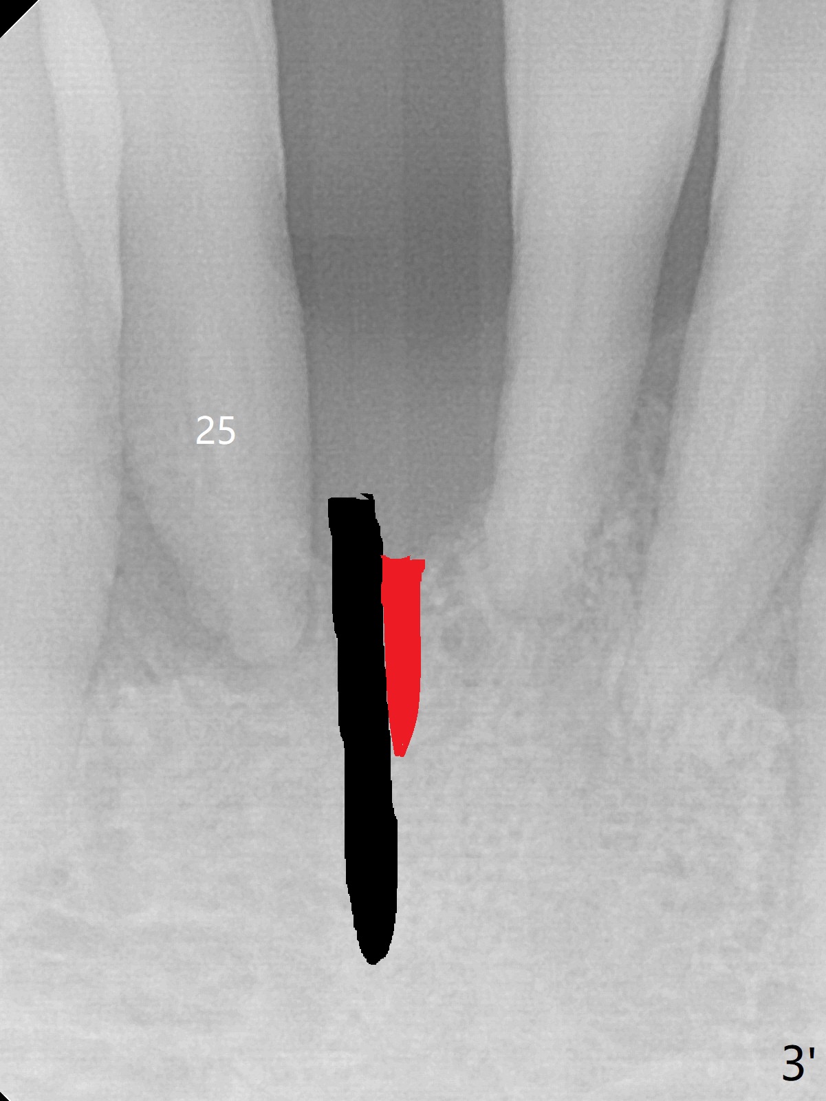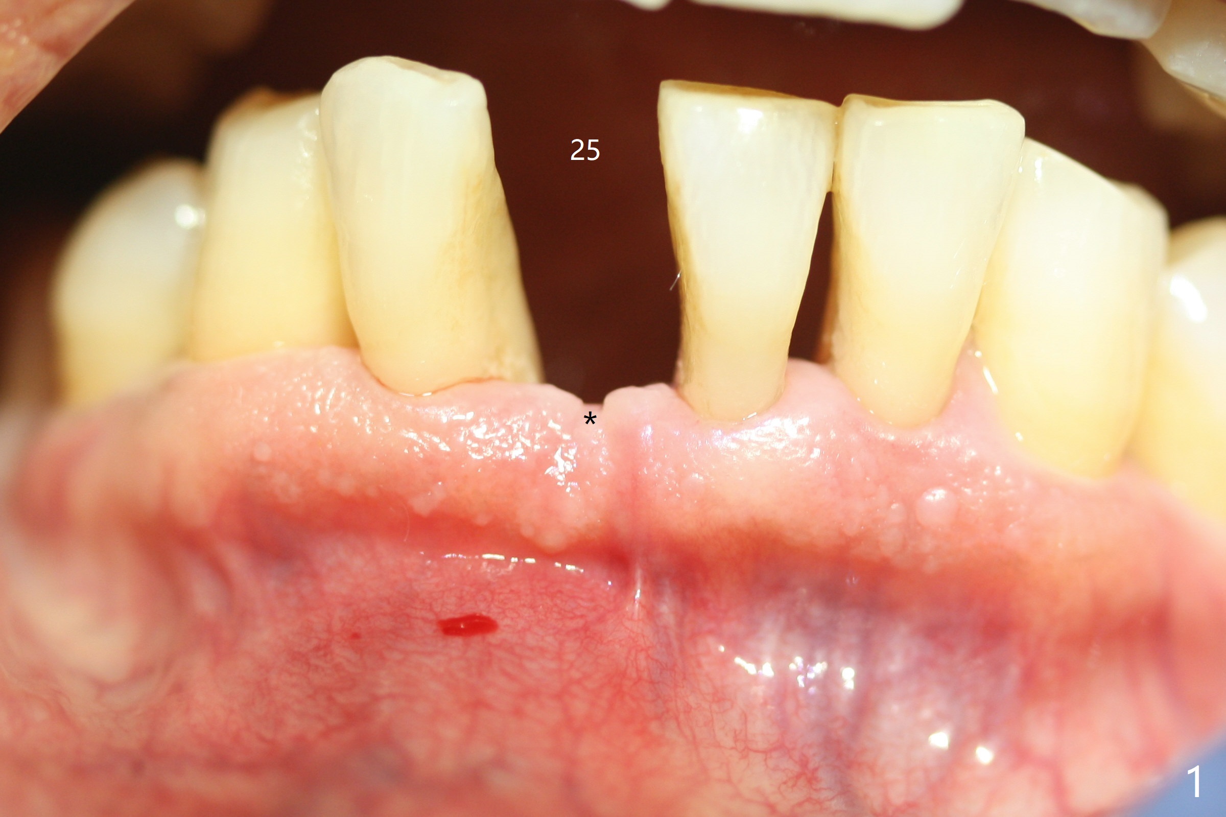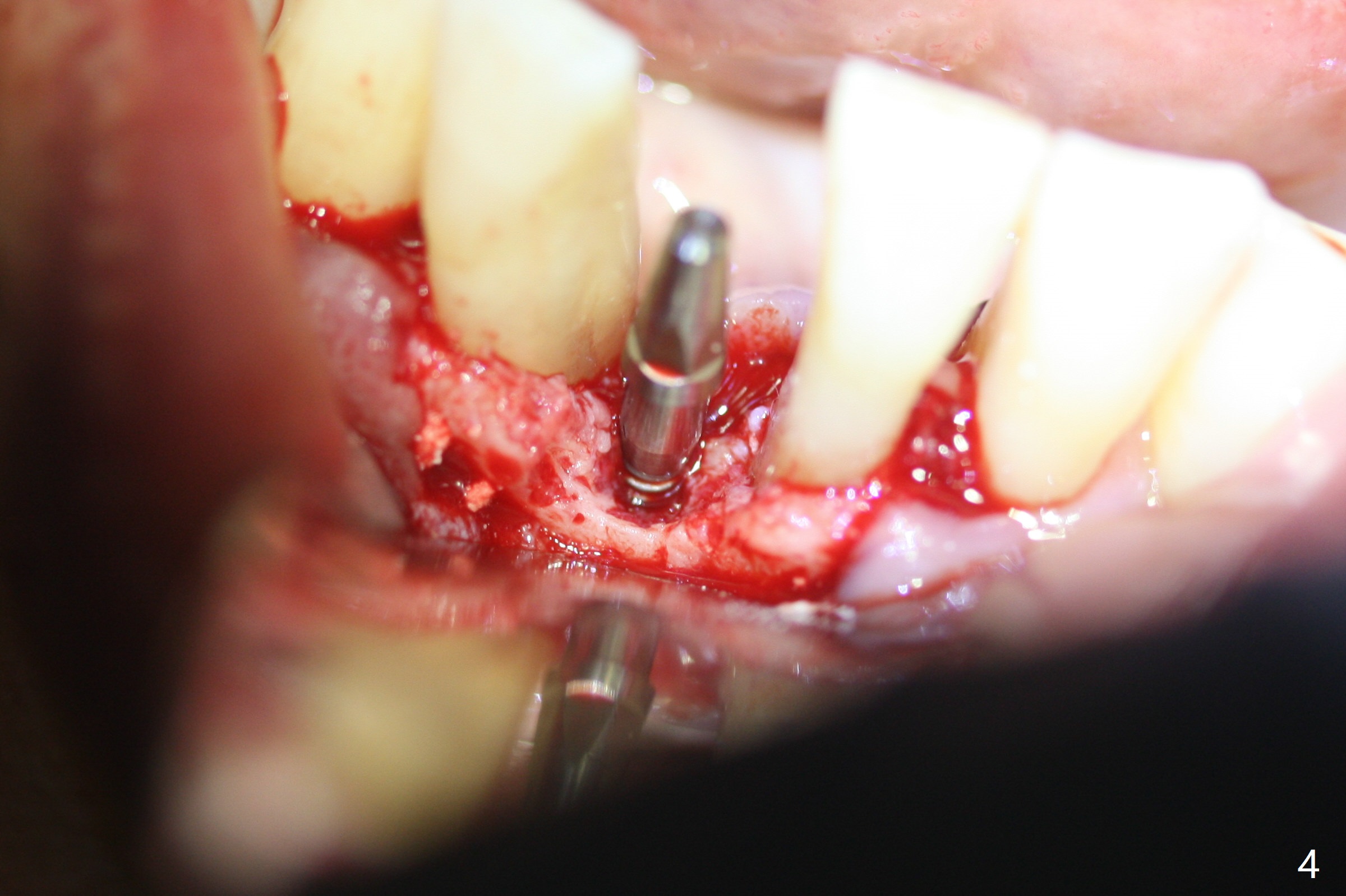 Out of financial concern, the patient does not agree to have the tooth #26 extracted. Due to atrophy of the most coronal ridge buccally at #25 (Fig.1,2 *), osteotomy is initiated difficult and distal (Fig.3). After 1.2 mm drill removal (Fig.3' black area), Lindamann bur is used to move the osteotomy mesial (red area). A 2x12(4) mm 1-piece implant is placed (Fig.4,5); the buccal defect is packed with allograft (Vanilla, .5-1 mm cancellous/cortical mixture, *). When the tooth #26 fails, a 2 mm implant will be placed (Fig.6 blue). Following abutment adjustment, a provisional is fabricated (Fig.7 P); note the lower incisal edges of #25 and 26, as compared to those of the neighboring teeth. To reduce occlusal trauma, the incisal edge of the tooth #26 has been decreased (Fig.5 open arrow). The implant threads seem not to be exposed 4 months postop (Fig.8), although the tooth #26 has mobility II.