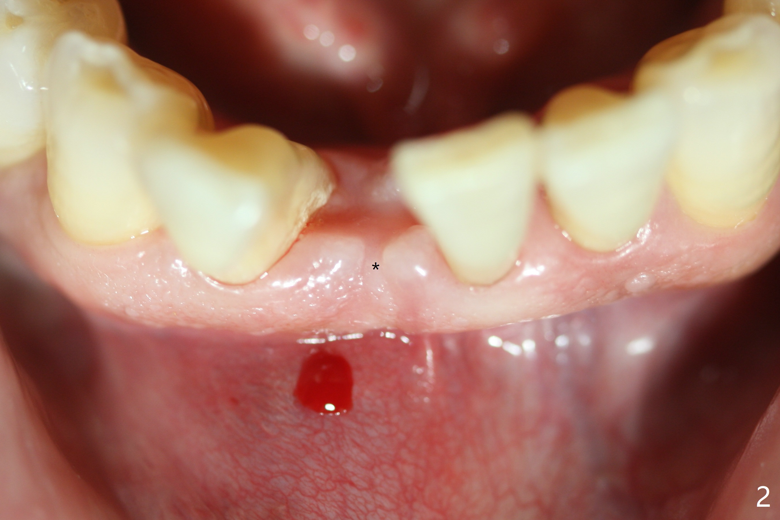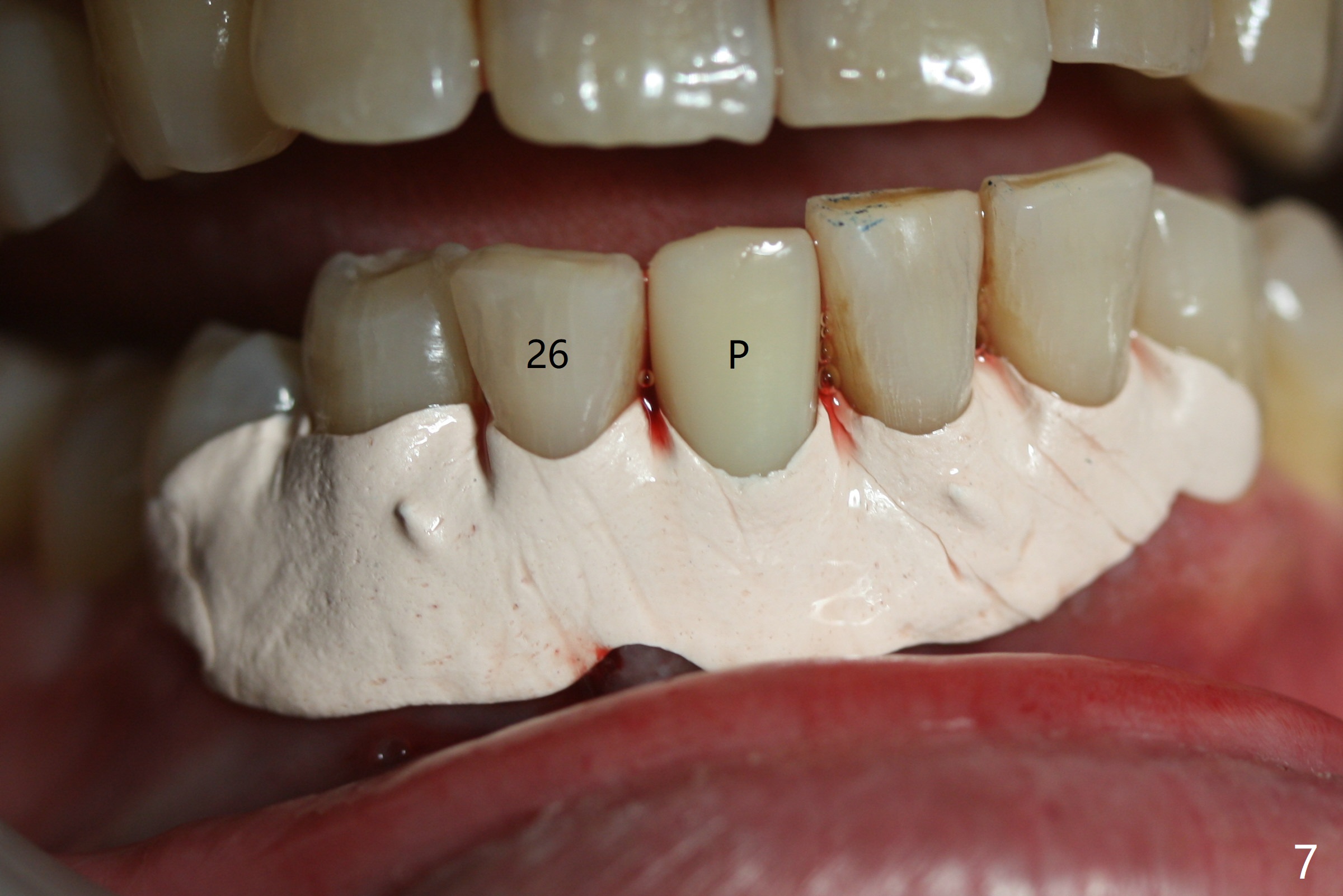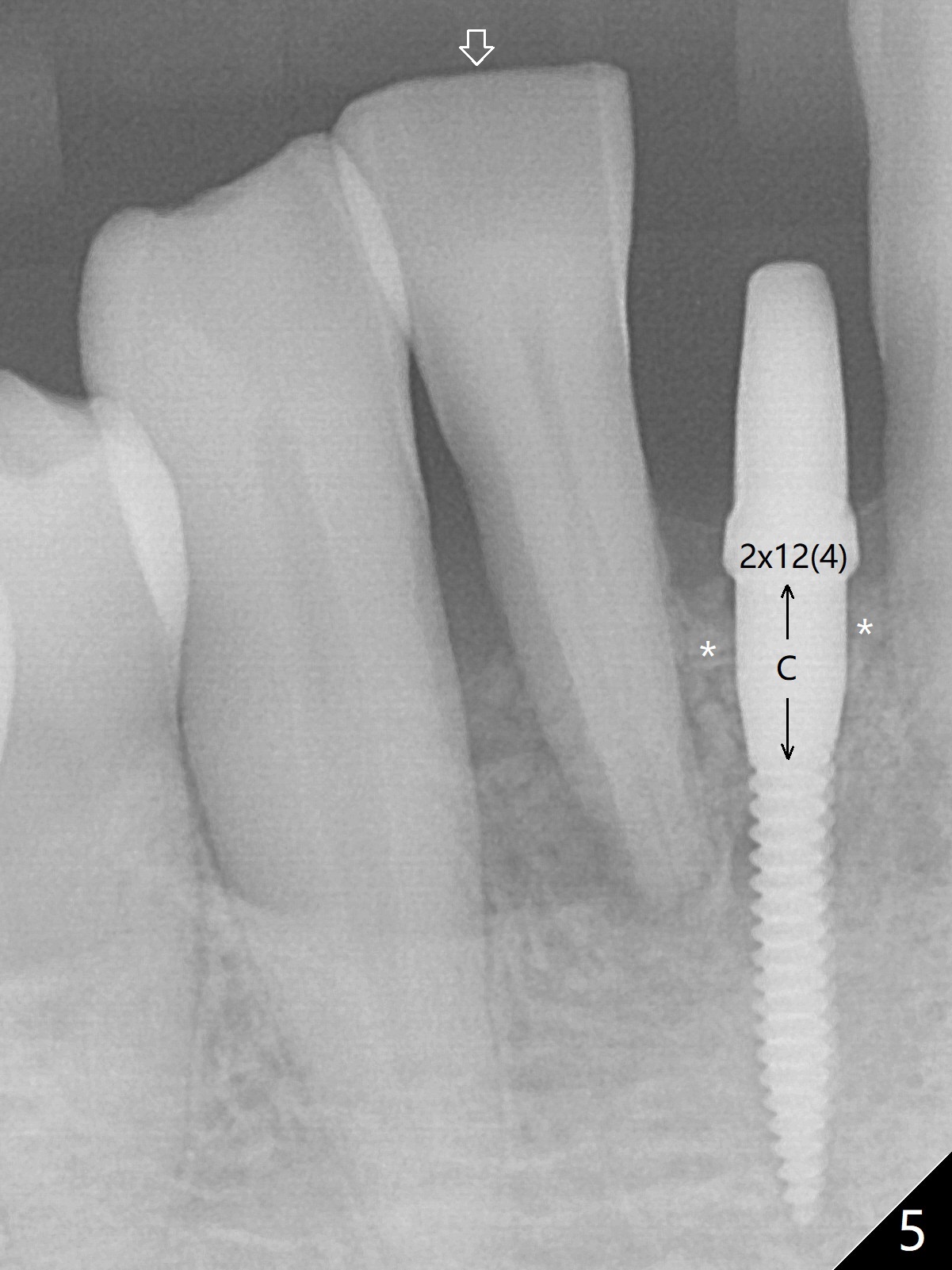 Out of financial concern, the patient does not agree to have the tooth #26 extracted. Due to atrophy of the most coronal ridge buccally at #25 (Fig.1,2 *), osteotomy is initiated difficult and distal (Fig.3). After 1.2 mm drill removal (Fig.3' black area), Lindamann bur is used to move the osteotomy mesial (red area). A 2x12(4) mm 1-piece implant is placed (Fig.4,5); the buccal defect is packed with allograft (Vanilla, .5-1 mm cancellous/cortical mixture, *). When the tooth #26 fails, a 2 mm implant will be placed (Fig.6 blue). Following abutment adjustment, a provisional is fabricated (Fig.7 P); note the lower incisal edges of #25 and 26, as compared to those of the neighboring teeth. To reduce occlusal trauma, the incisal edge of the tooth #26 has been decreased (Fig.5 open arrow). The implant threads seem not to be exposed 4 months postop (Fig.8), although the tooth #26 has mobility II.