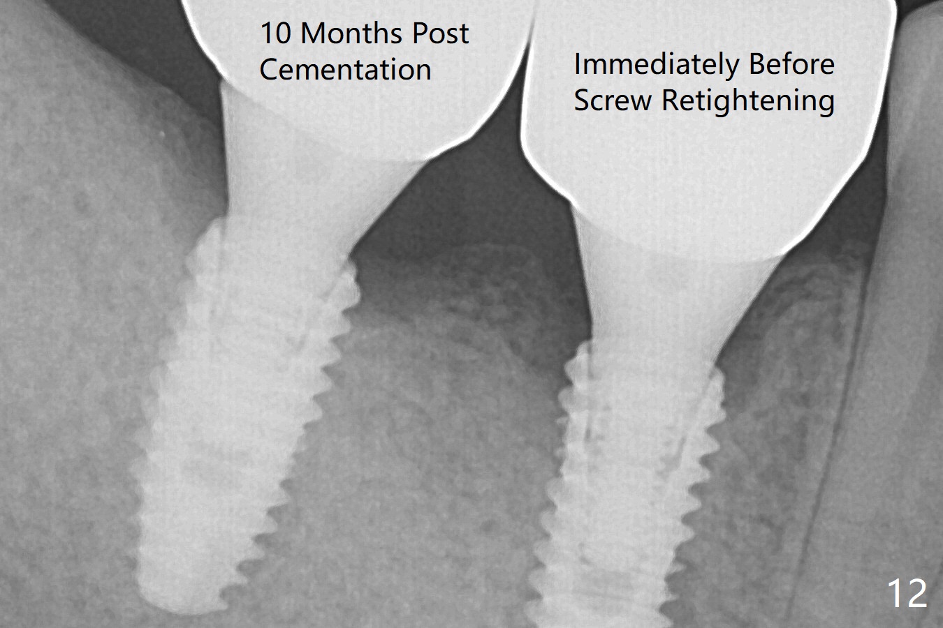 There is mild crestal bone loss at #30 and 31 ten months post cementation (Fig.12). Crown/implant ratio is the basis for screw loosening.