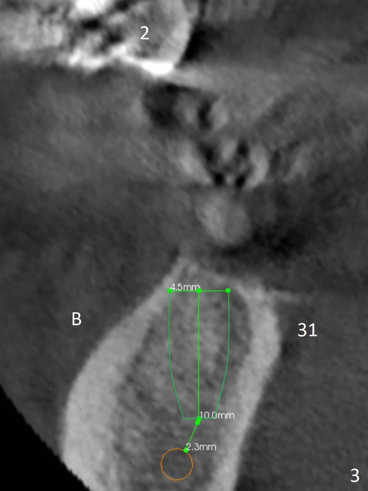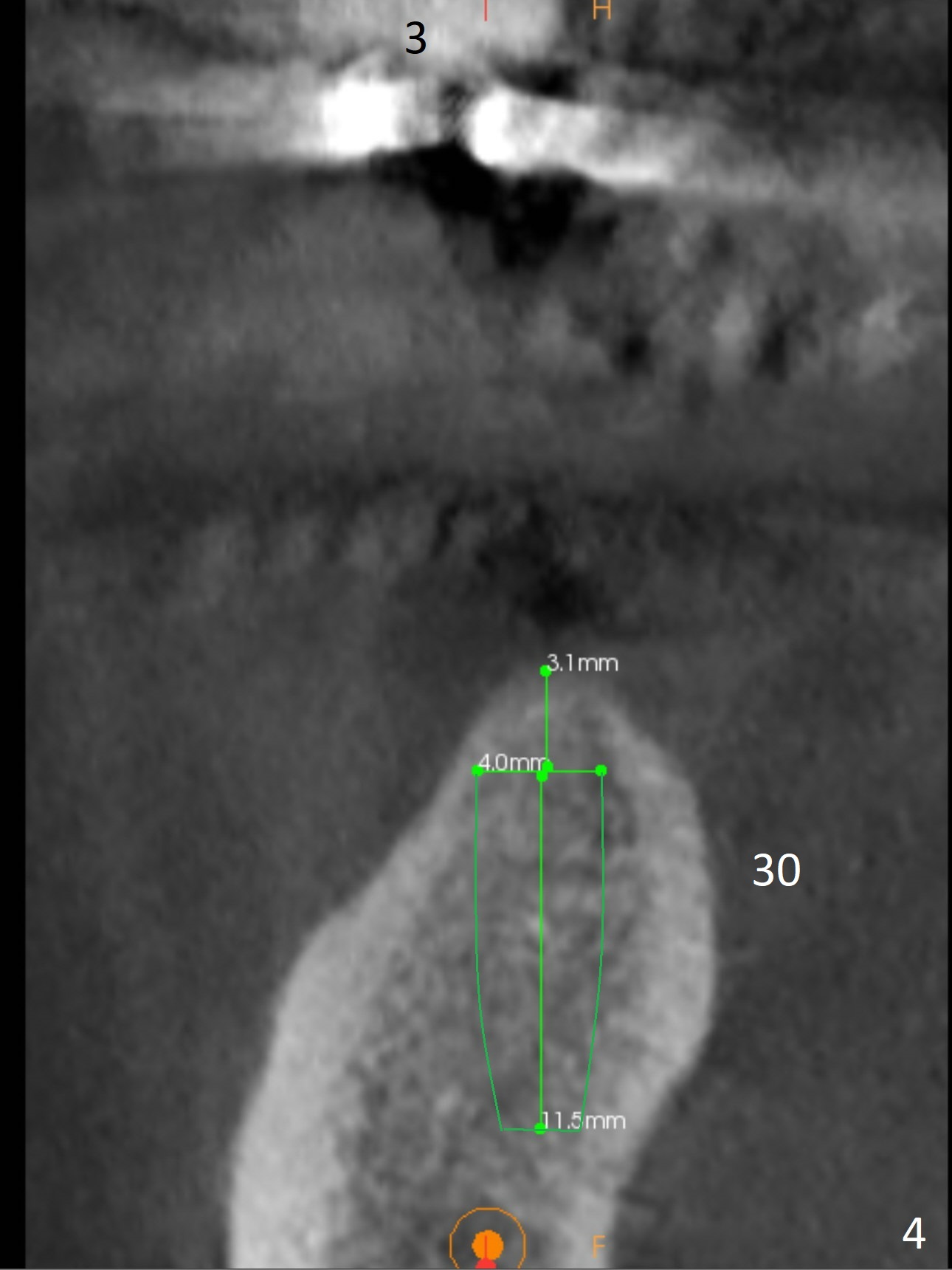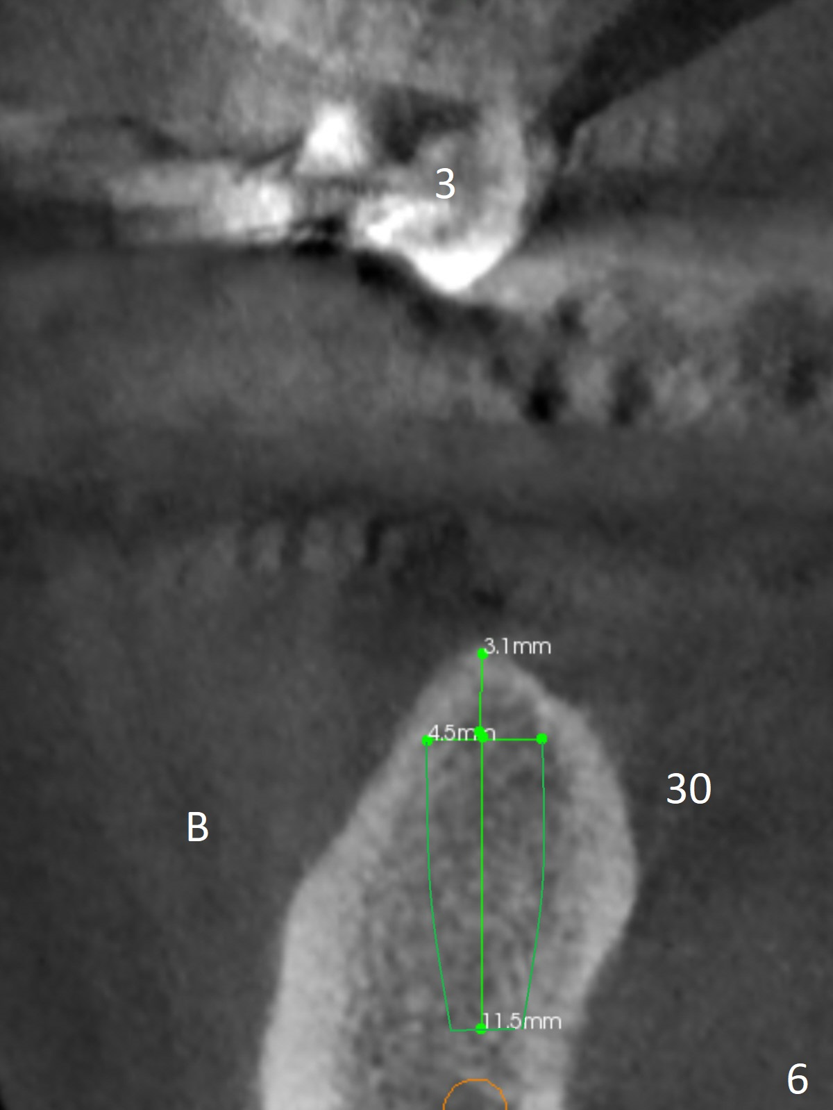A healthy 37-year-old woman has 3 missing lower molars (Fig.1 panoramic view from CBCT). She has had implants at #8 and 10. The bone height for these molars is shown in Fig.2. The 1st molar ridges appear to be narrow (Fig.4,5,6), as compared to that of the 2nd molar (Fig.3 (B: buccal)). Ridge reduction seems to be necessary for the 1st molar sites prior to implant (green area) placement or deeper osteotomy.